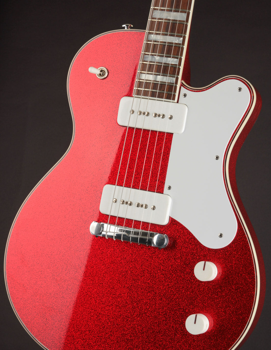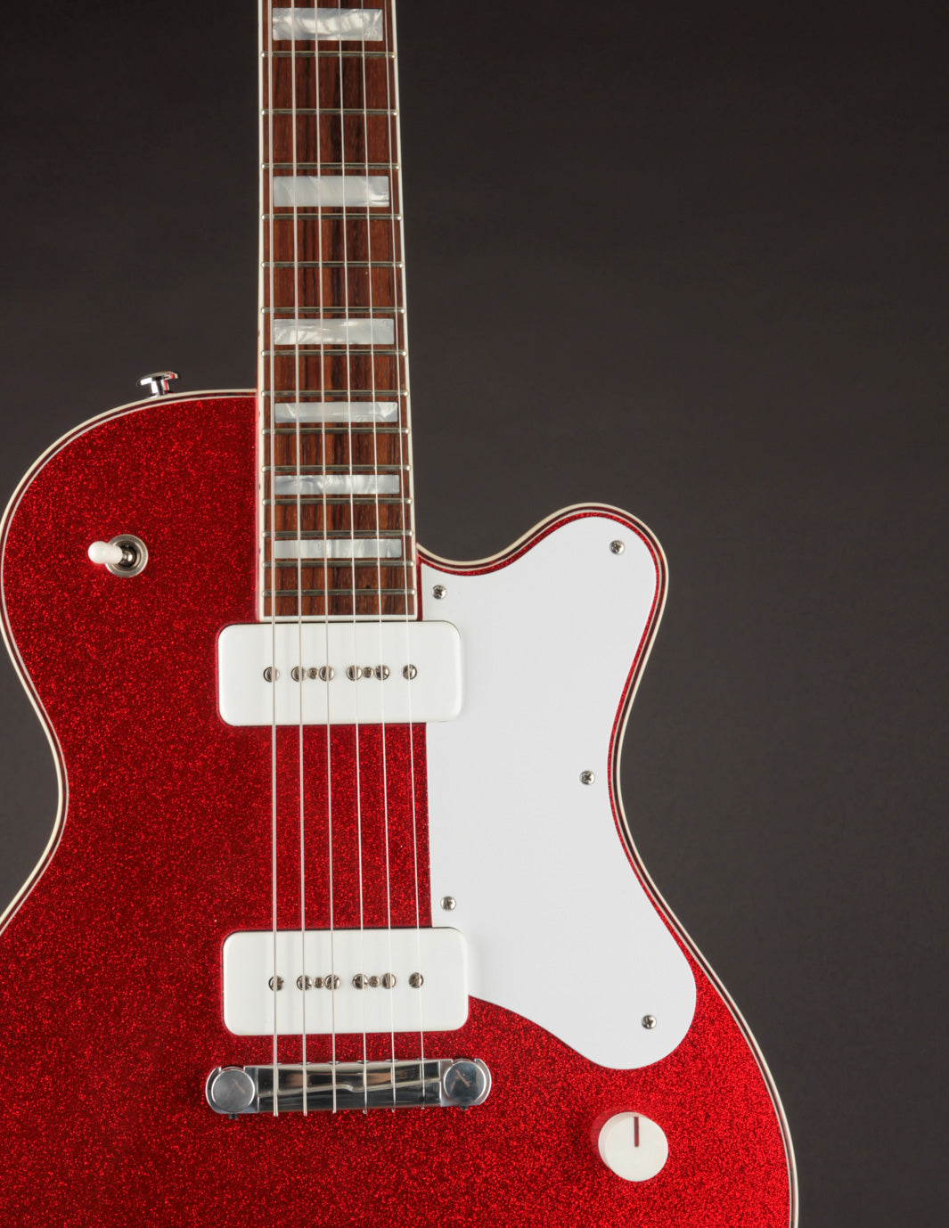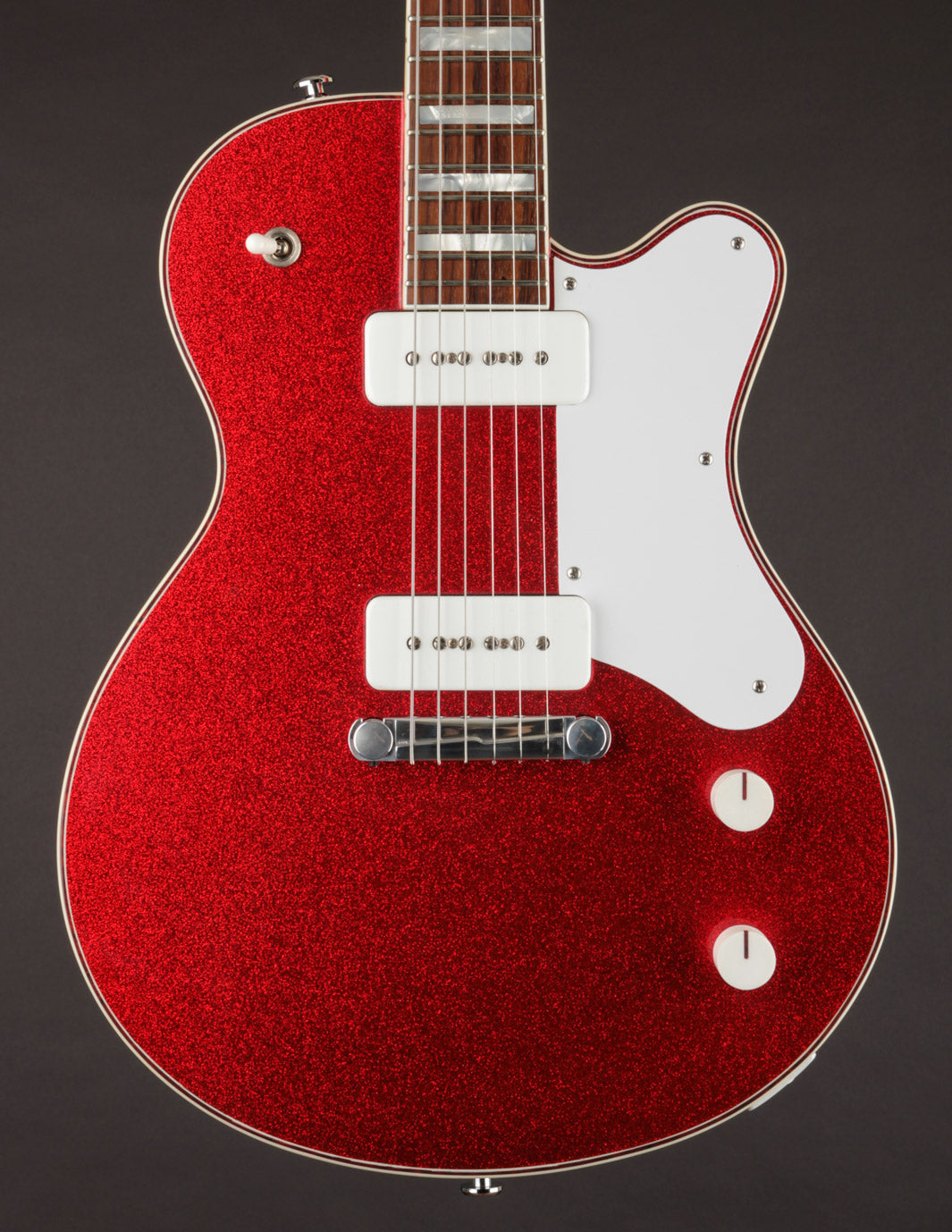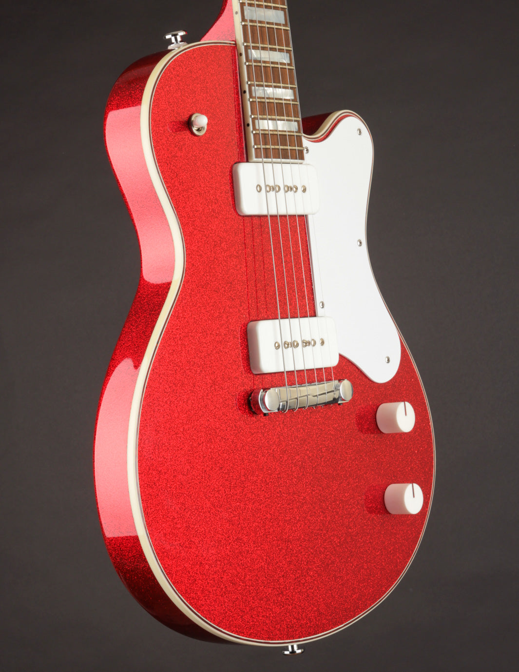 Coming in at 7lbs 6oz, this guitar is exceptionally resonant and alive. The lightweight mahogany body (w/maple cap) and mahogany neck set the foundation for a pair of killer Wolfetone P90s that provide all of the great clarity, snap, and growl one would expect from this style of pickup. A single volume and tone circuit with a 3-way switch keeps things simple and familiar, and the lightweight Heatley aluminum wraparound bridge is incredibly well engineered.