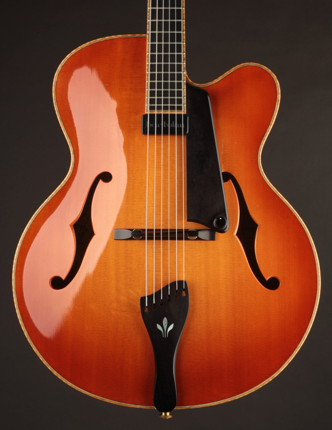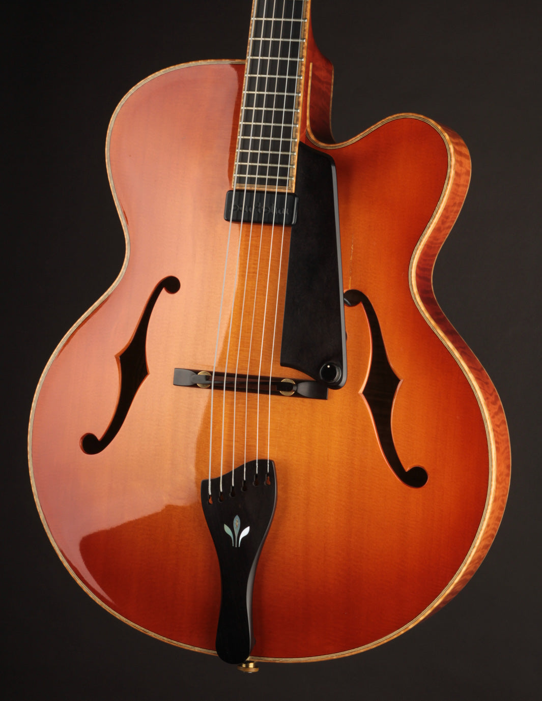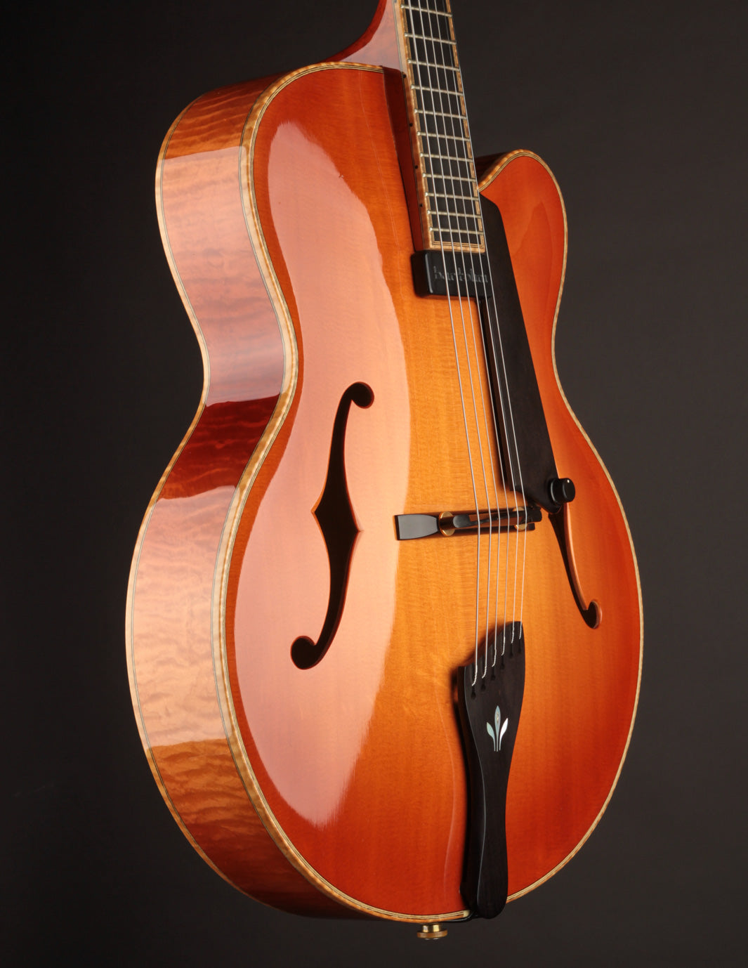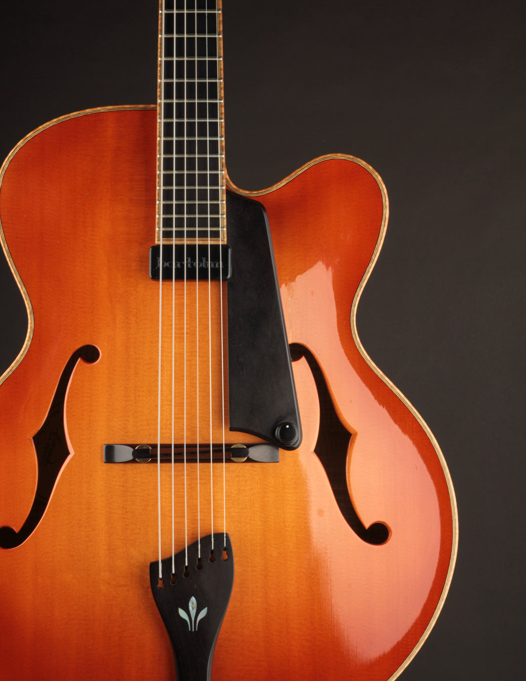 Plugged in, it offers a warm, articulate voice with plenty of headroom thanks to the 17" body and floating Bartolini pickup. There's richness in the lows, a dry and focused midrange, and a top-end that sounds sweet without ever getting brittle. Whether you're comping chords or playing lyrical single-note lines, this Monarch responds with clarity and nuance.