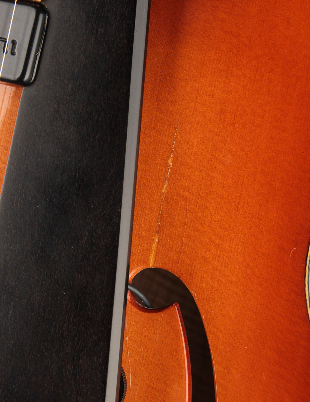 The top exhibits a few small indentions and a repaired crack (south of the pickguard / f-hole area) / back and sides also show a few shallow/small indentations (one scratch on the side that rests on your thigh) / light pick marks on the guard (only seen when really looking) / no fret wear