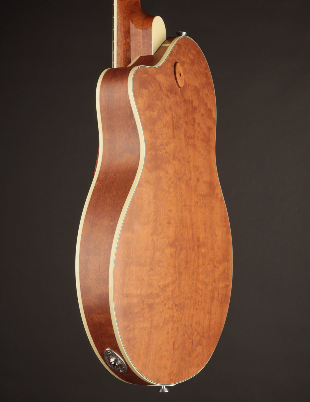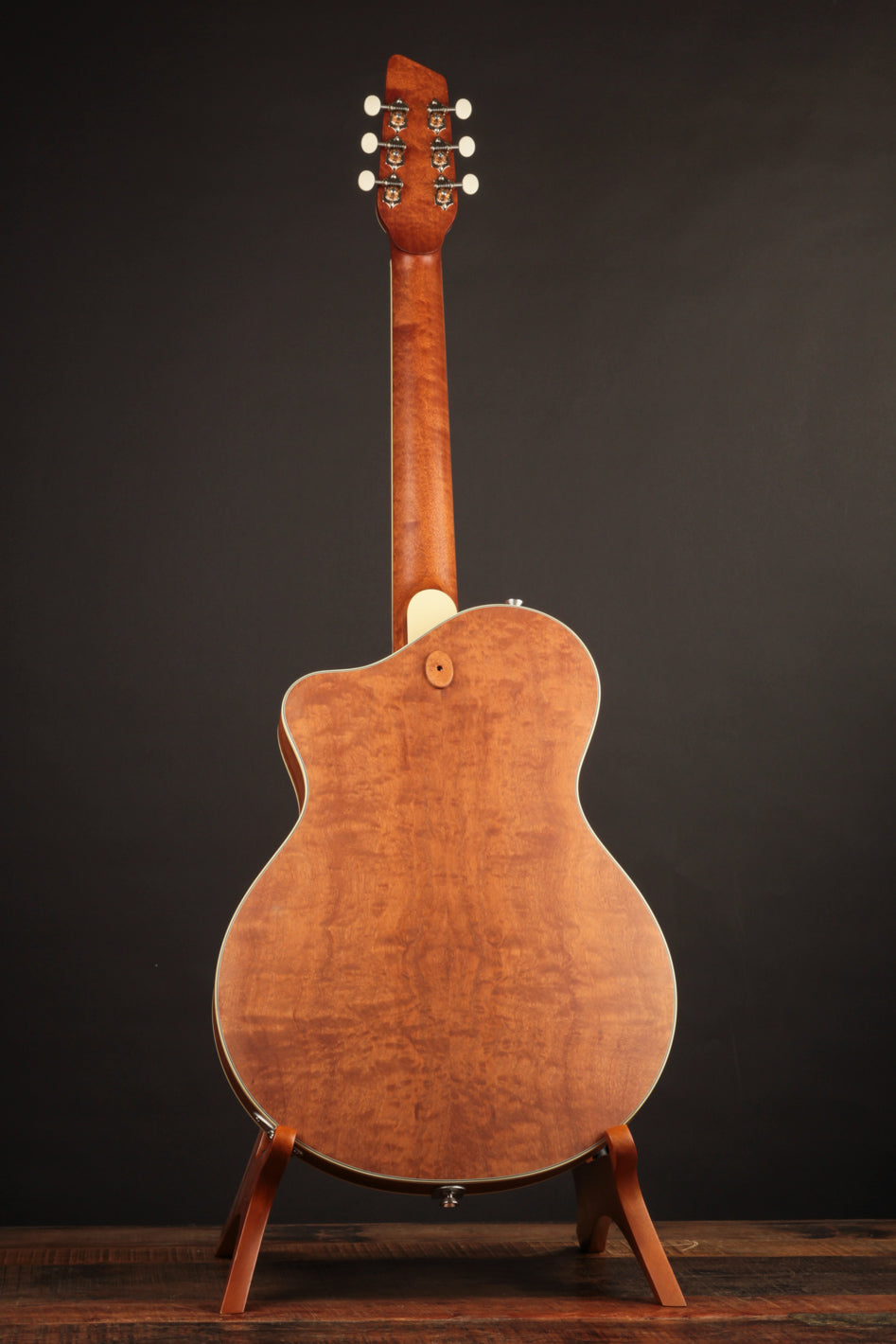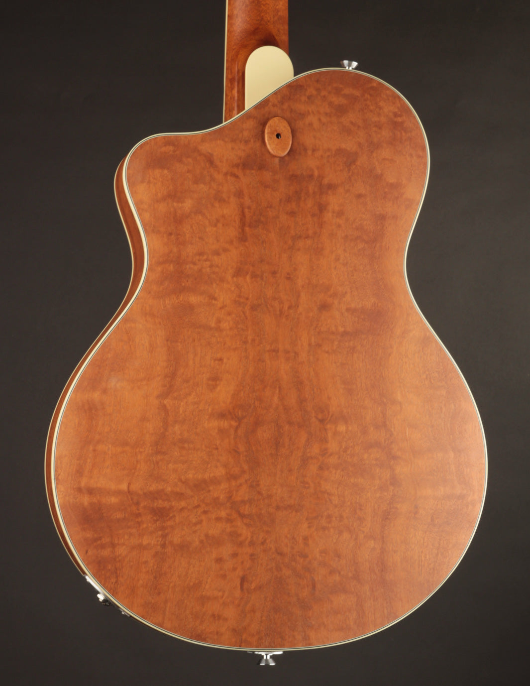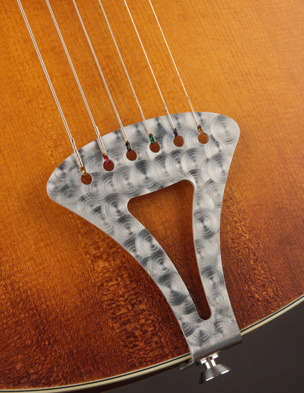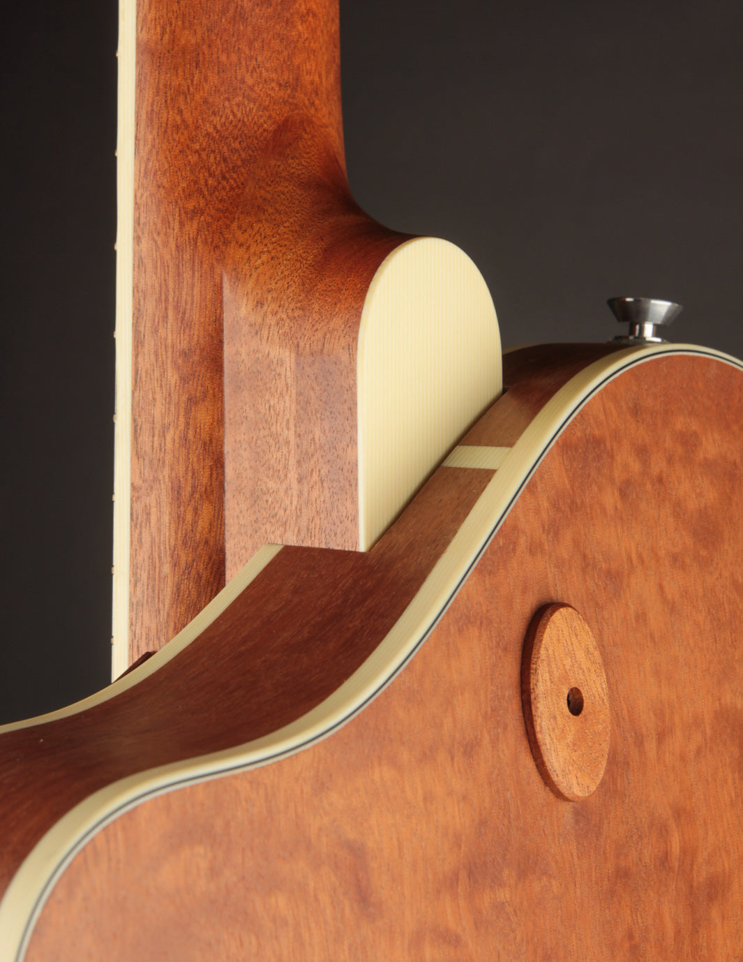 "The plates and side geometry are radically shaped on 5’ radius hemispheres, giving the instrument a striking appearance, with the side depth ranging from a full 3” to a mere 1.25”. This shape is naturally ergonomic and conforms to the player’s body while the floating neck provides unfettered access to upper frets.