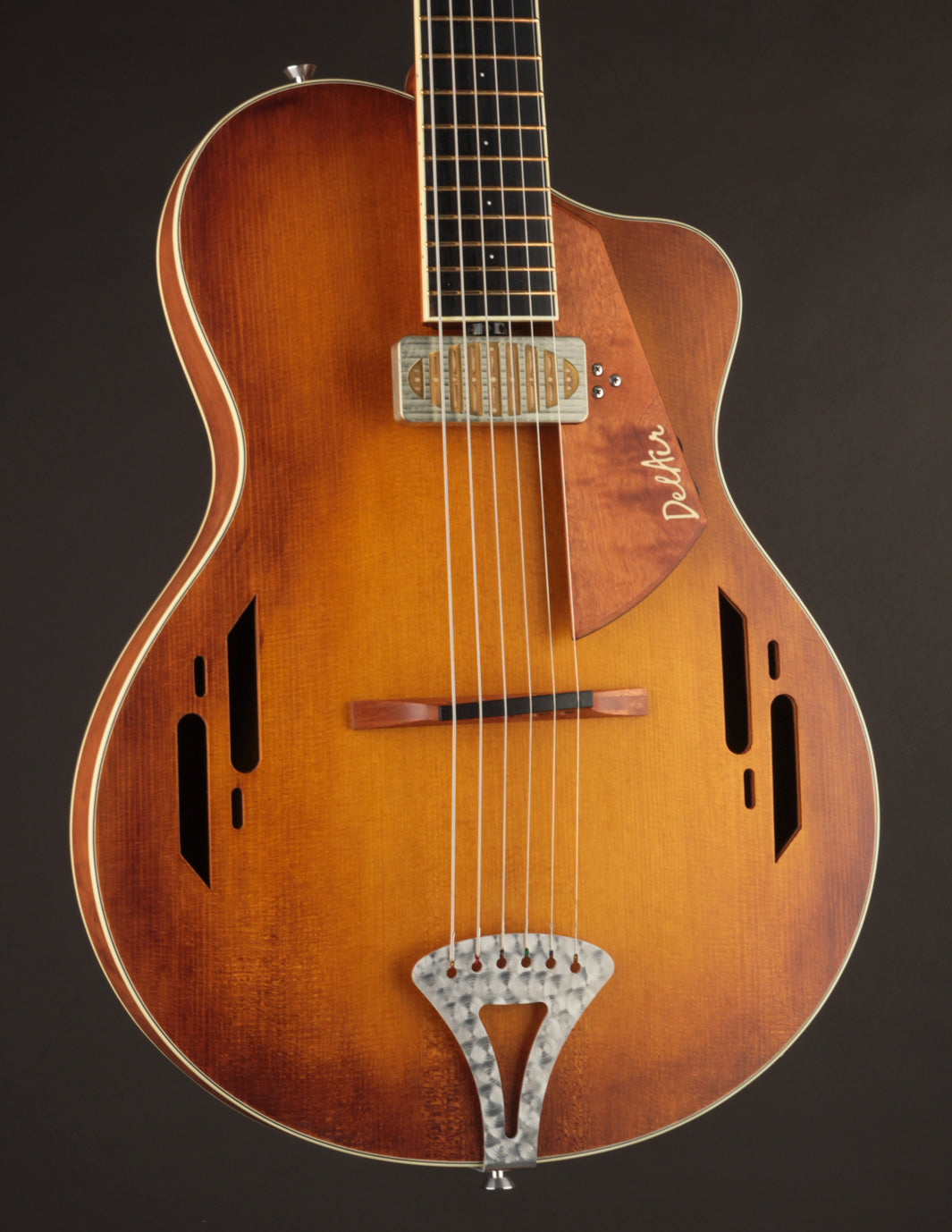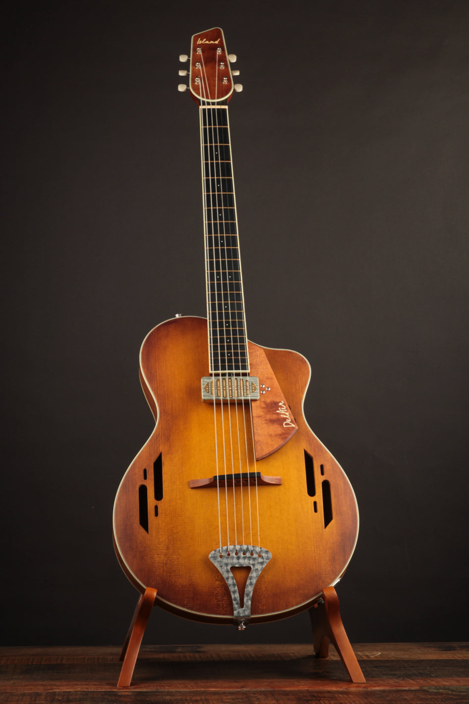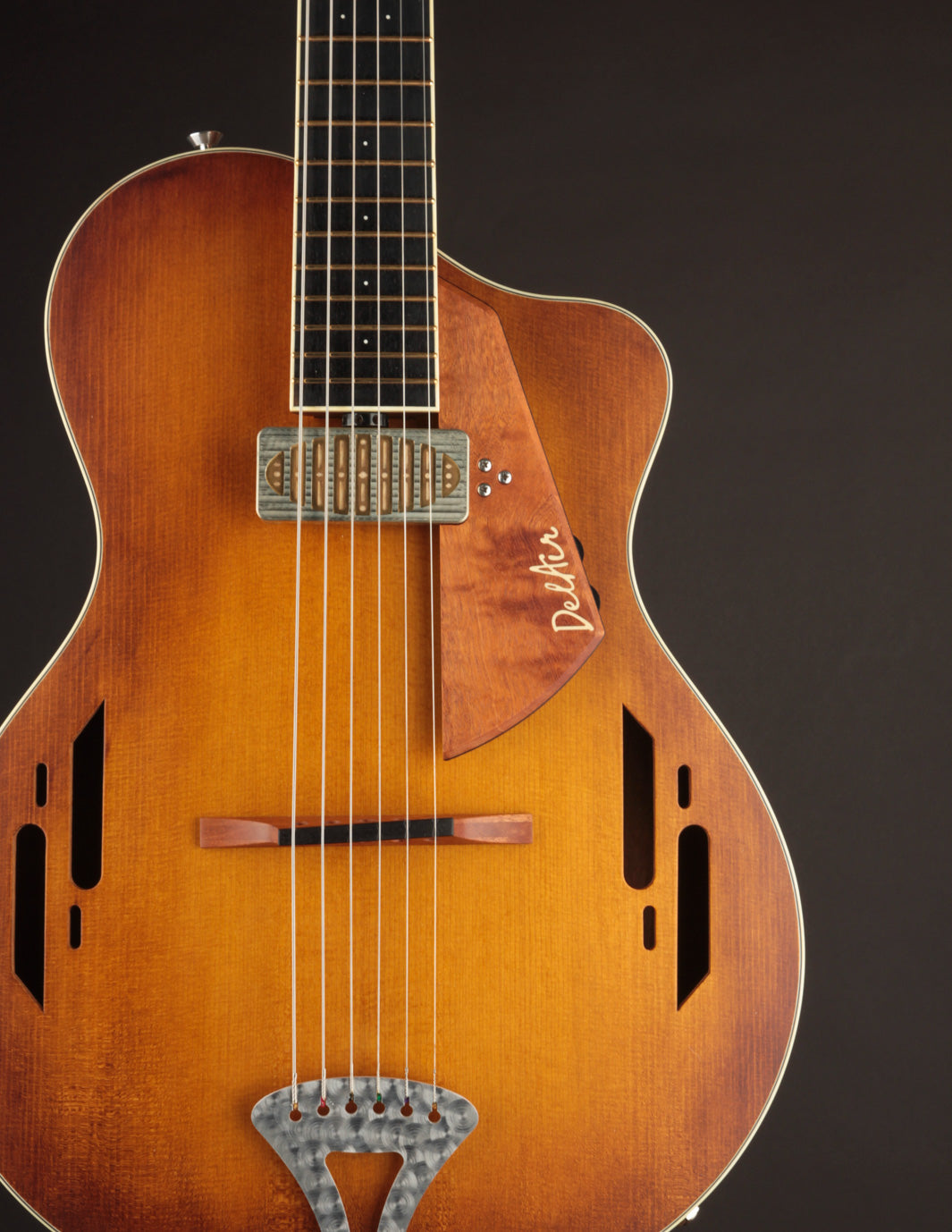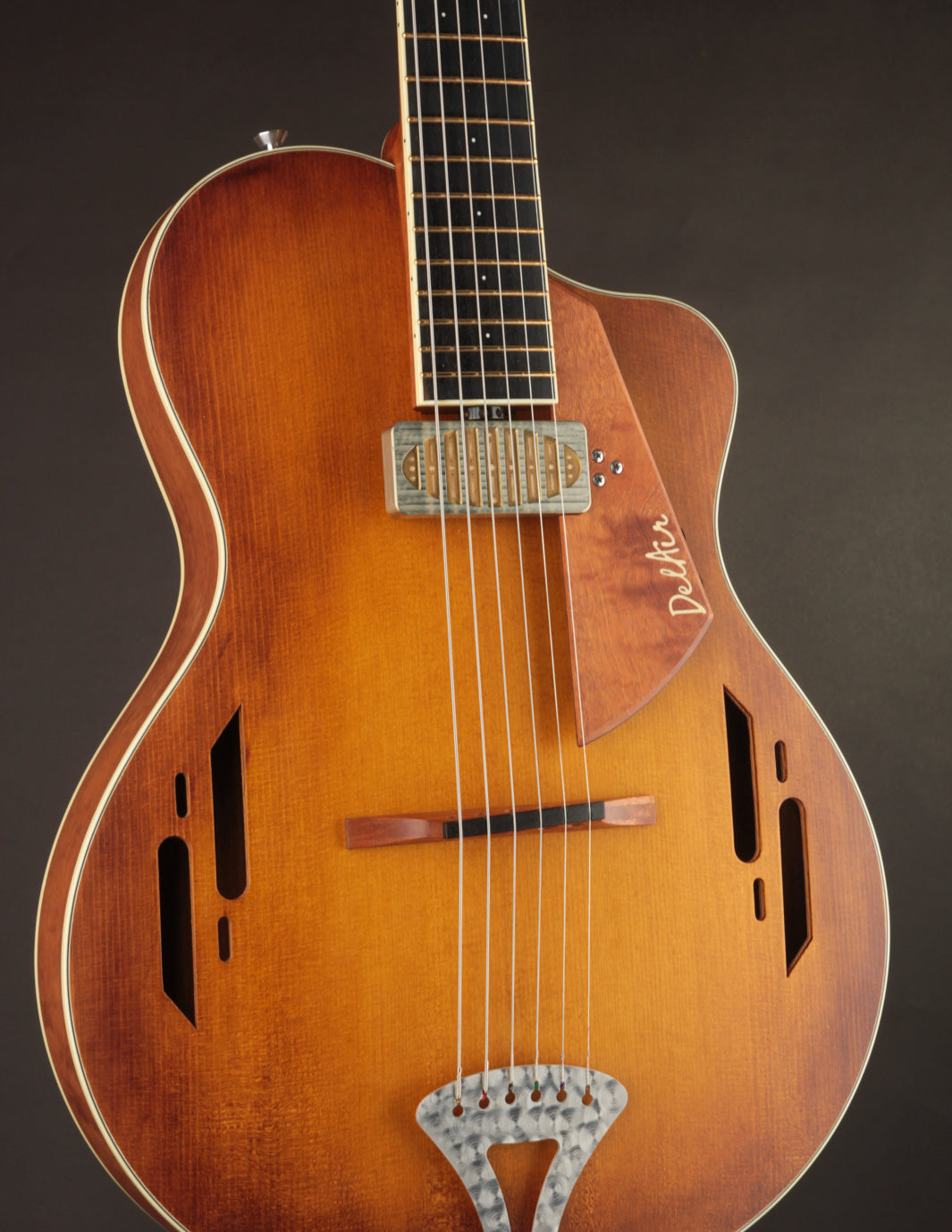 "The DelAir is my experimental hybrid electric archtop guitar built in collaboration with my close friend and shopmate, classical guitar luthier Mathieu Dallaire Walker. It took the better part of 4 years to develop and blends my interests in vintage design and aesthetics, contemporary and experimental materials and techniques, and inspiration from a number of builders that have paved the way before me." - Nic Delisle | Island Instruments