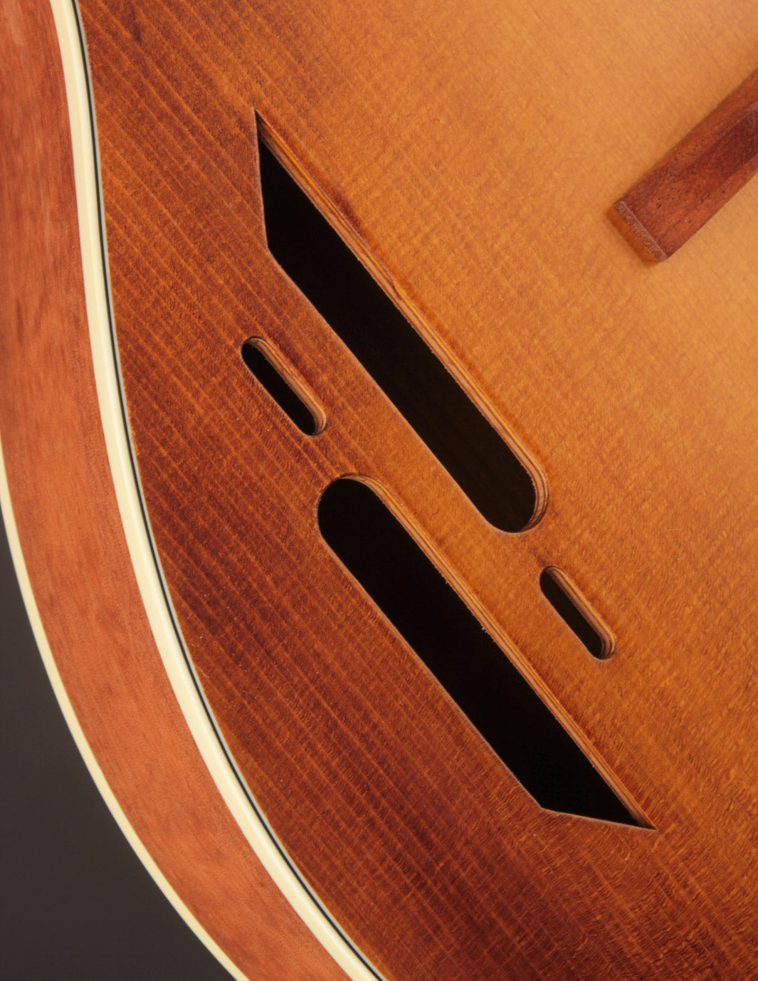 The top and back are made using a unique lamination featuring Nomex, the aerospace material used in “double top” classical guitars. They’re glued on to a rimset of “structed sides”, another unique lamination using full height kerfed liners and exterior skins. The entire system is extremely stiff and stable and provides a loud, clear, articulate tone, rich with harmonic content."