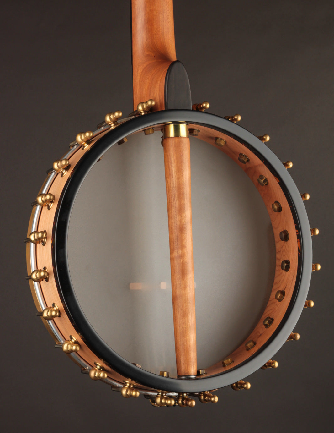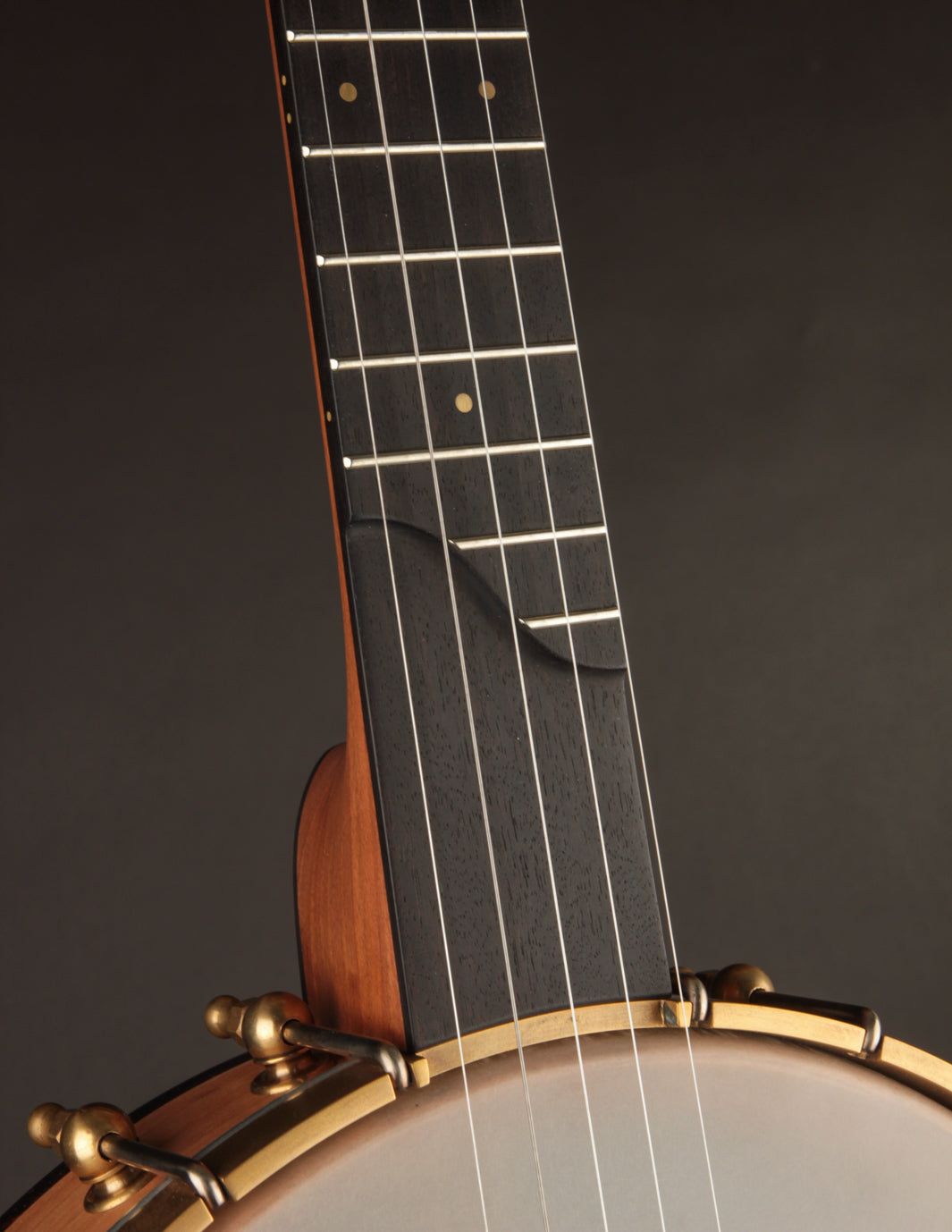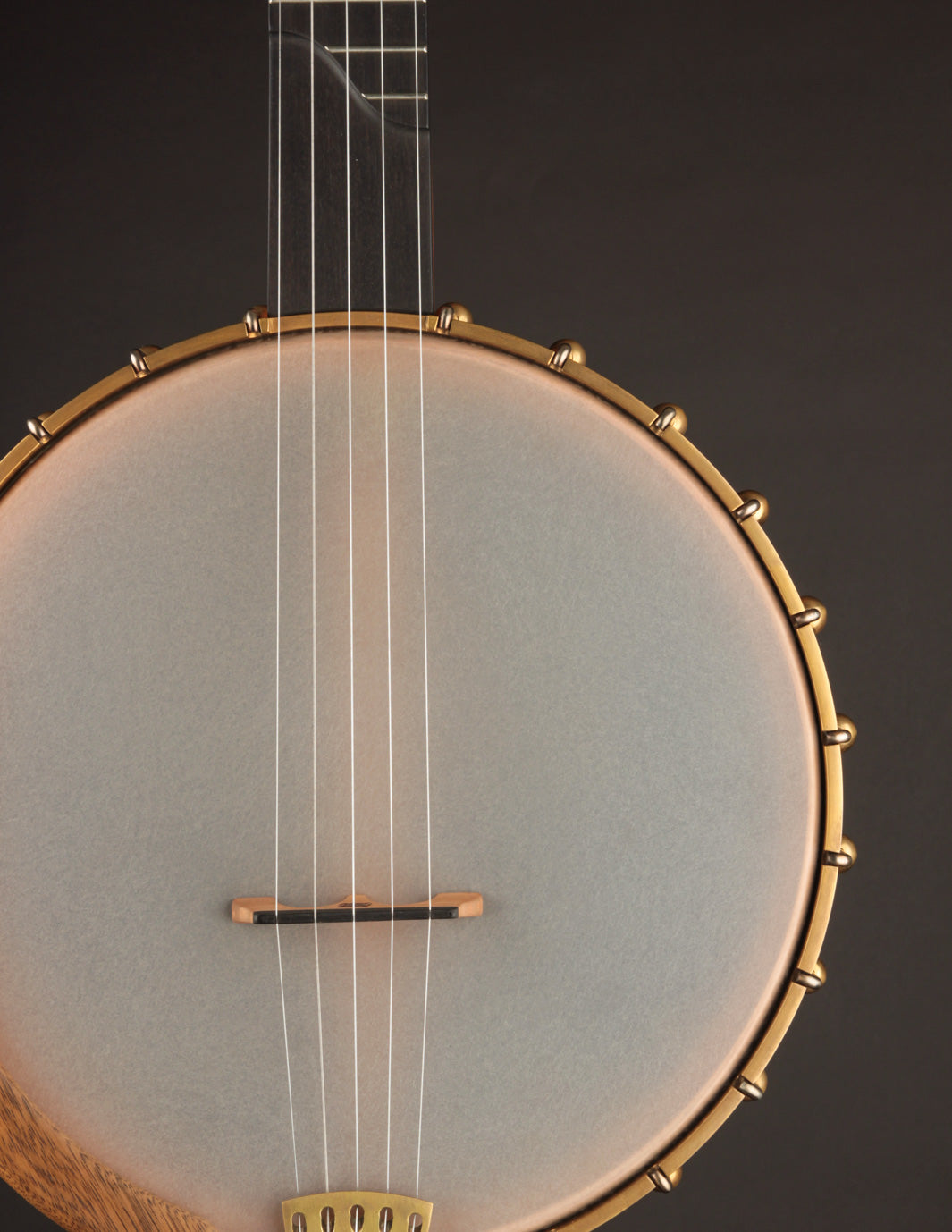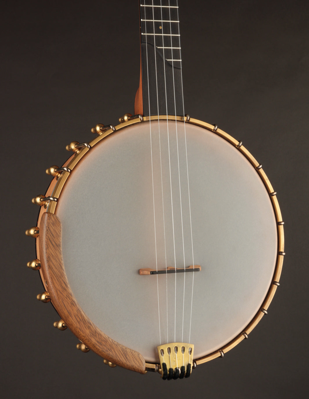 Beautifully constructed Ome Tupelo, featuring a 11" pot and wooden tone ring for an extremely warm, clucky sound. This is a very loud banjo, considering the lack of a cast tone ring, and the voice is perfectly articulate across the entire fretboard. A terrifically versatile instrument and one of our most popular open back banjo models.