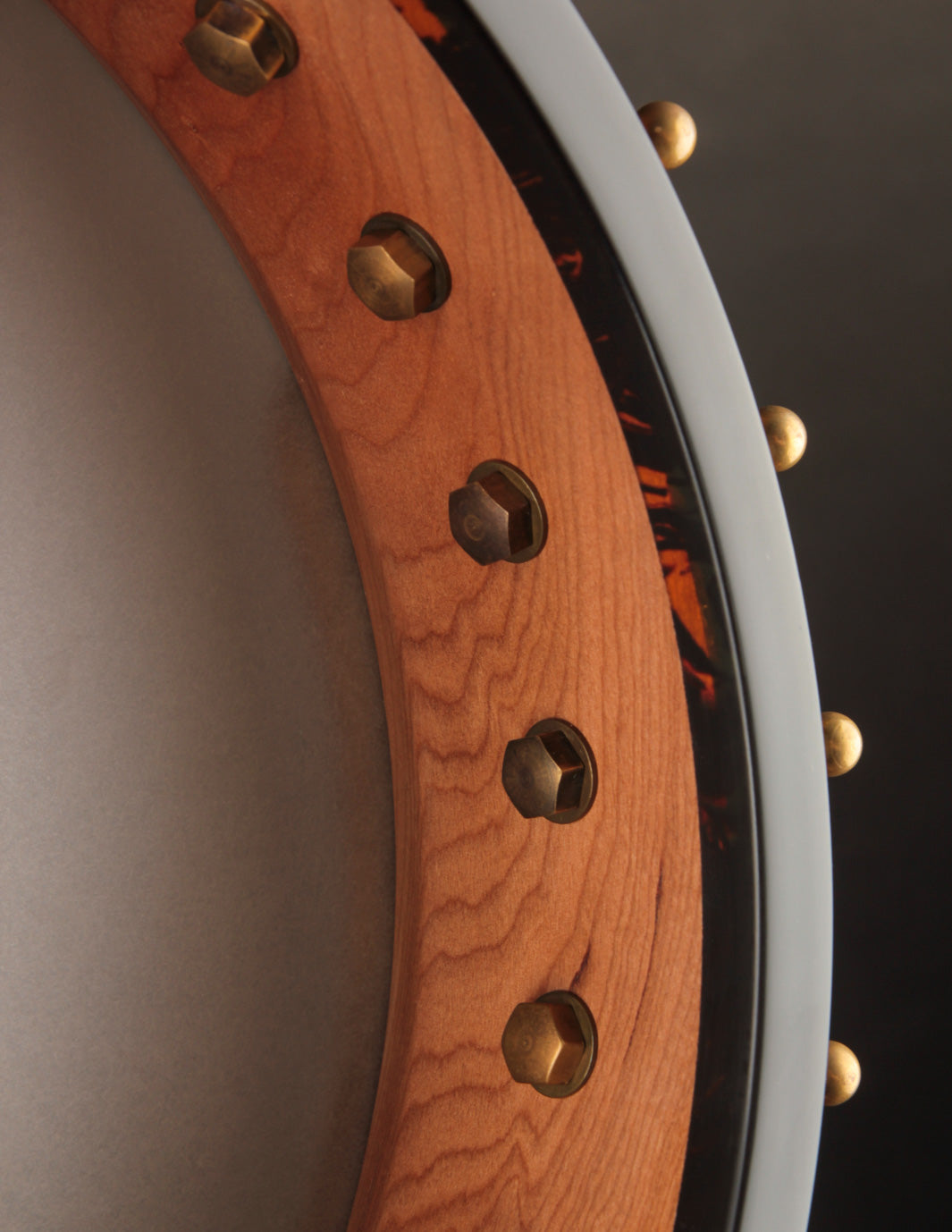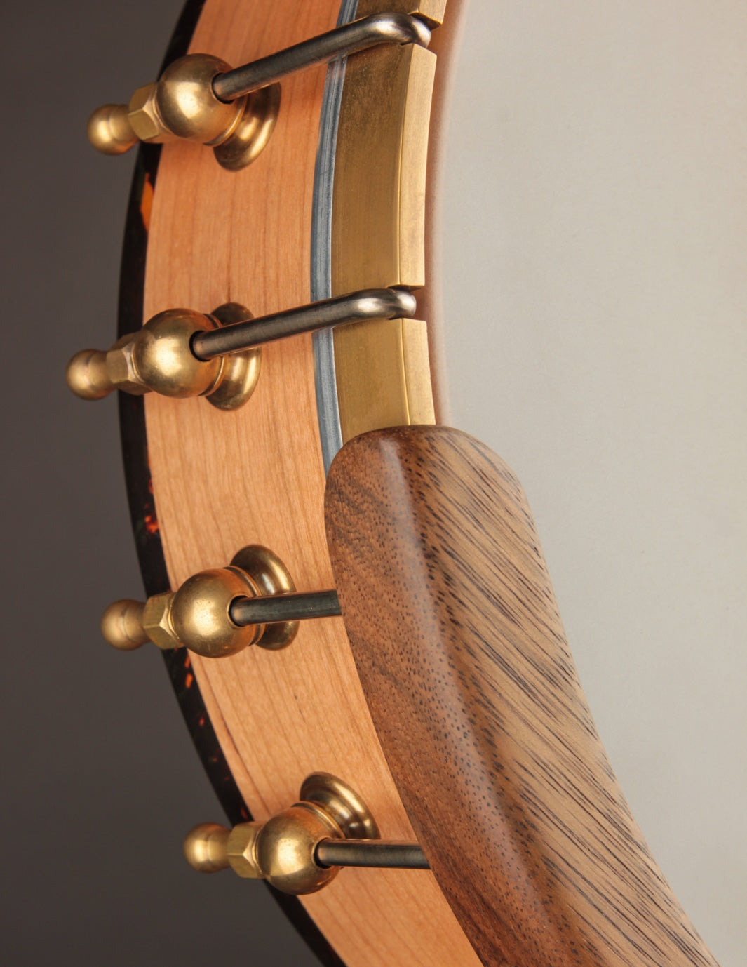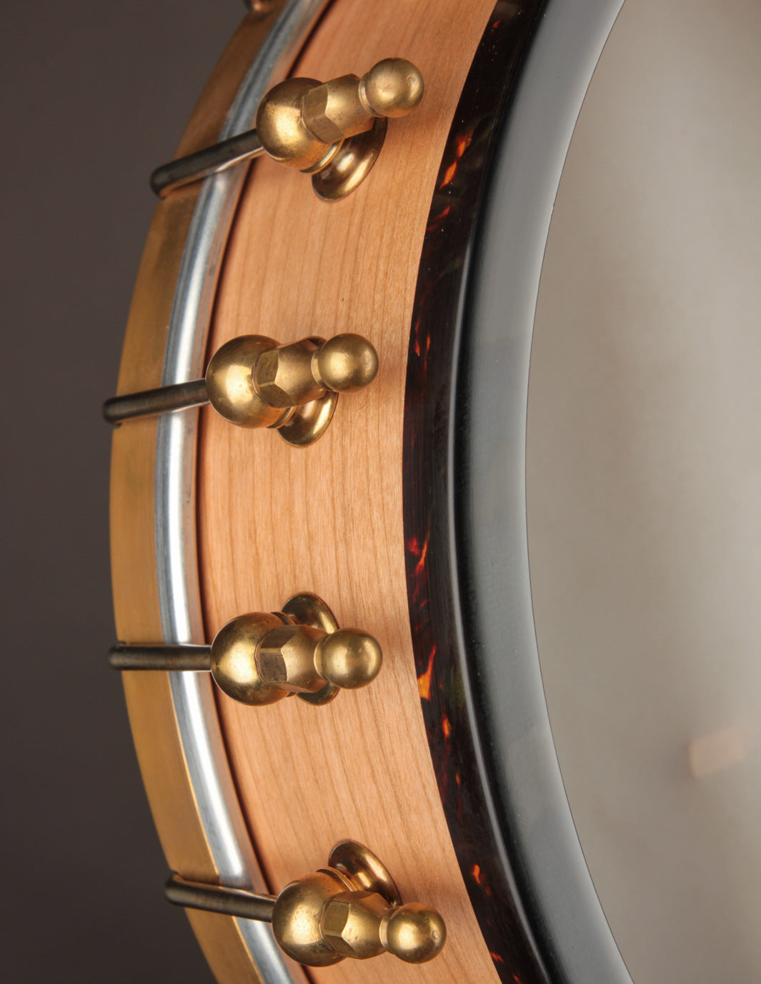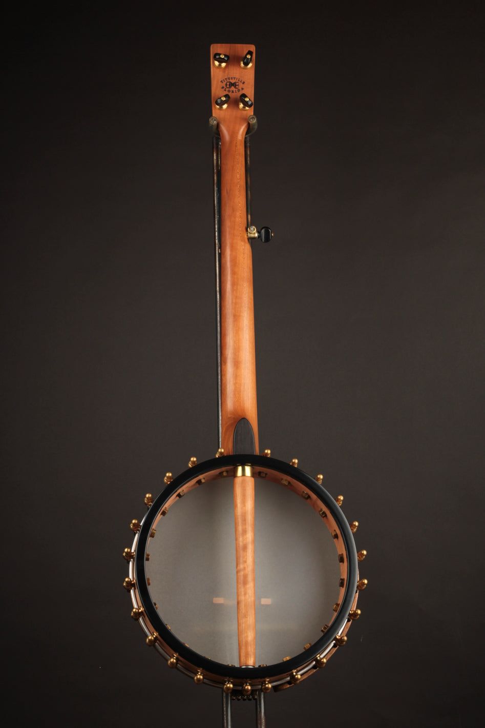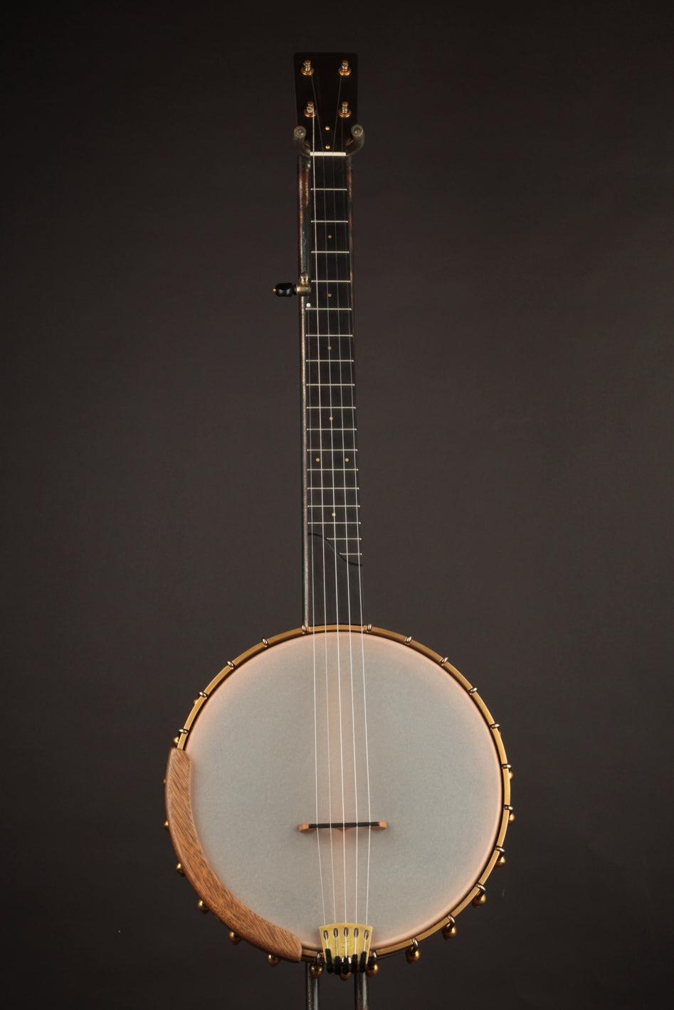 Beautifully constructed Ome Tupelo, featuring a 11" pot and wooden tone ring for an extremely warm, clucky sound. This is a very loud banjo, considering the lack of a cast tone ring, and the voice is perfectly articulate across the entire fretboard. A terrifically versatile instrument and one of our most popular open back banjo models.