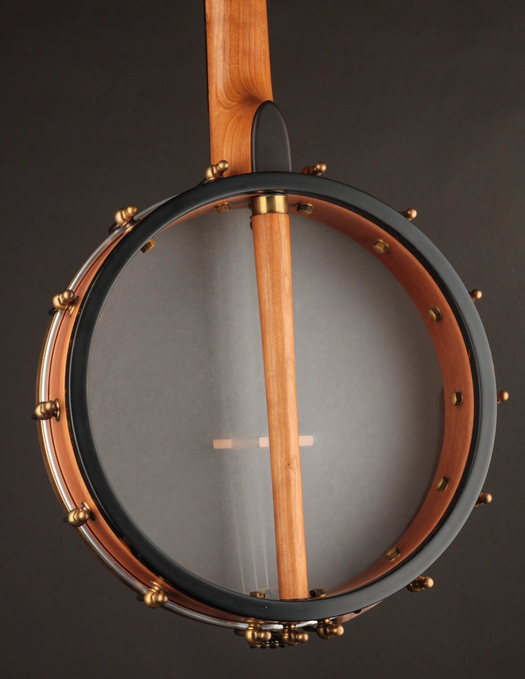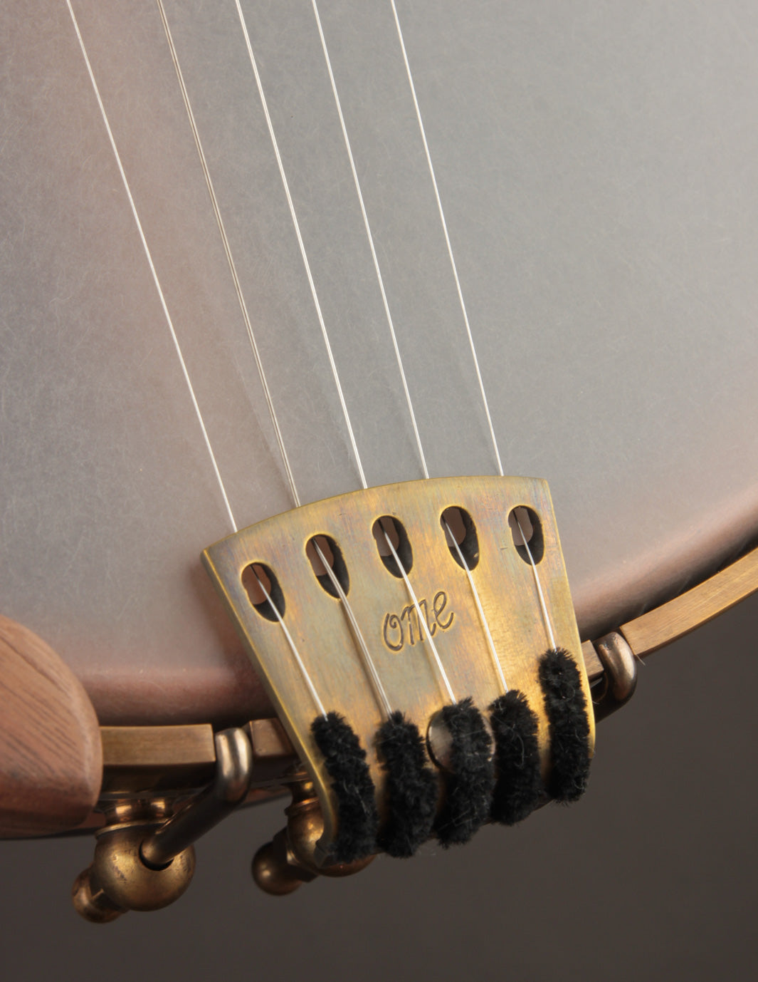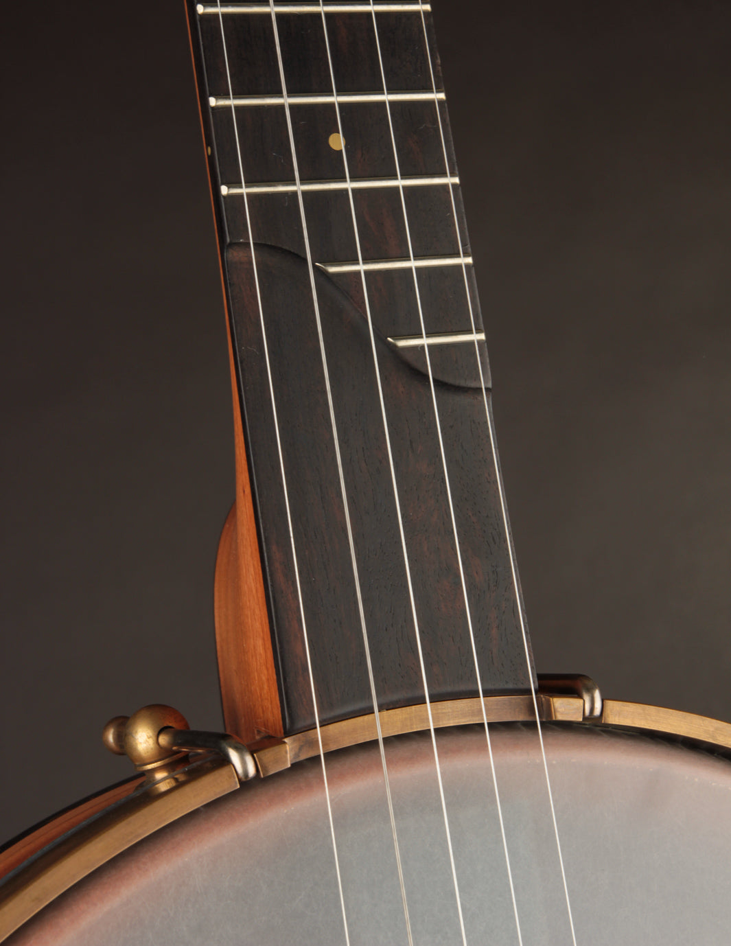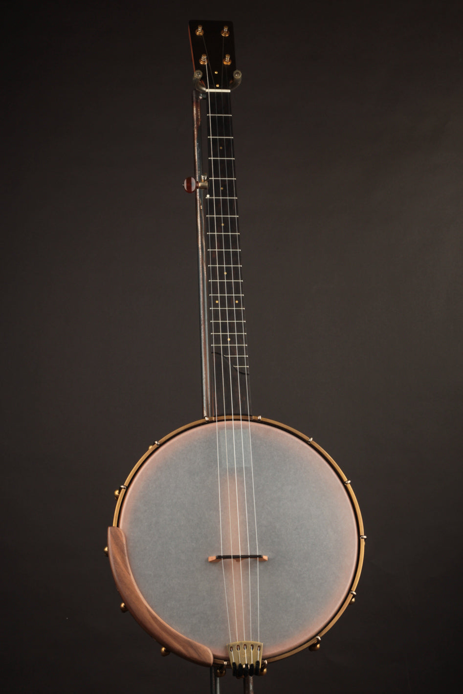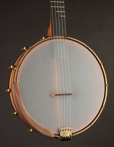 Beautifully constructed Ome Tupelo, featuring a 12" pot and wooden tone ring for an extremely warm, clucky sound. This is a very loud banjo, considering the lack of a cast tone ring, and the voice is perfectly articulate across the entire fretboard. Other features include a 25.5" scale, cherry neck and antiqued brass hardware. Priced with hardshell case.