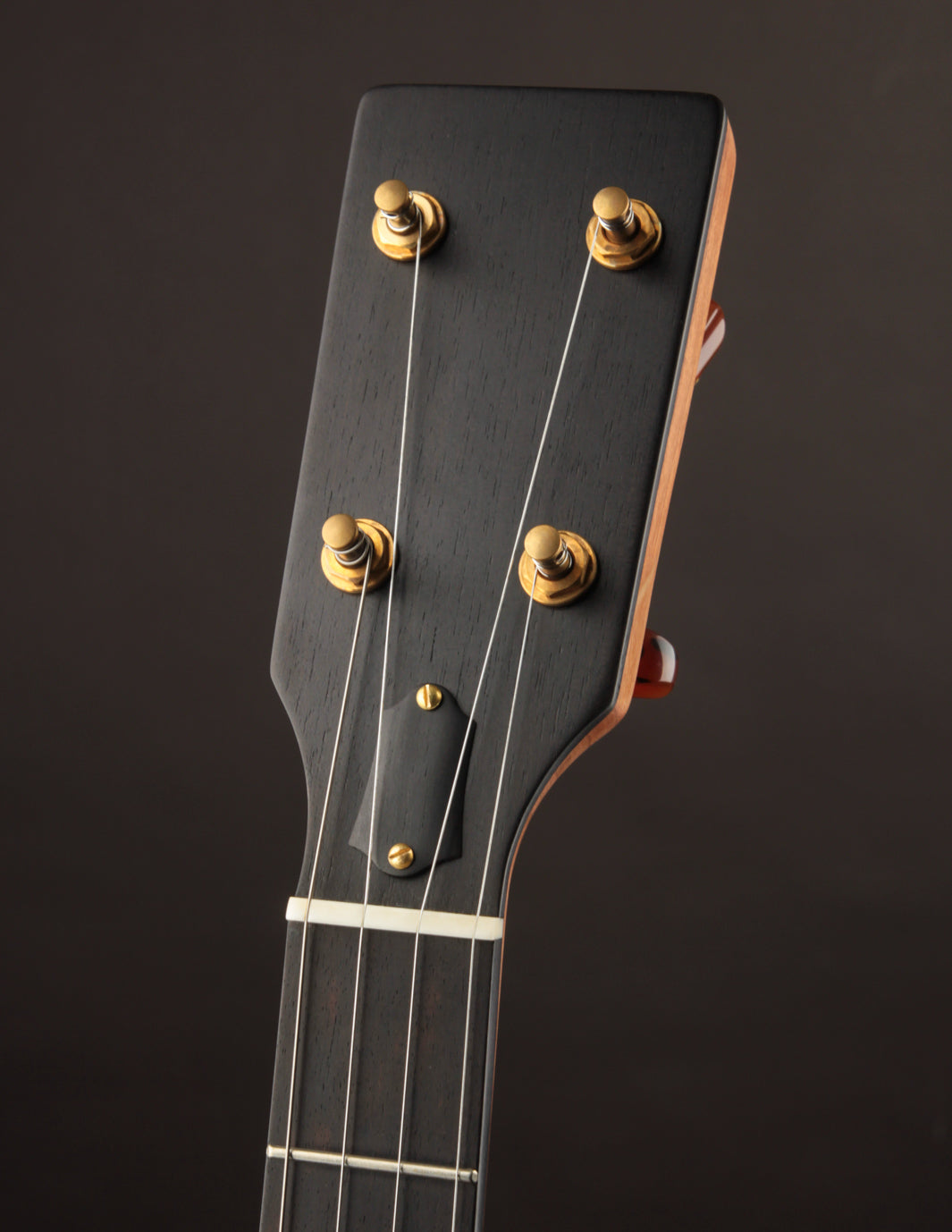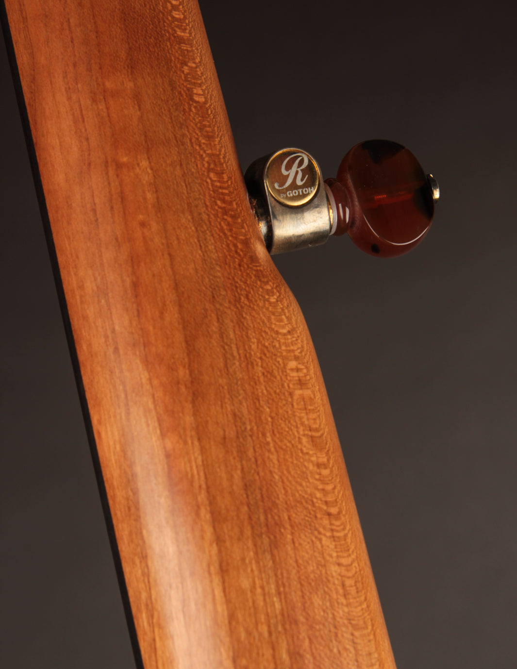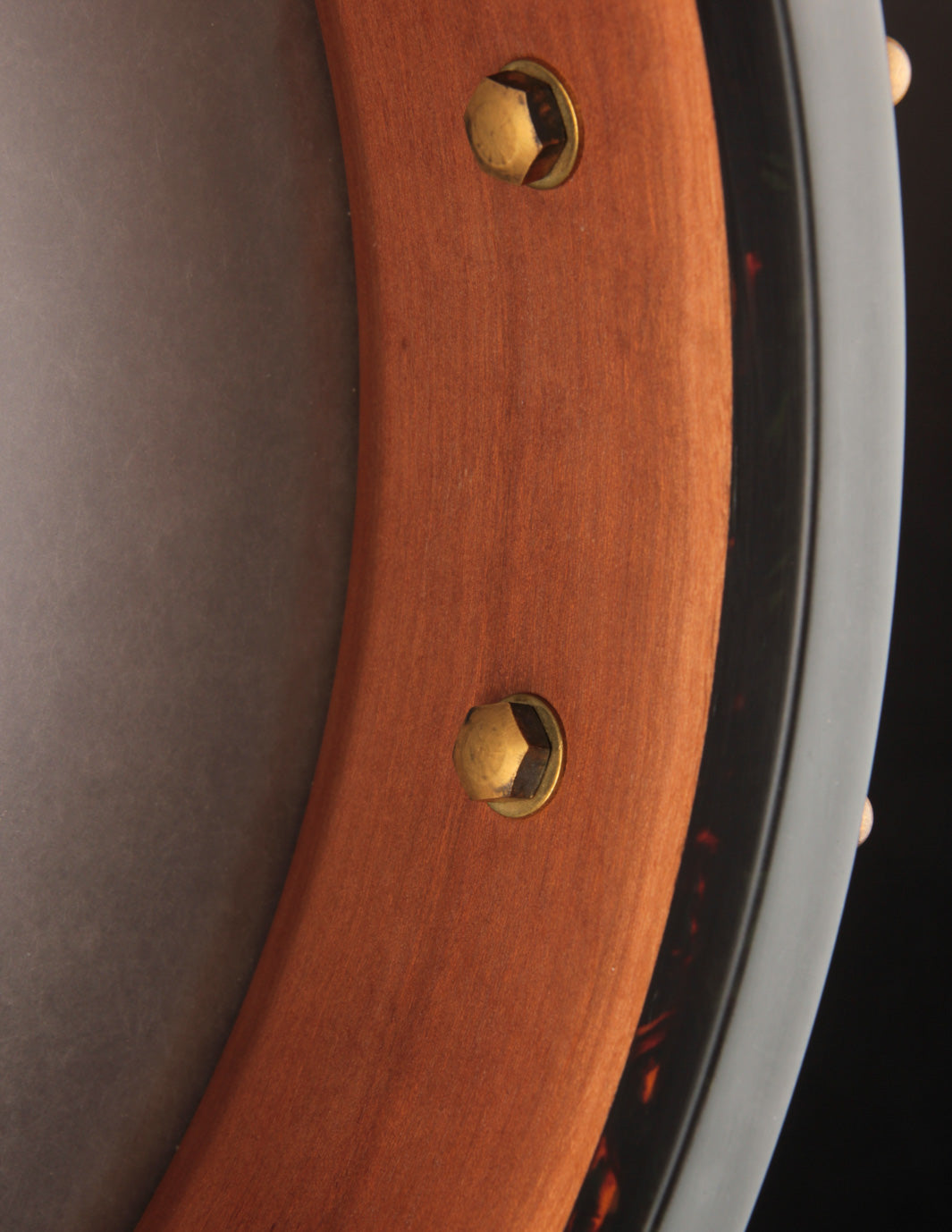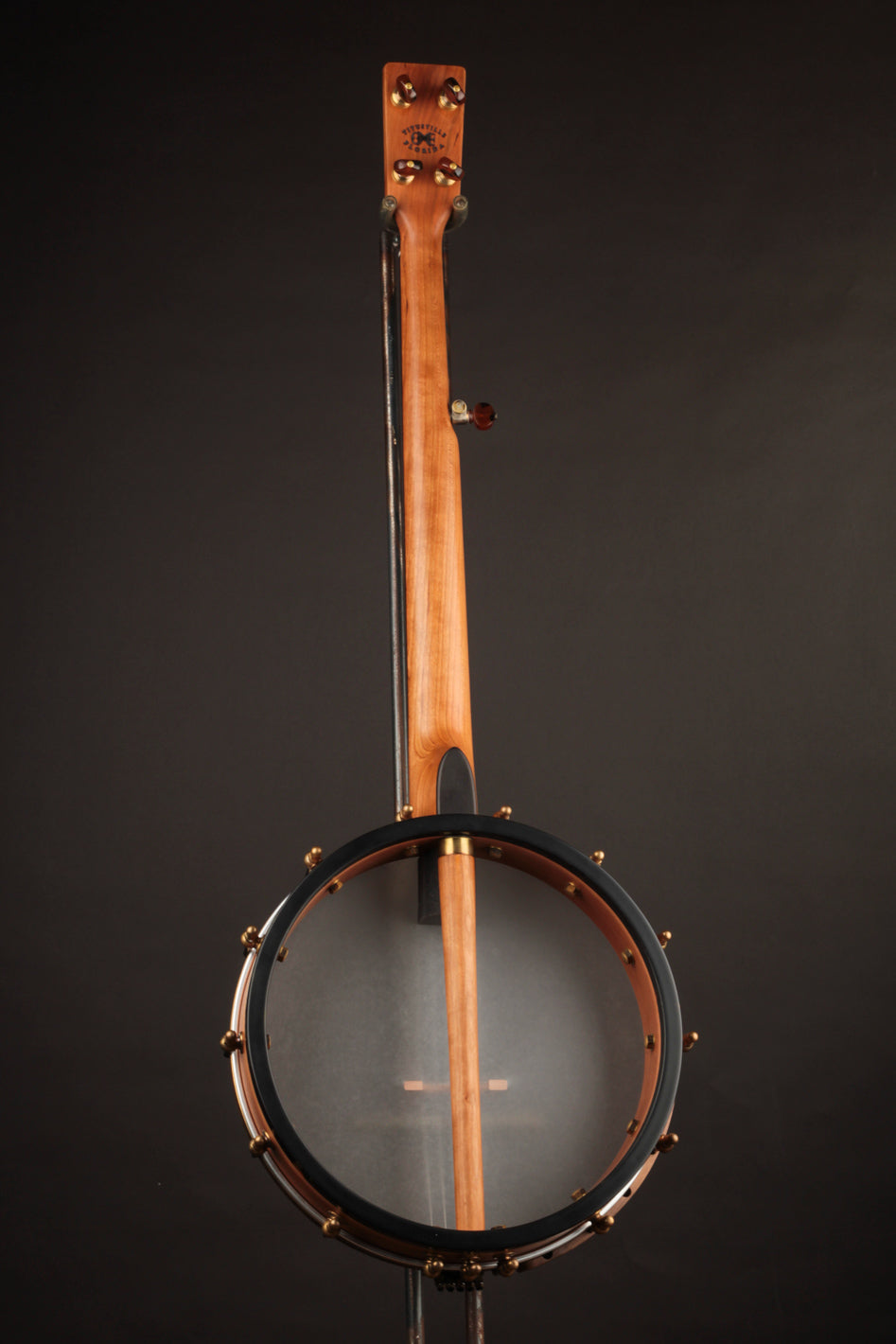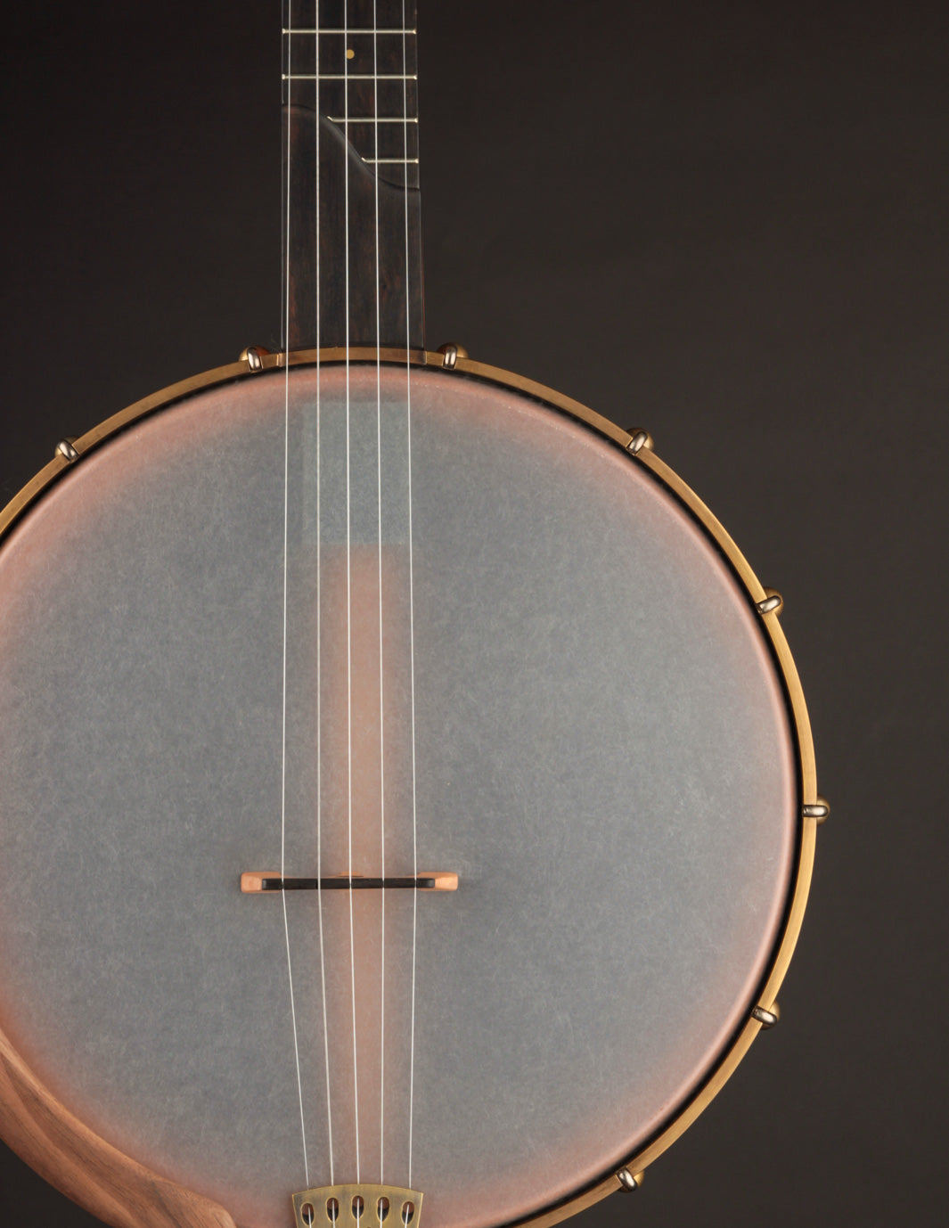Beautifully constructed Ome Tupelo, featuring a 12" pot and wooden tone ring for an extremely warm, clucky sound. This is a very loud banjo, considering the lack of a cast tone ring, and the voice is perfectly articulate across the entire fretboard. Other features include a 25.5" scale, cherry neck and antiqued brass hardware. Priced with hardshell case.