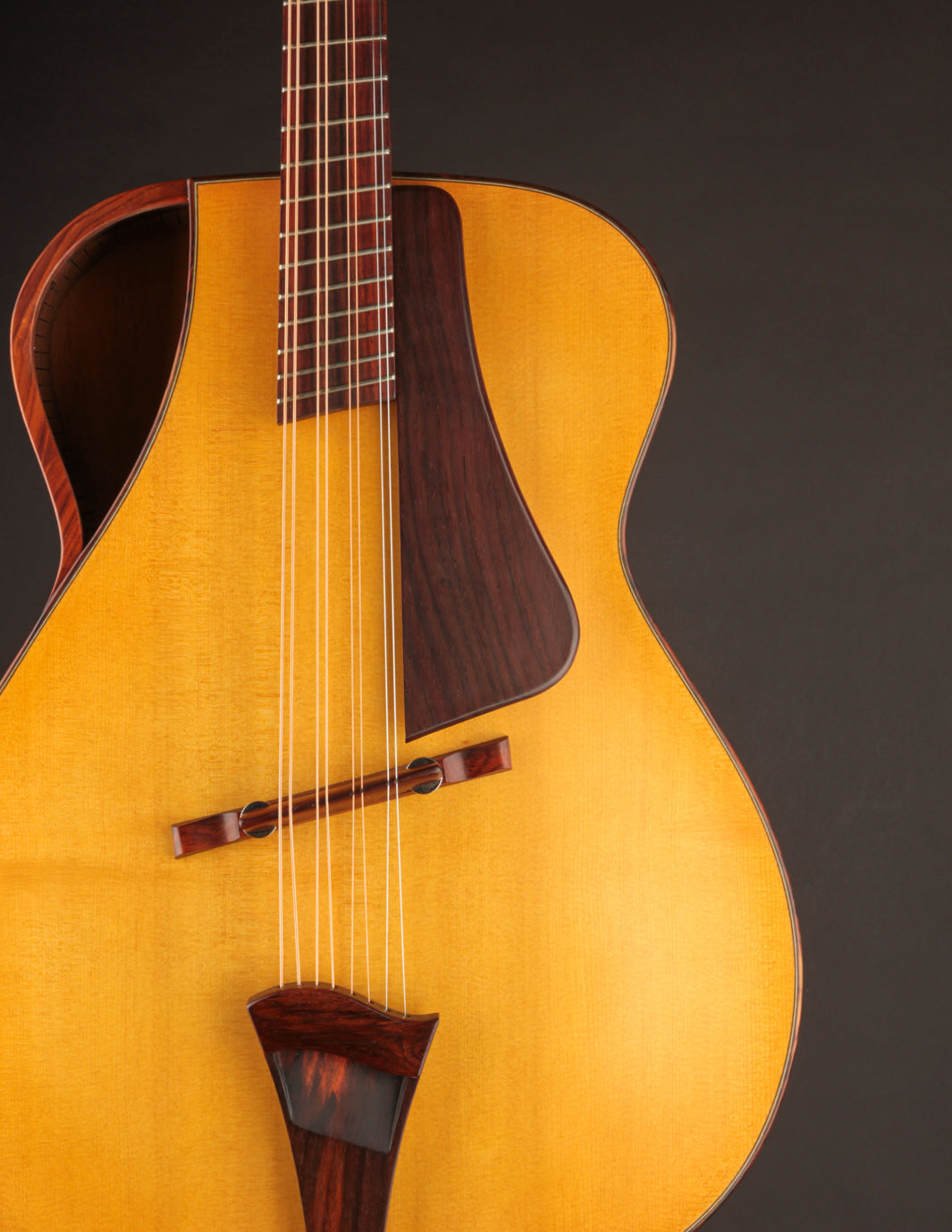 This, our first multiscale octave from Bayard, boasts a warm, big fundamental-forward sound. Thick, broad-brush-stroke low end, with great body and punch throughout on this octave mandolin. The soundhole in the upper bout, in tandem with the carved, archtop voicing, makes for a big, sonorous instrument, easy to hear for the player and listener alike.