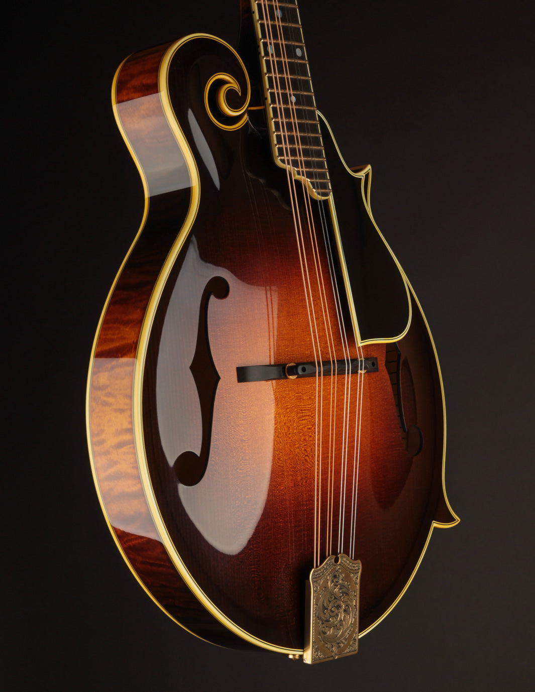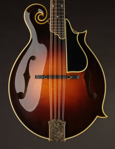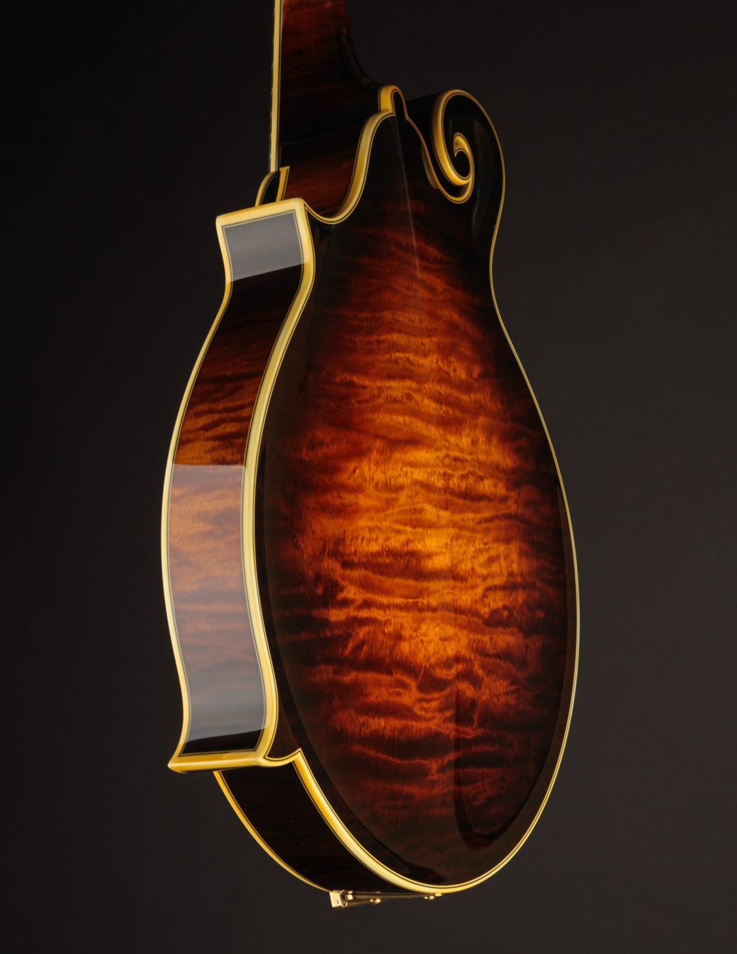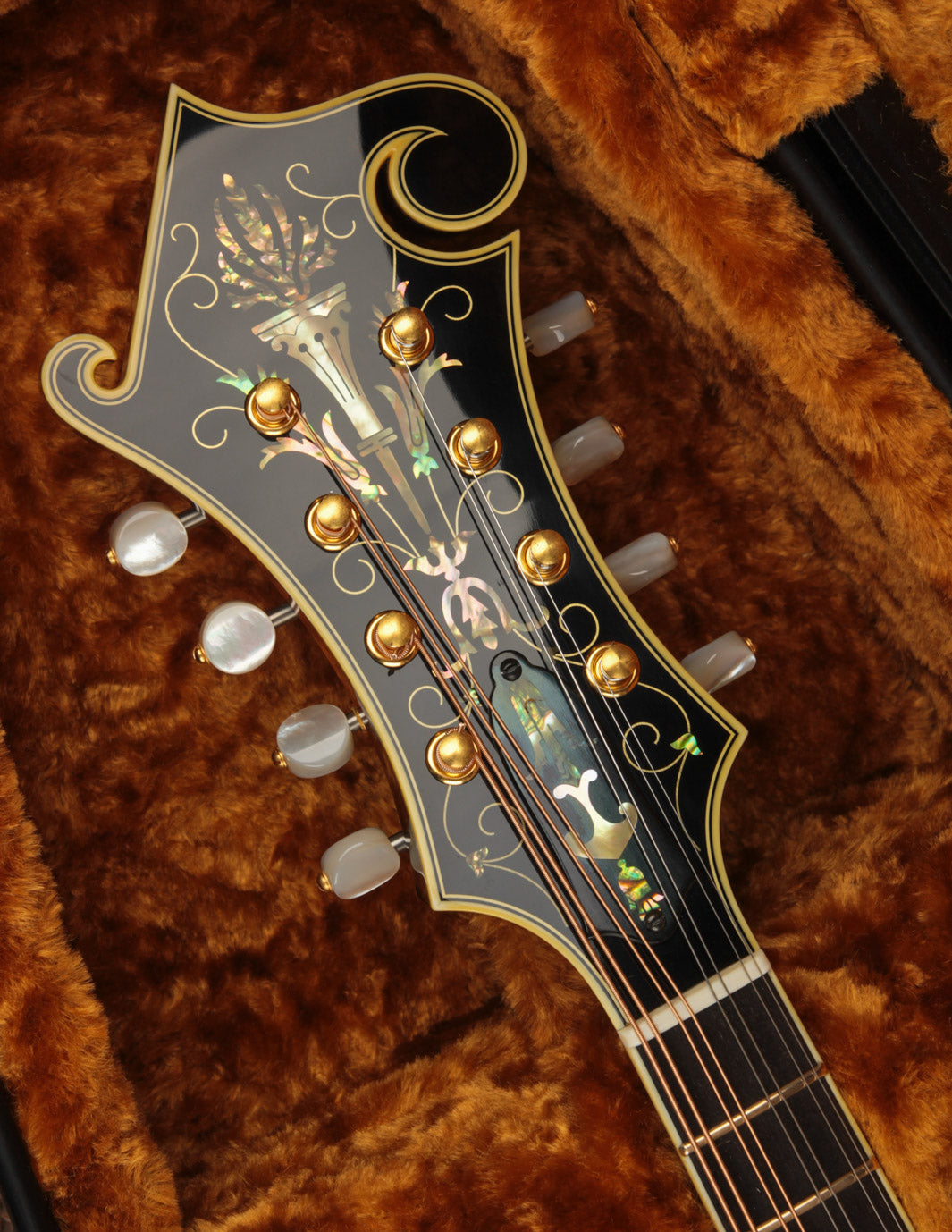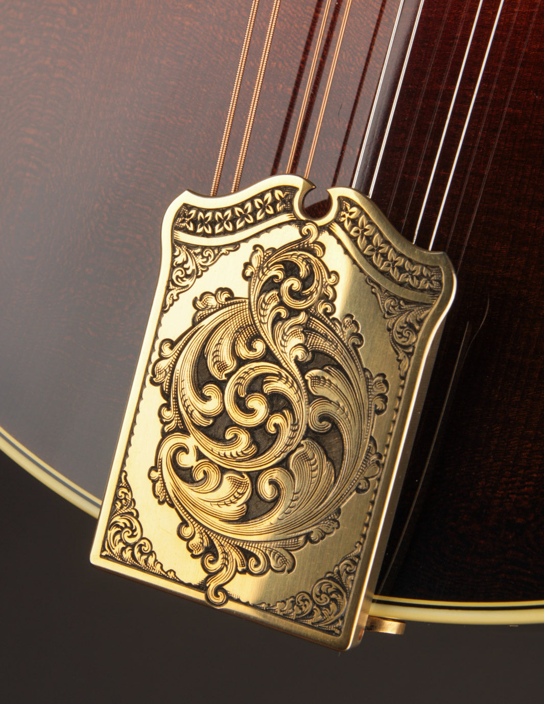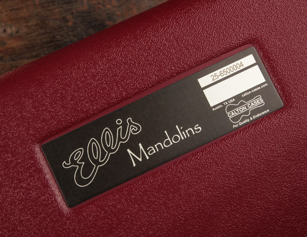 We're excited to offer this heirloom-quality F5 mandolin from the workshop of Tom Ellis. Cosmetics aside, an Ellis F5 Reserve offers the sort of tonal sophistication and workmanship a discerning player demands. Many great-looking mandolins built with quilted maple will hypnotize onlookers with the three-dimensional nature of the wood's figure ... but they sound a little timid. Not this one! Depth of tone, harmonic richness, sustain, power and pop--not only will this instrument record like a dream, it'll more than hold its own in a loud bluegrass jam. As for its looks? Well ... we're inclined to say there isn't a more finely built mandolin out there. From the picture-perfect tones of its sunburst, to the artistry of the inlay work, to Weldon Lister's engraving work on the tailpiece ... "flawless" just about sums it up. Have a look through our photo gallery for some detailed shots, and give us a call if you'd like an in-hand description. Priced with new Calton Case.