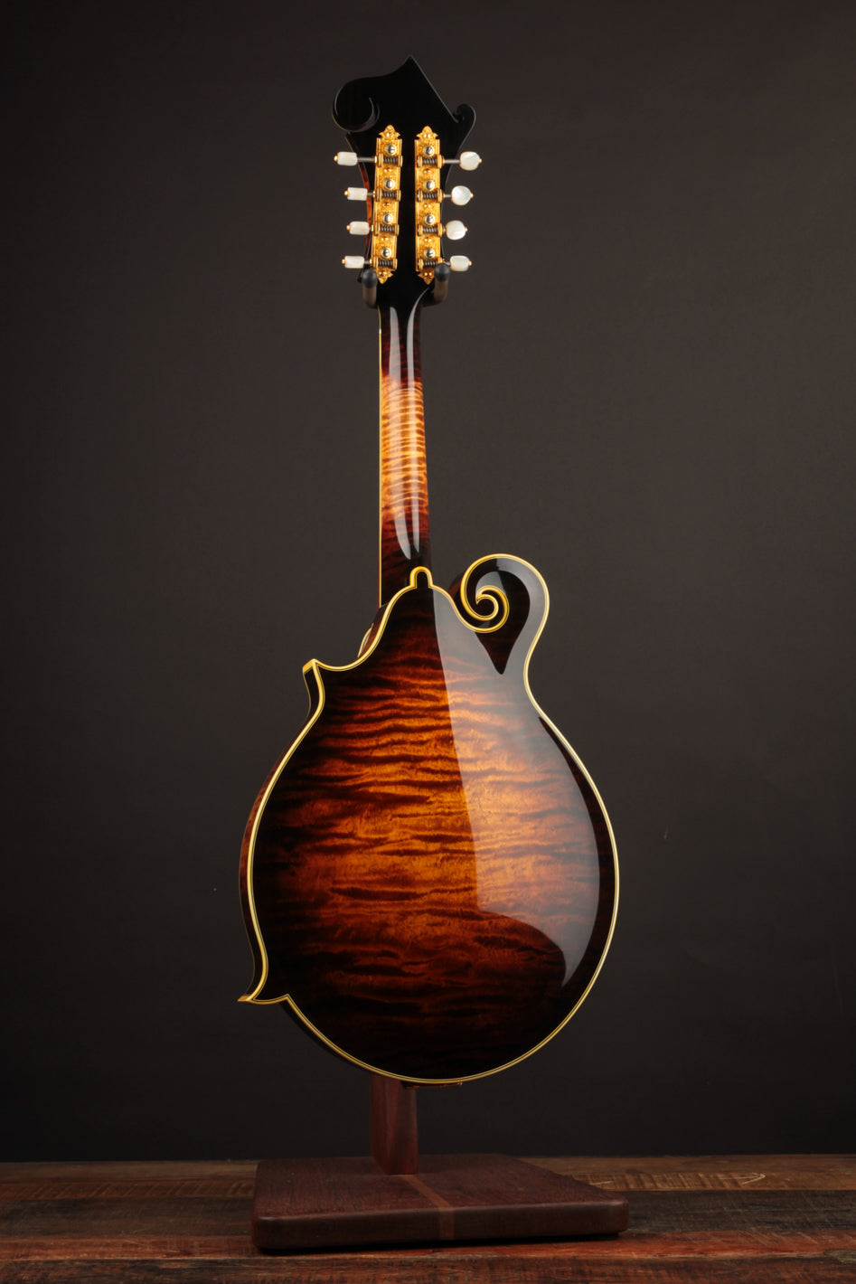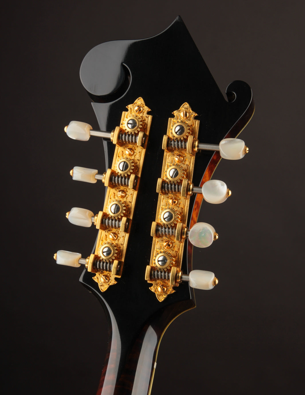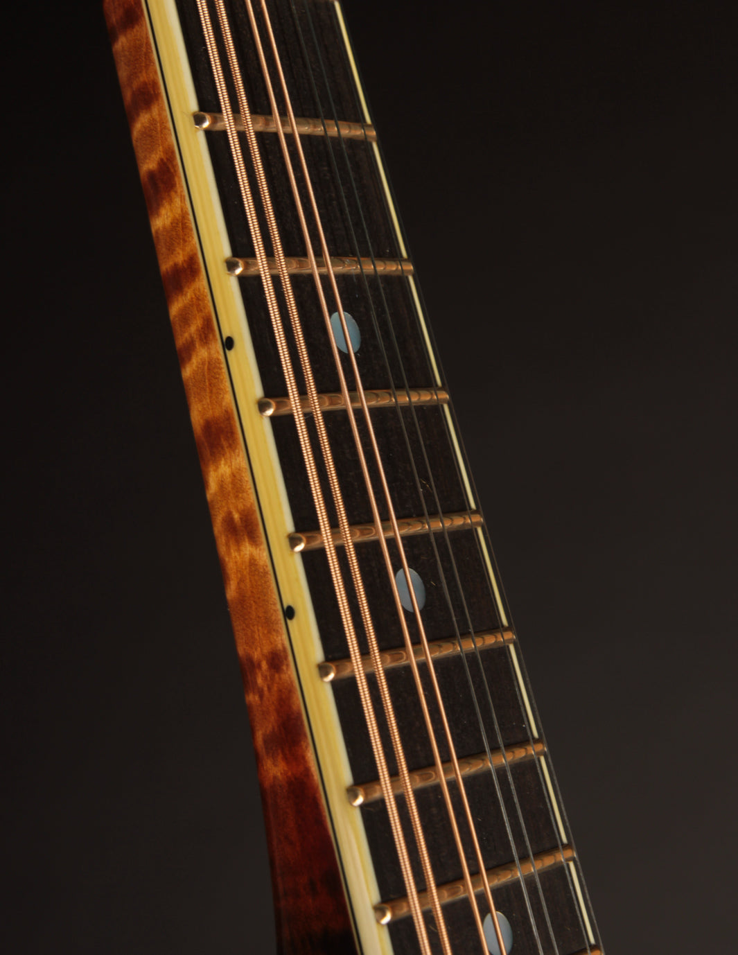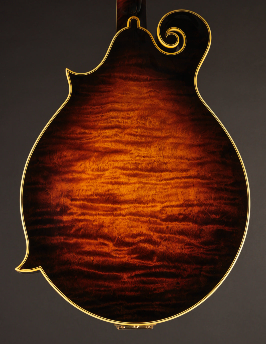 We're excited to offer this heirloom-quality F5 mandolin from the workshop of Tom Ellis. Cosmetics aside, an Ellis F5 Reserve offers the sort of tonal sophistication and workmanship a discerning player demands. Many great-looking mandolins built with quilted maple will hypnotize onlookers with the three-dimensional nature of the wood's figure ... but they sound a little timid. Not this one! Depth of tone, harmonic richness, sustain, power and pop--not only will this instrument record like a dream, it'll more than hold its own in a loud bluegrass jam. As for its looks? Well ... we're inclined to say there isn't a more finely built mandolin out there. From the picture-perfect tones of its sunburst, to the artistry of the inlay work, to Weldon Lister's engraving work on the tailpiece ... "flawless" just about sums it up. Have a look through our photo gallery for some detailed shots, and give us a call if you'd like an in-hand description. Priced with new Calton Case.