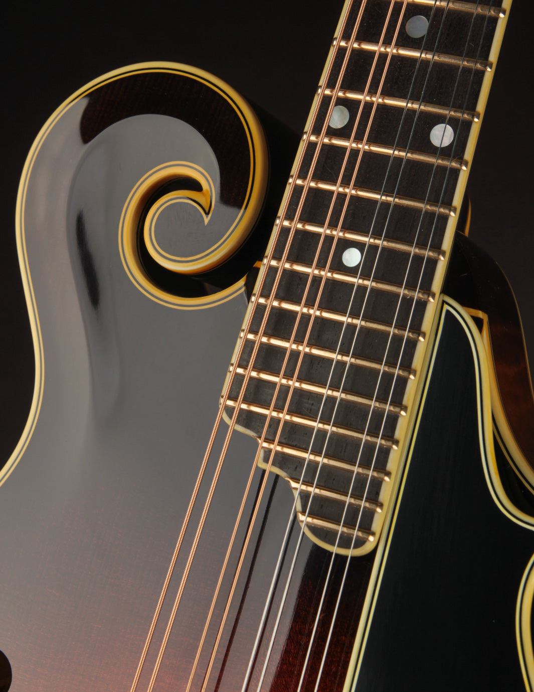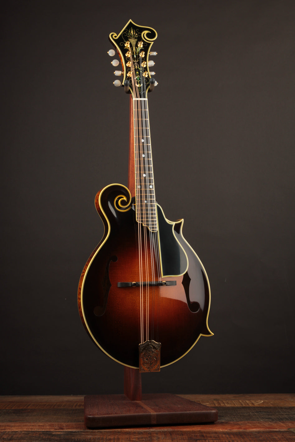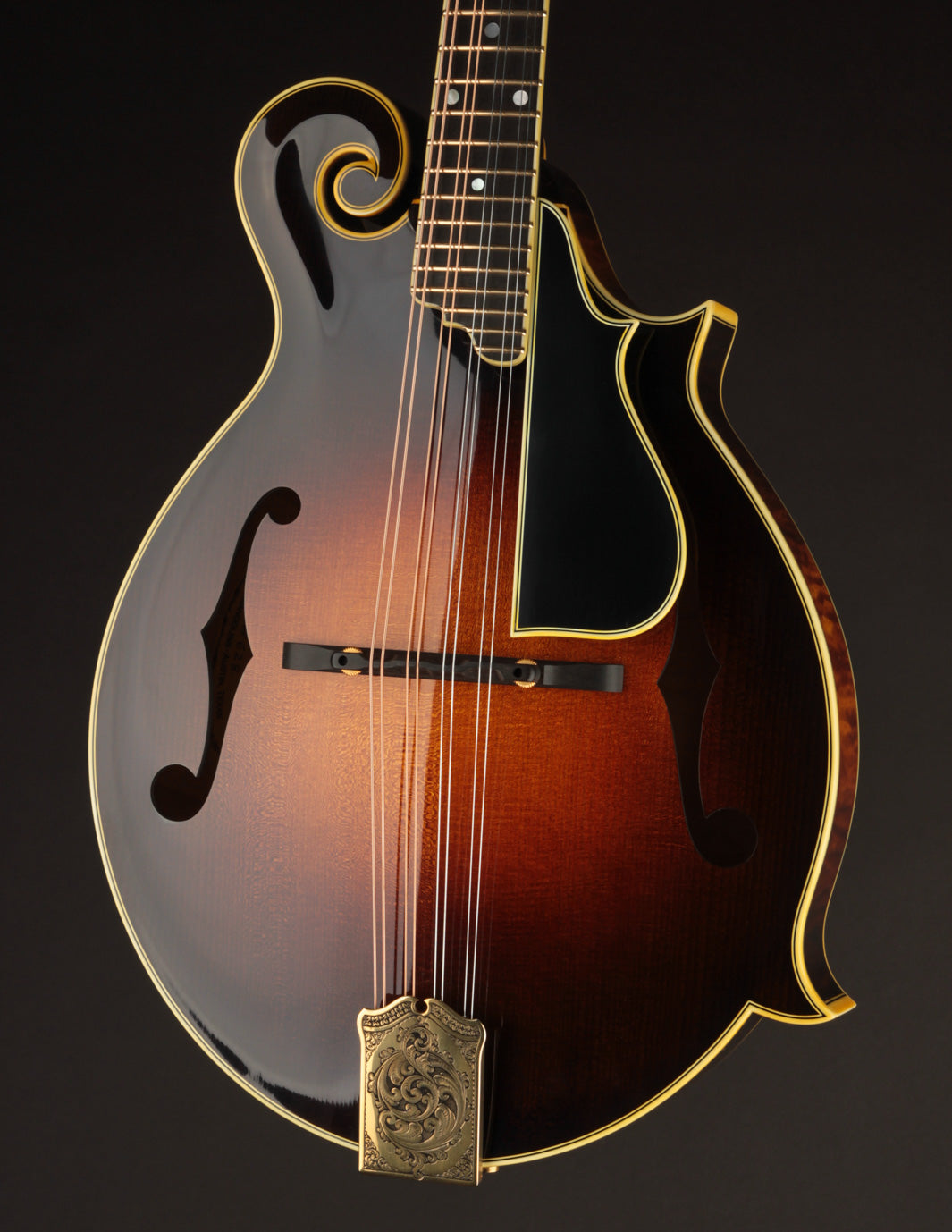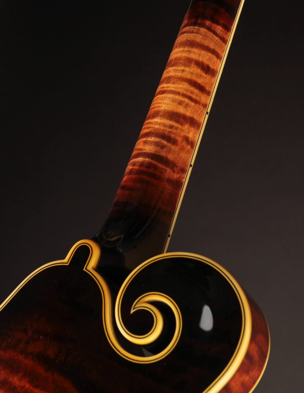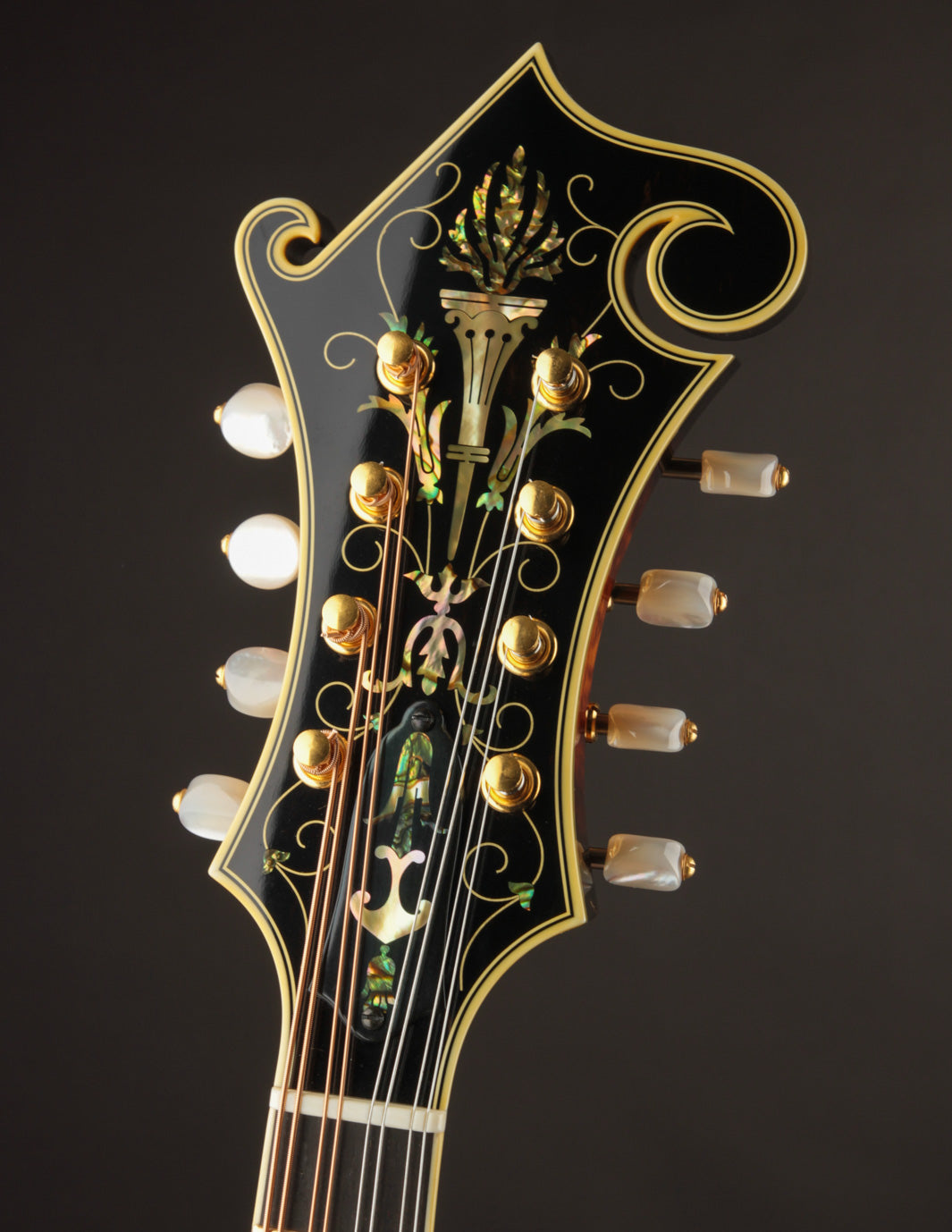 We're excited to offer this heirloom-quality F5 mandolin from the workshop of Tom Ellis. Cosmetics aside, an Ellis F5 Reserve offers the sort of tonal sophistication and workmanship a discerning player demands. Many great-looking mandolins built with quilted maple will hypnotize onlookers with the three-dimensional nature of the wood's figure ... but they sound a little timid. Not this one! Depth of tone, harmonic richness, sustain, power and pop--not only will this instrument record like a dream, it'll more than hold its own in a loud bluegrass jam. As for its looks? Well ... we're inclined to say there isn't a more finely built mandolin out there. From the picture-perfect tones of its sunburst, to the artistry of the inlay work, to Weldon Lister's engraving work on the tailpiece ... "flawless" just about sums it up. Have a look through our photo gallery for some detailed shots, and give us a call if you'd like an in-hand description. Priced with new Calton Case.