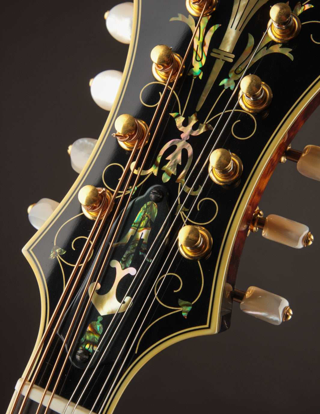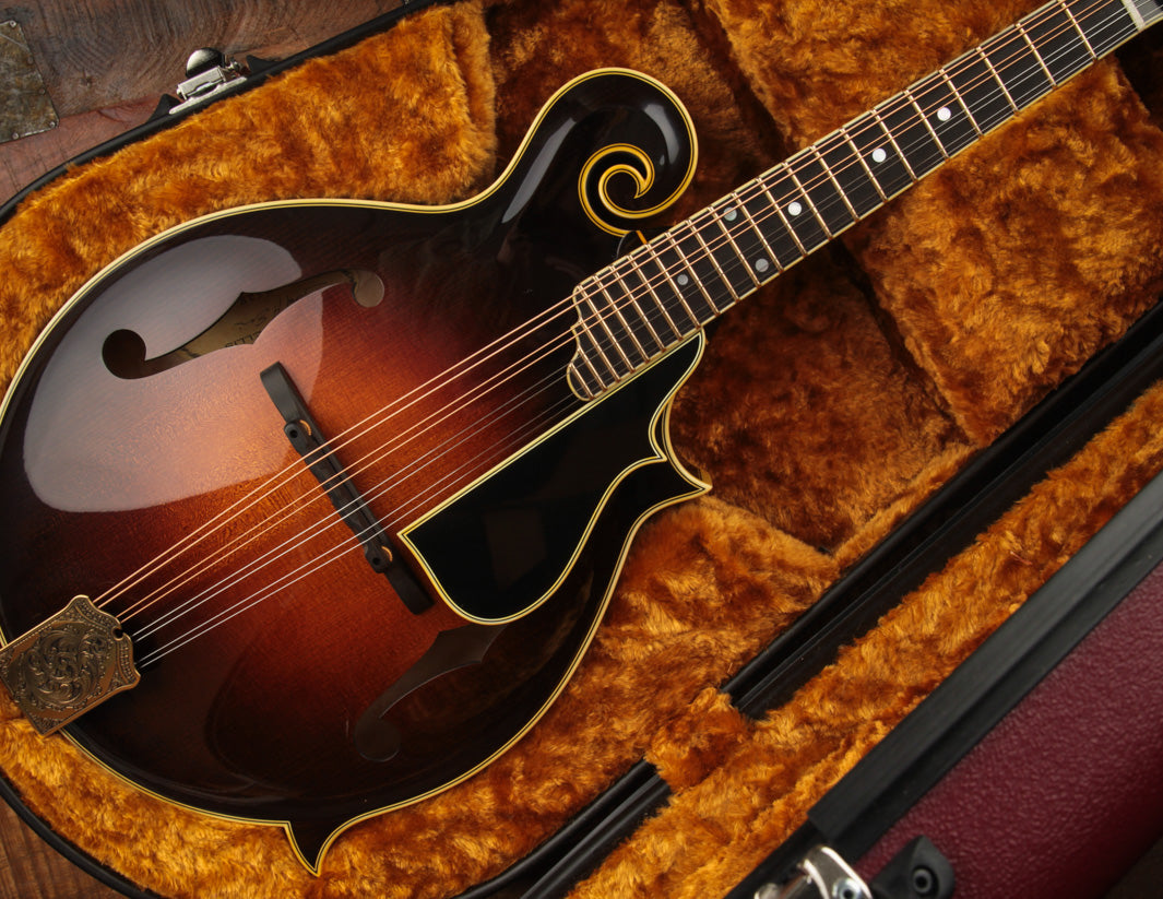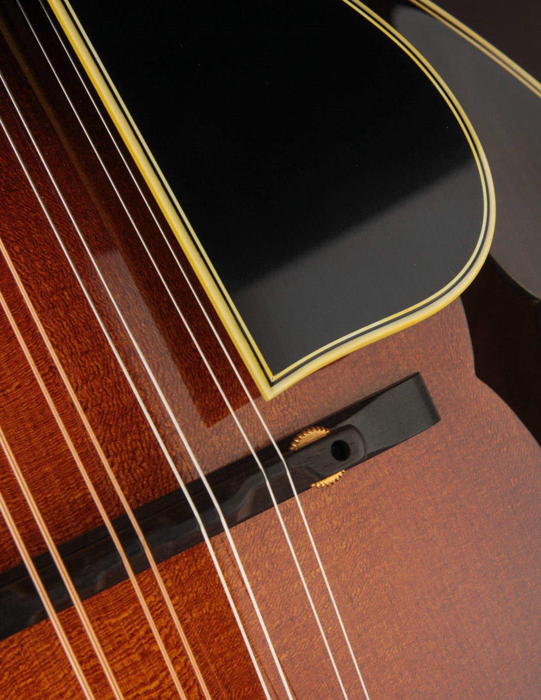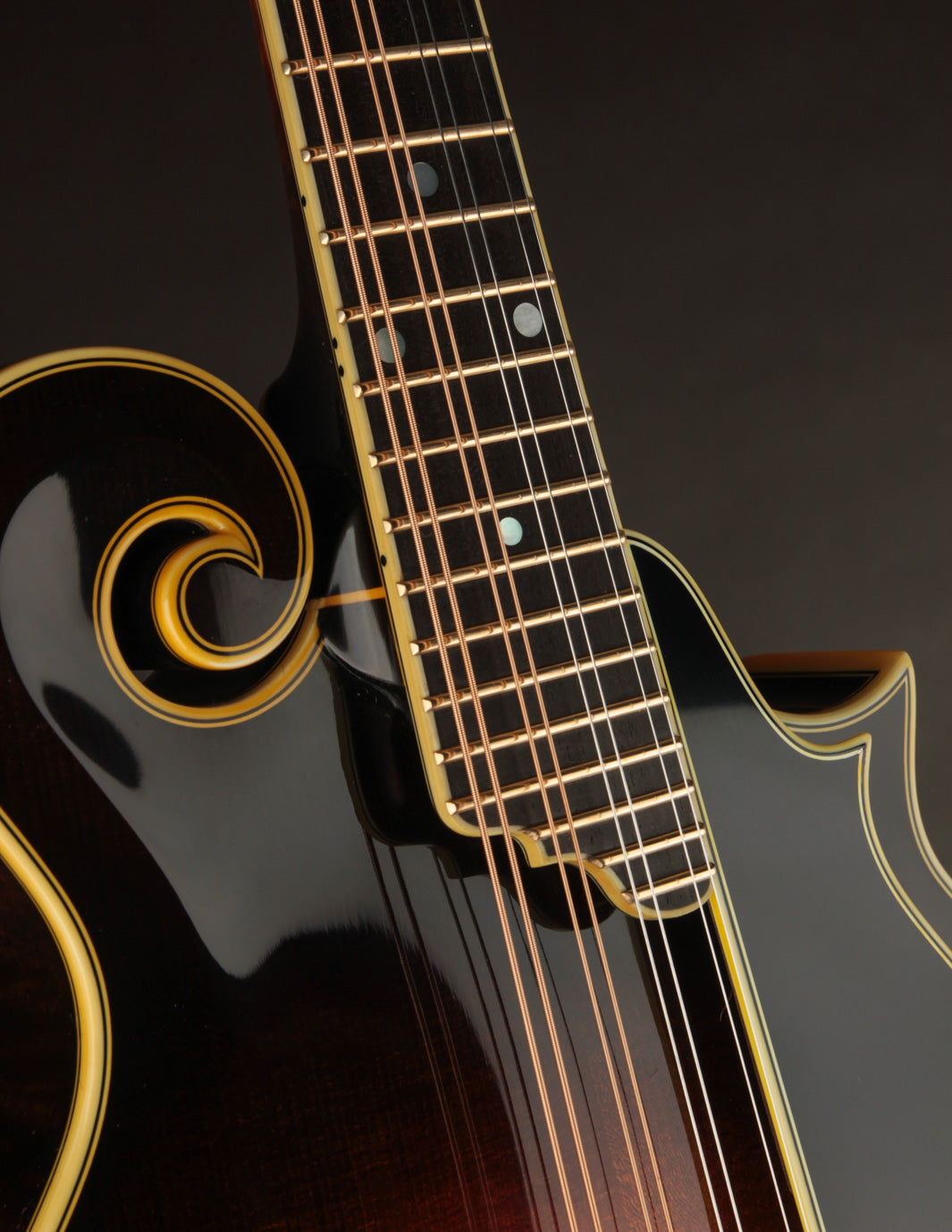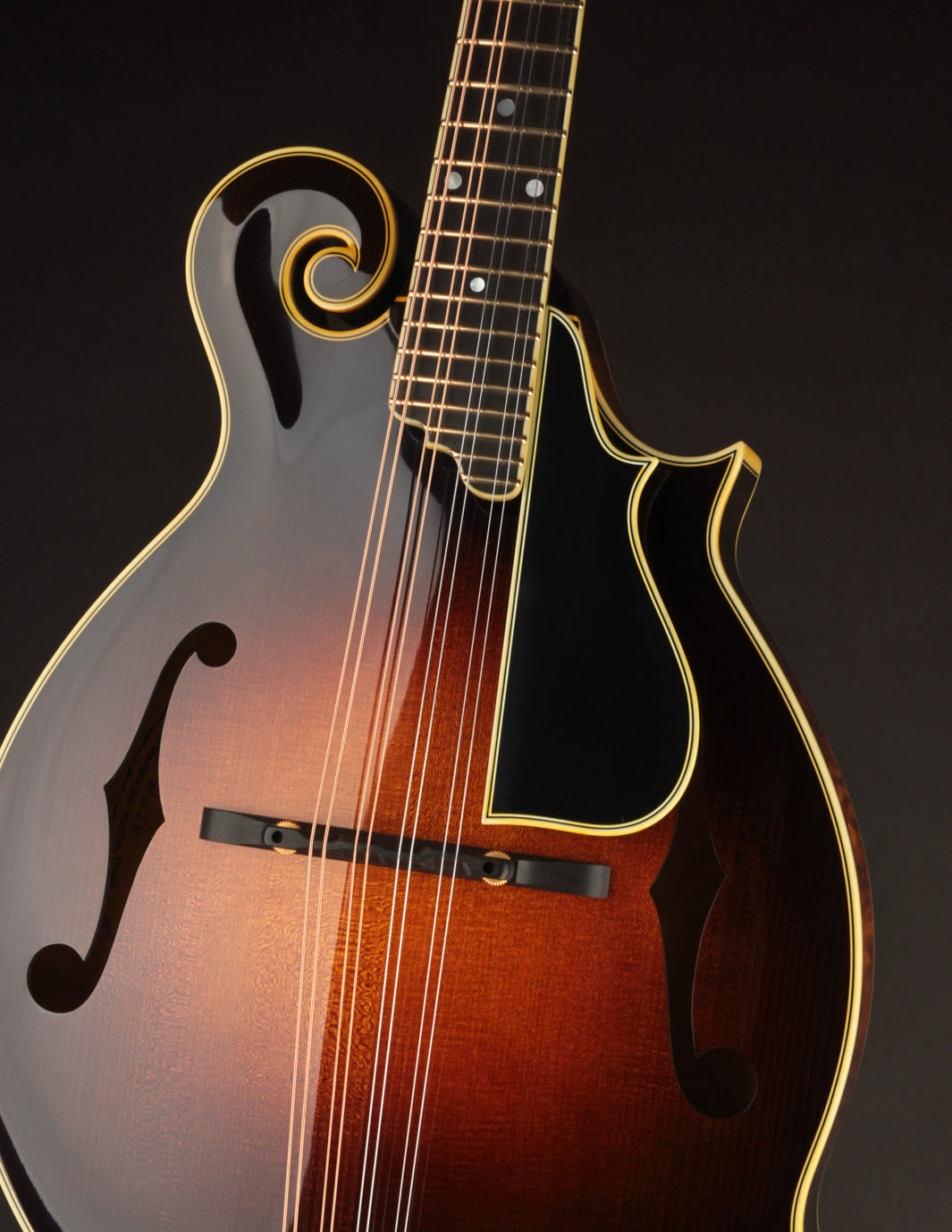 We're excited to offer this heirloom-quality F5 mandolin from the workshop of Tom Ellis. Cosmetics aside, an Ellis F5 Reserve offers the sort of tonal sophistication and workmanship a discerning player demands. Many great-looking mandolins built with quilted maple will hypnotize onlookers with the three-dimensional nature of the wood's figure ... but they sound a little timid. Not this one! Depth of tone, harmonic richness, sustain, power and pop--not only will this instrument record like a dream, it'll more than hold its own in a loud bluegrass jam. As for its looks? Well ... we're inclined to say there isn't a more finely built mandolin out there. From the picture-perfect tones of its sunburst, to the artistry of the inlay work, to Weldon Lister's engraving work on the tailpiece ... "flawless" just about sums it up. Have a look through our photo gallery for some detailed shots, and give us a call if you'd like an in-hand description. Priced with new Calton Case.