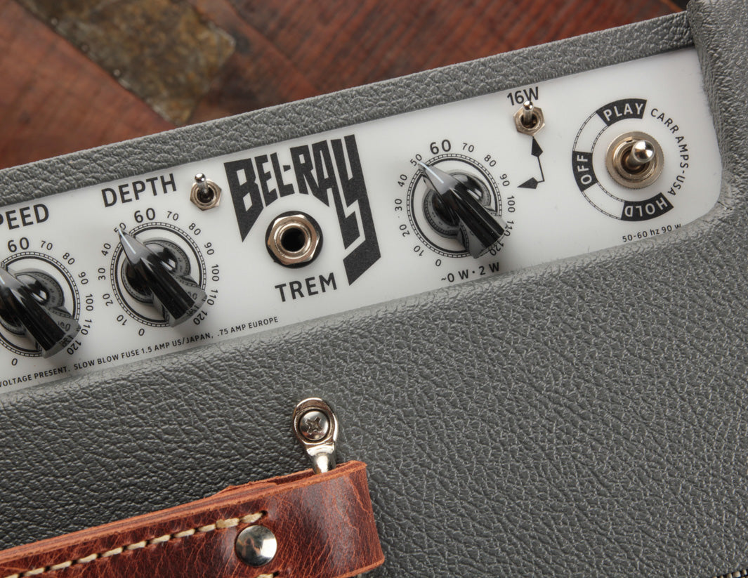 Atop this versatile foundation, the Bel-Ray carries the kind of feature set that has made Carr Amplifiers famous for their ability to deliver vintage-caliber tones to modern playing situations. The Level (aka Volume) control is coupled with a High/Low volume-taper toggle which selects between a direct signal or one with a partial Master Volume inserted after the following EF86 stage. In High, the volume comes on fast and furious, hitting the output stage harder for increased crunch. Set to Low, the volume rolls up gradually and drives the EL84s less aggressively, perfect for at-home nighttime playing and quieter settings.