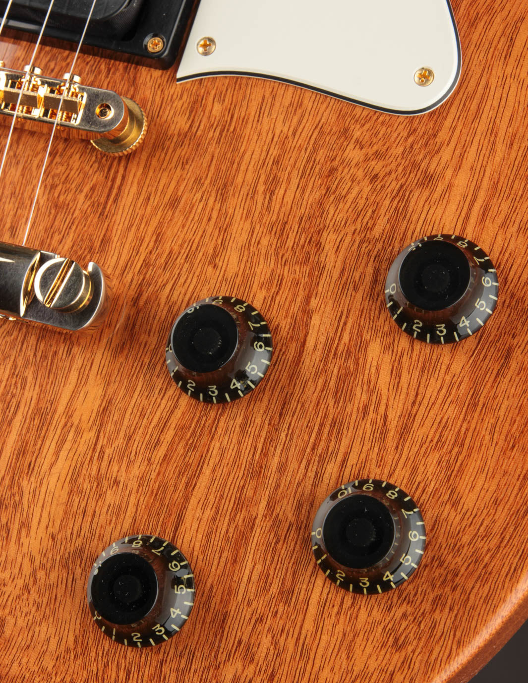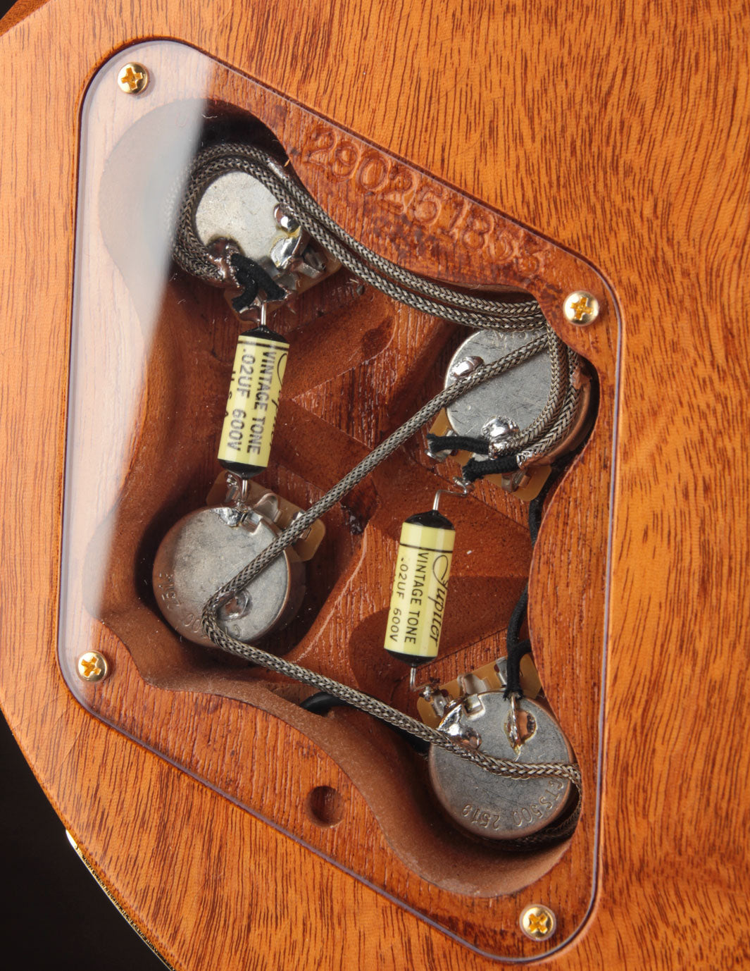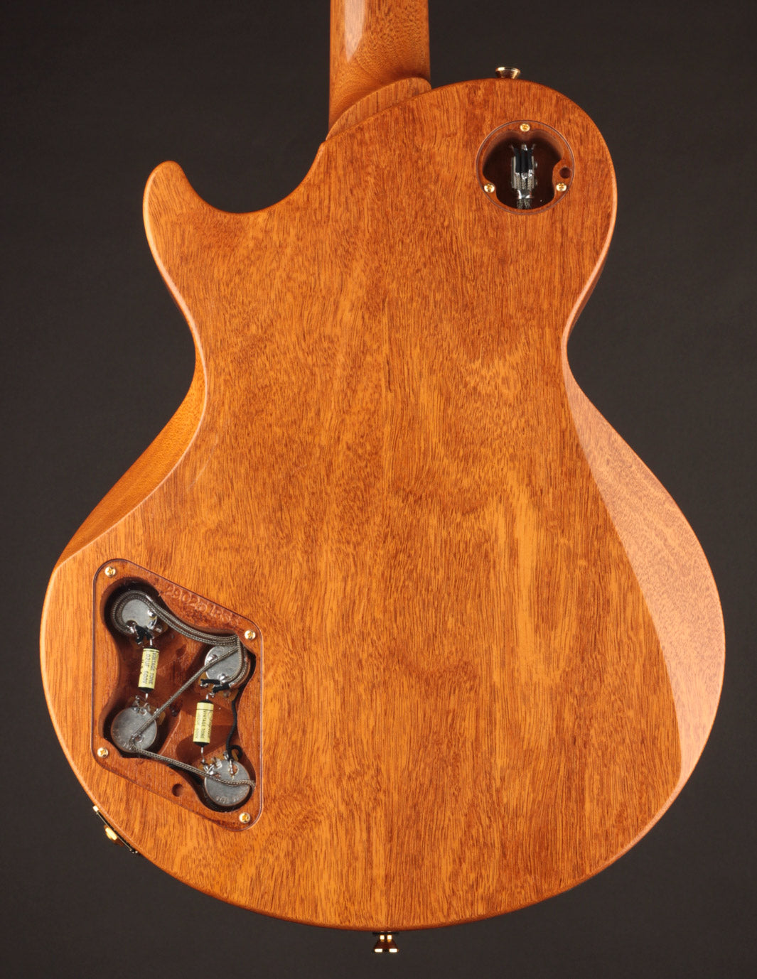 The first thing that probably jumps out is the use of Ron Ellis Bette humbuckers with exposed zebra bobbins. It's the first time Collings has used these fantastic handwound pickups in this configuration, and we frankly can't get enough of it. With the 3-ply parchment guard and black knobs playing off of the pickups, the aged gold hardware adds another layer of dimension to the pseudo-prototype vibe of this 290. The aesthetic is as alluring as its tone, no doubt.
