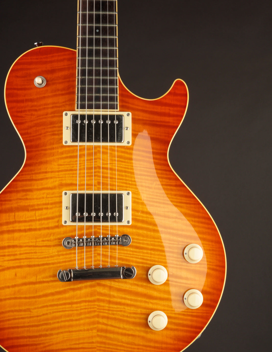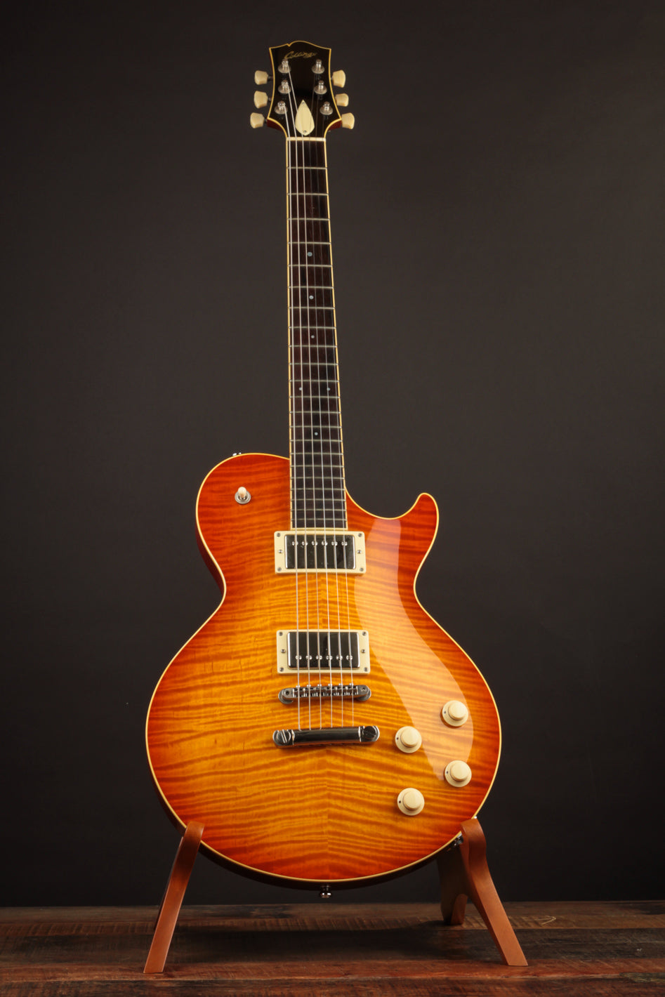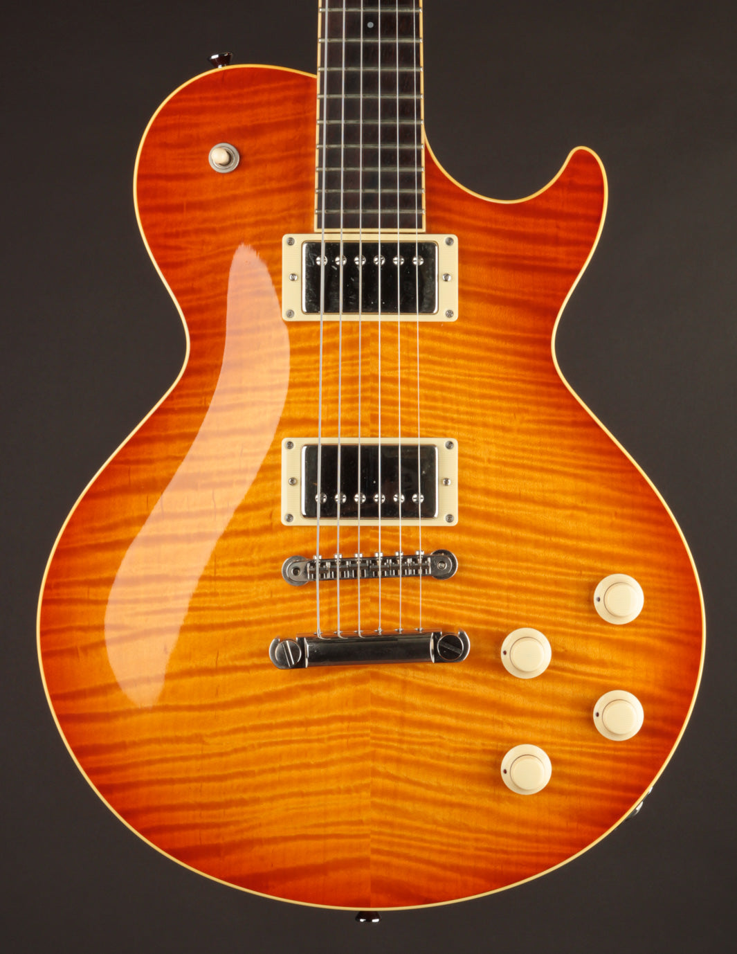 This build features some beautiful tight-grained Figured Maple for the top wood with a beautiful Iced Tea Sunburst top finish that really makes all of the grained Ivoroid treatment pop. A nice, dark Madagascar Rosewood fingerboard is inlaid with the classic pearl dots, allowing the Rosewood to take center stage. The Lollar Imperial humbuckers bring equal parts authority and vintage warmth to the table, matching the dynamic acoustic response of this low 8lb solidbody in convincing fashion.