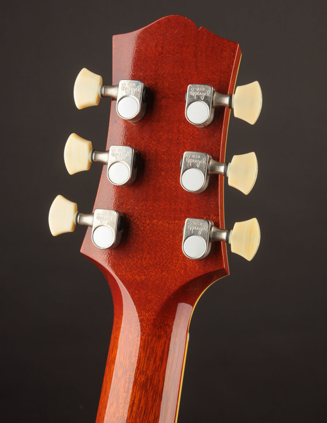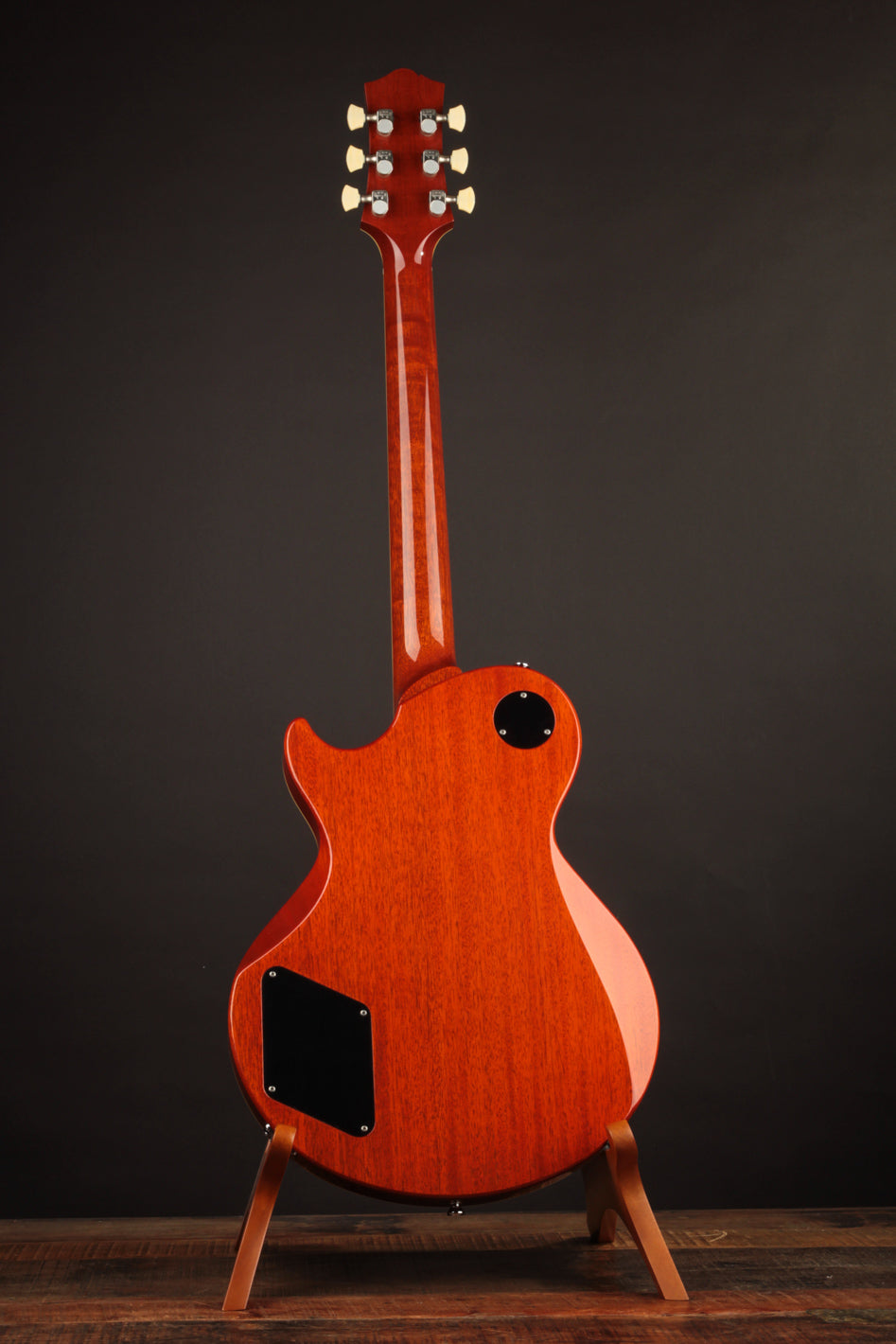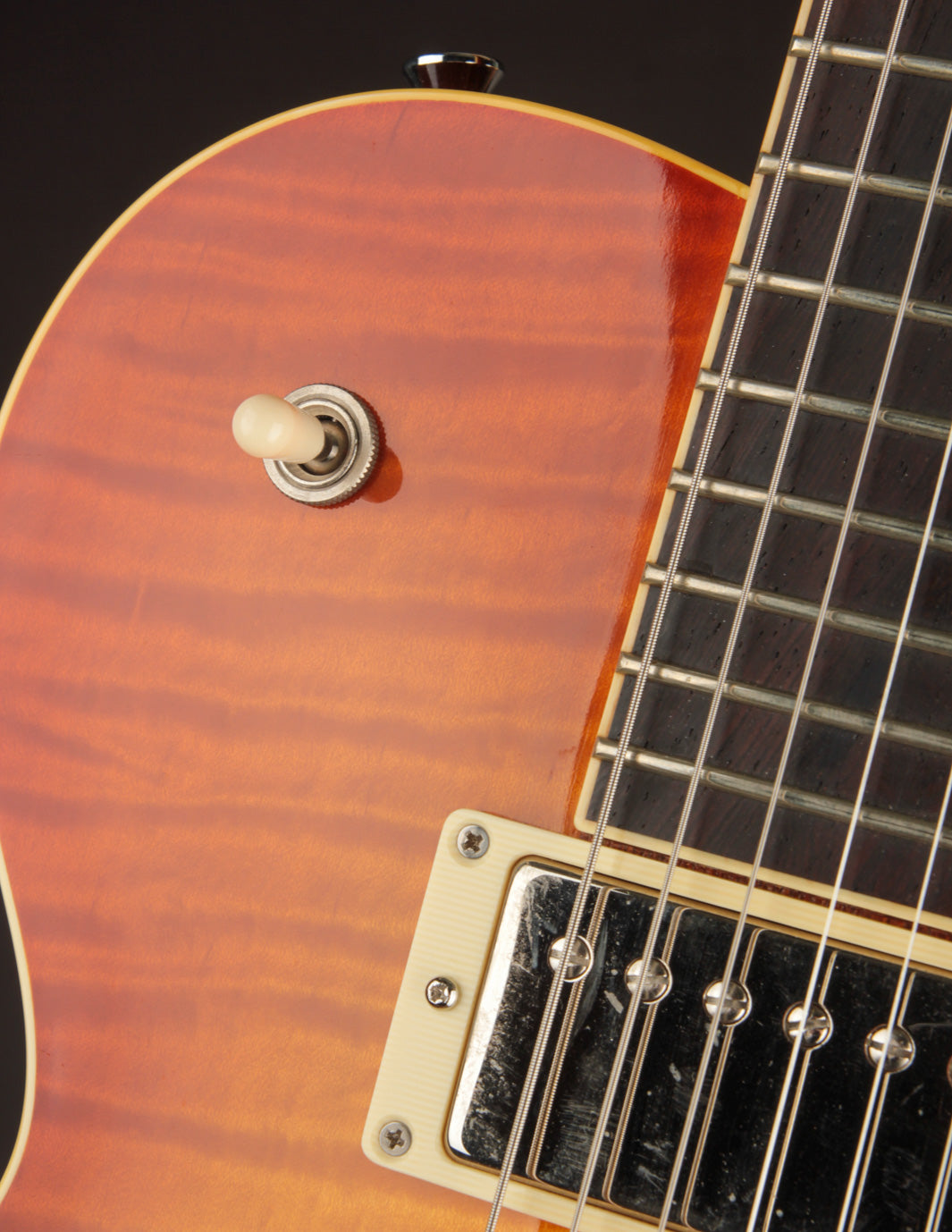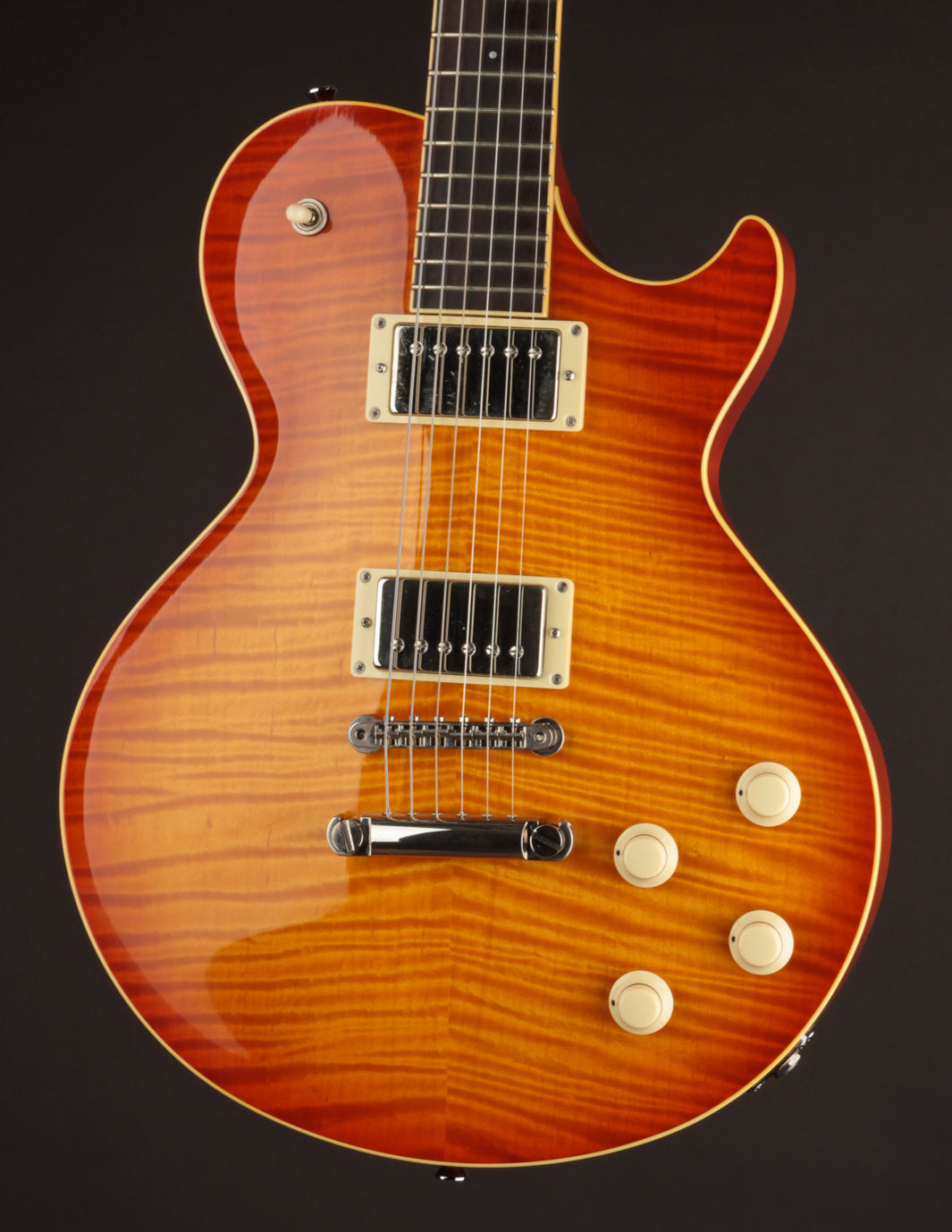 This build features some beautiful tight-grained Figured Maple for the top wood with a beautiful Iced Tea Sunburst top finish that really makes all of the grained Ivoroid treatment pop. A nice, dark Madagascar Rosewood fingerboard is inlaid with the classic pearl dots, allowing the Rosewood to take center stage. The Lollar Imperial humbuckers bring equal parts authority and vintage warmth to the table, matching the dynamic acoustic response of this low 8lb solidbody in convincing fashion.