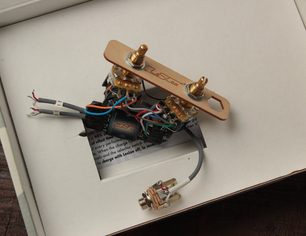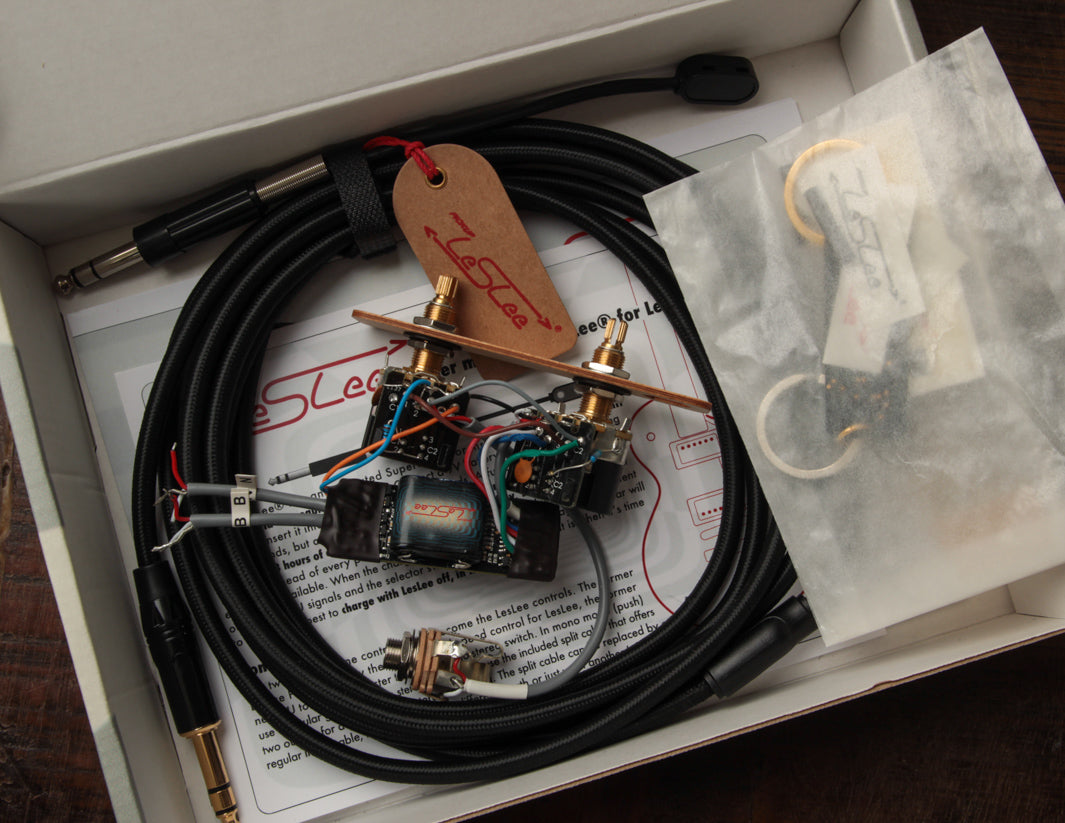 LesLee® unit for Gibson Les Paul® includes charge cable, stereo output cable & printed manuals. Operated by two push/pull pots. Please check your current shaft lengths and order accordingly.