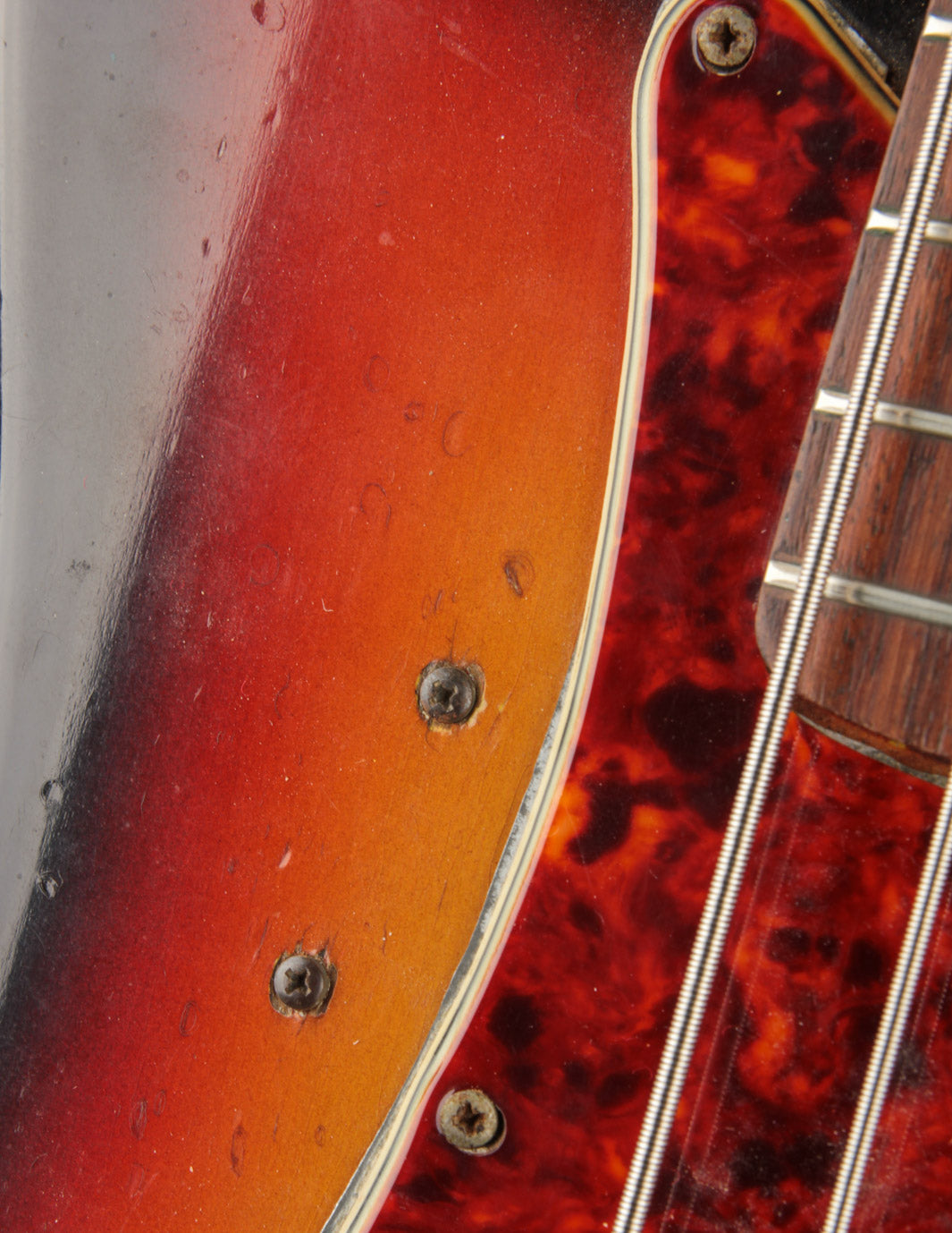 It's got the classic 3-tone Sunburst with a more opaque yellow center of the era, and check out that solar flare pattern in the original tortoiseshell pickguard! The original grey bobbin pickup sounds excellent as well. It comes with its original Fender hardshell case that has also remained in great shape.