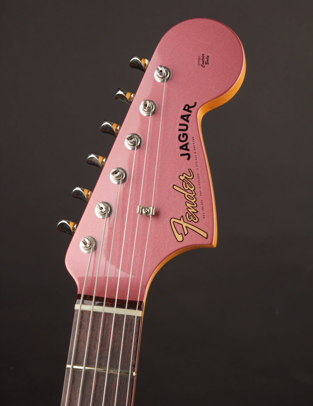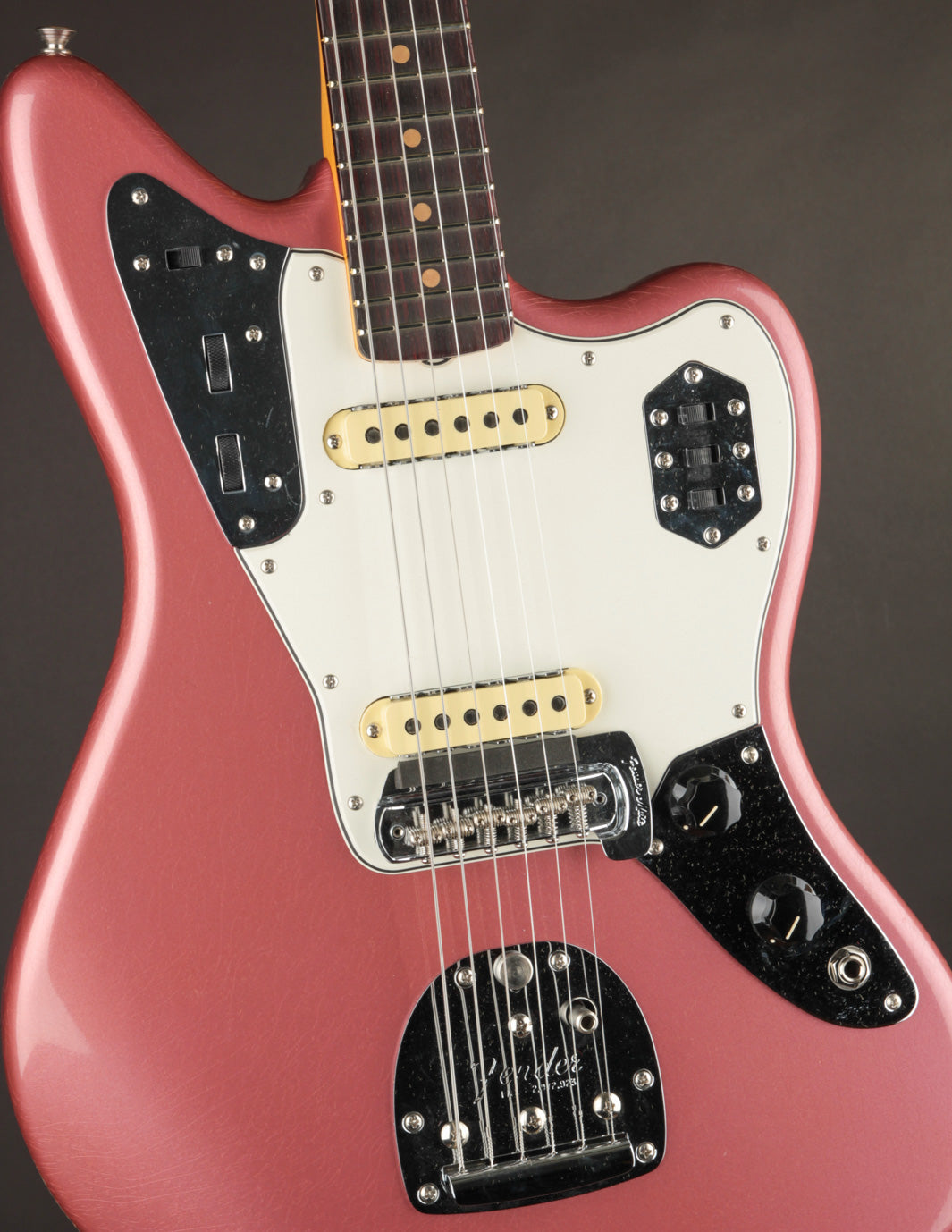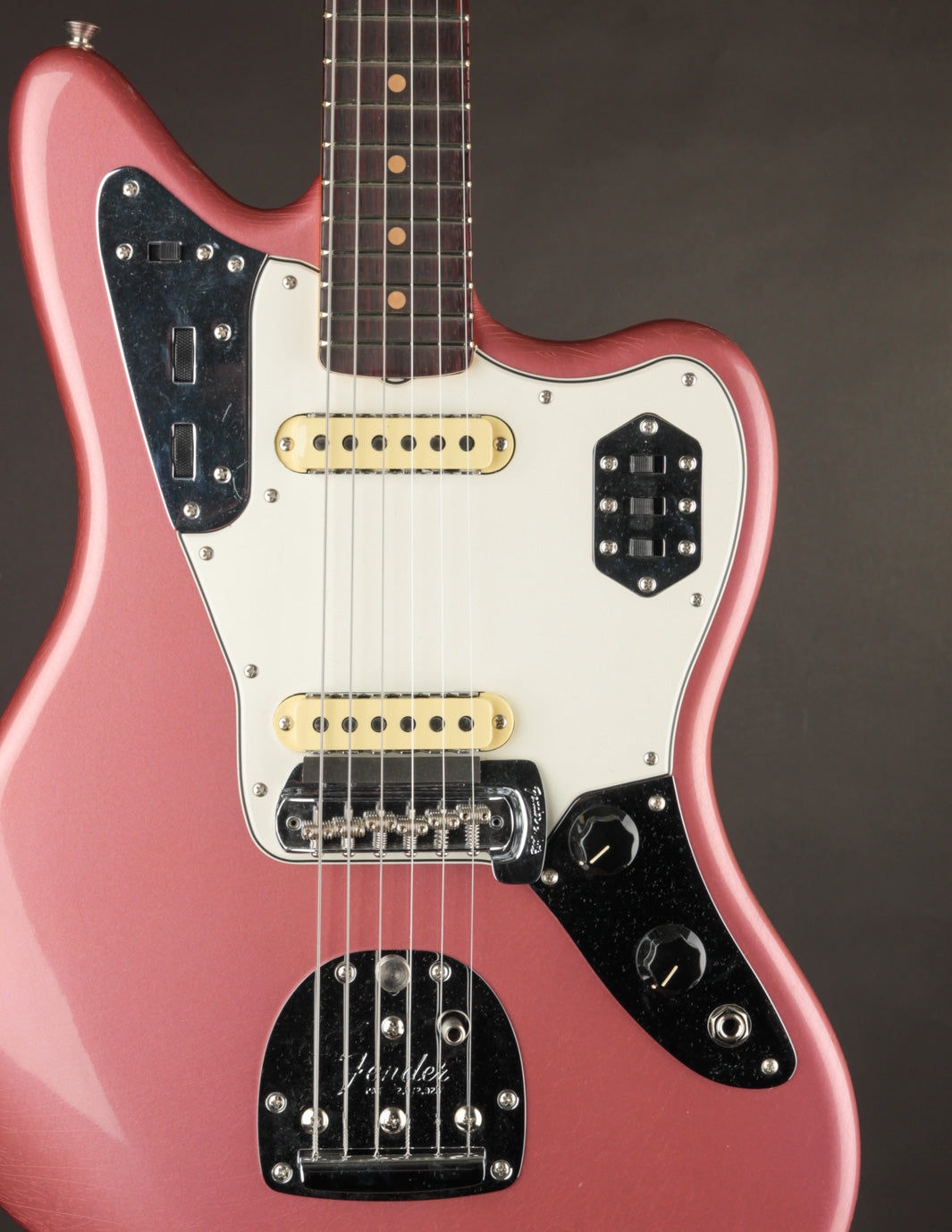The rift sawn maple neck has a ’62 “Jaguar C” profile, 9.5”-radius round-lam rosewood fingerboard and 22 narrow tall (6105) frets for smooth play up and down the neck. The 62 flat-pole Jaguar pickups deliver classic Jaguar bite which lives, to our ears, in the Strat world for a reference.