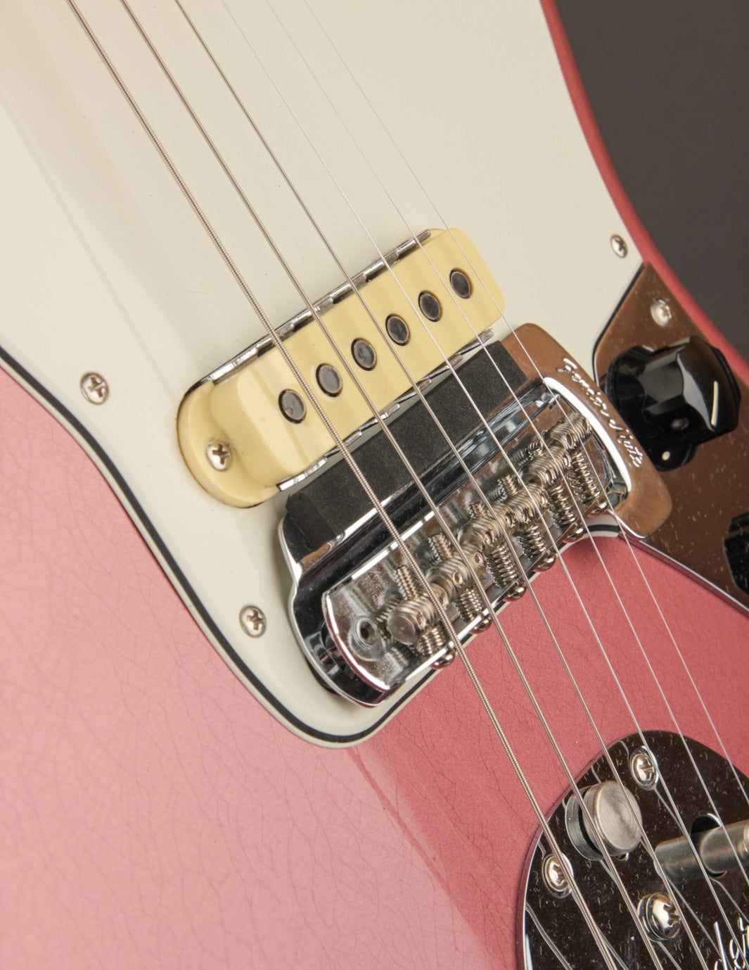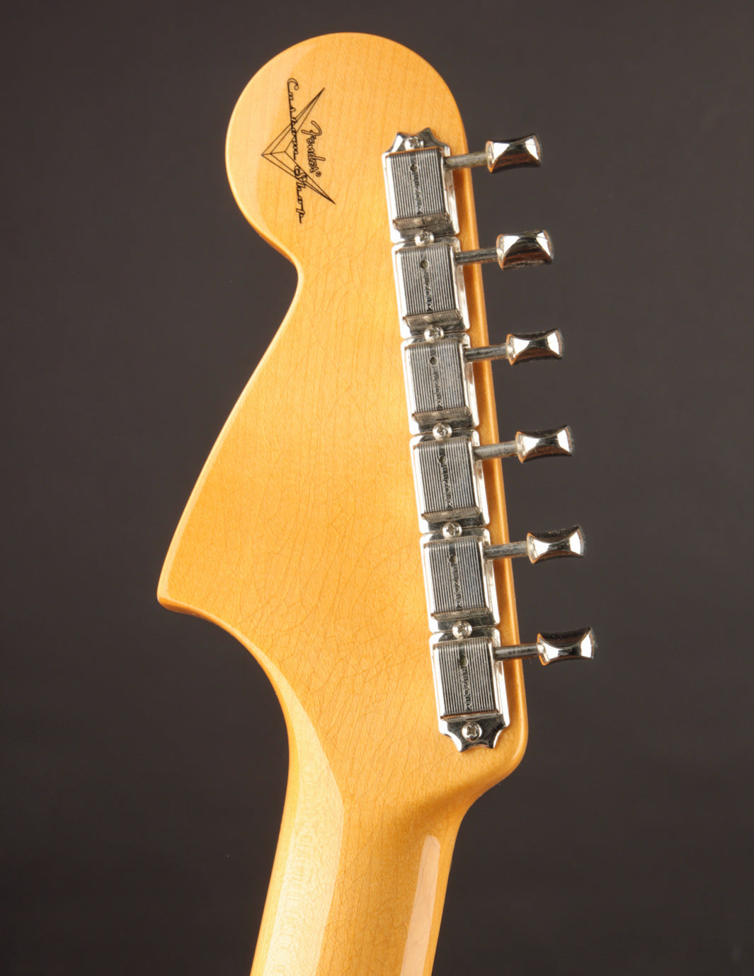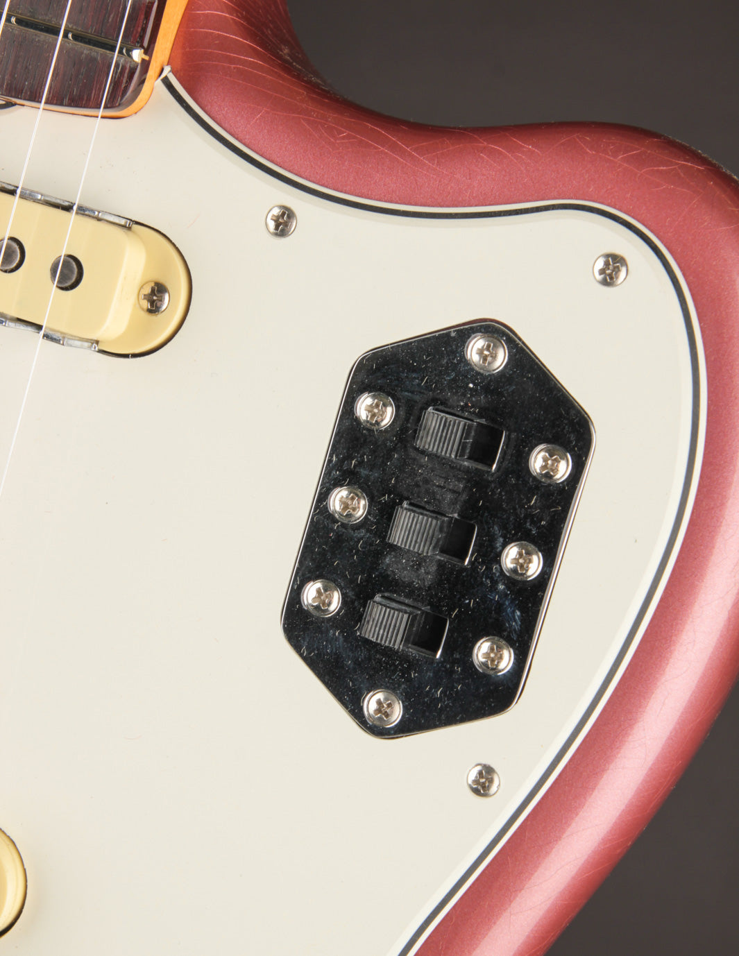 The rift sawn maple neck has a ’62 “Jaguar C” profile, 9.5”-radius round-lam rosewood fingerboard and 22 narrow tall (6105) frets for smooth play up and down the neck. The 62 flat-pole Jaguar pickups deliver classic Jaguar bite which lives, to our ears, in the Strat world for a reference.