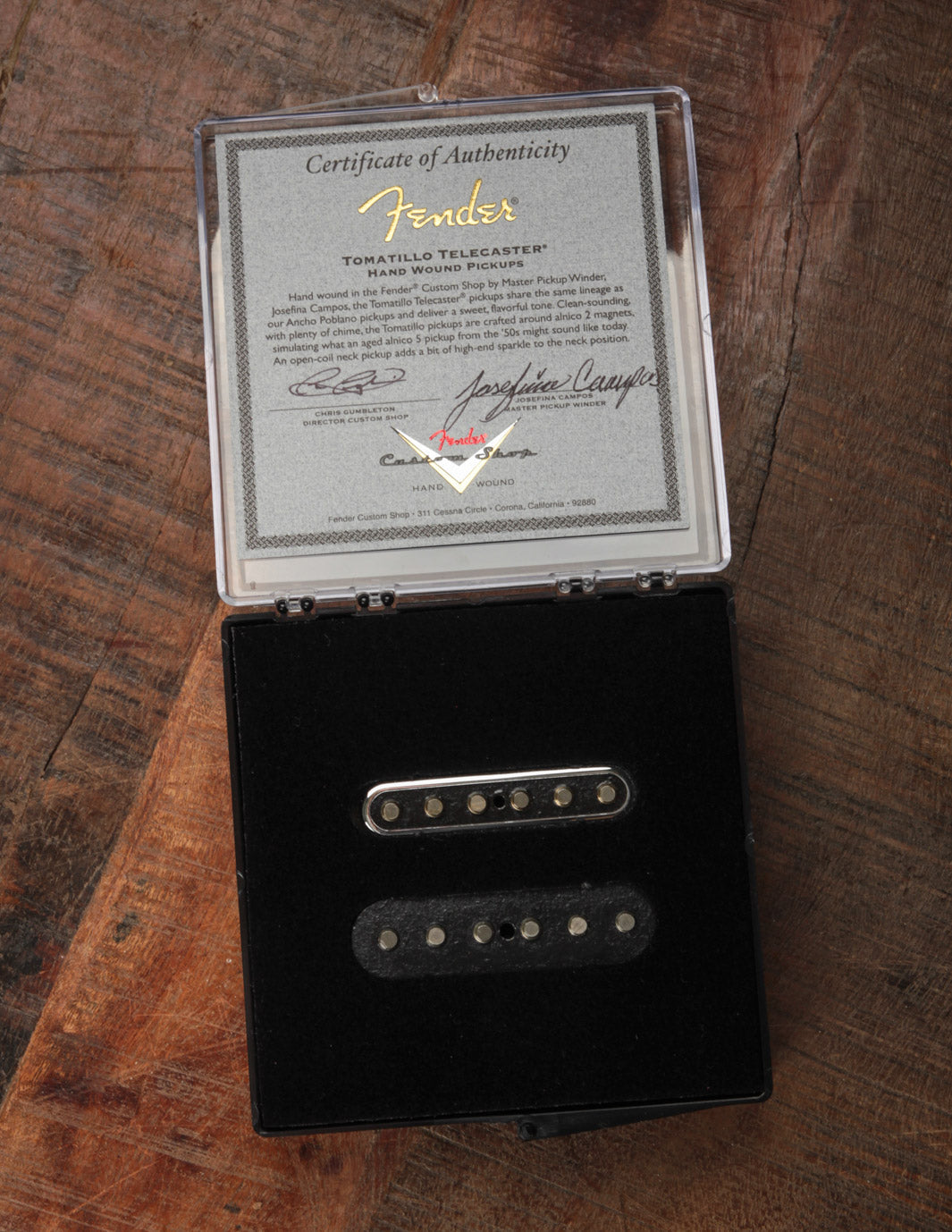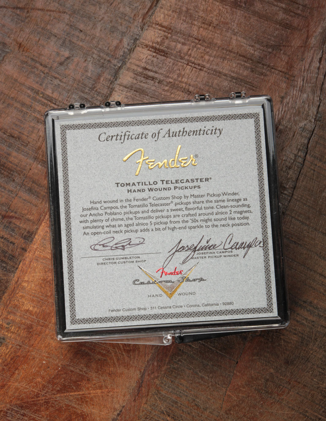 The Tomatillo Tele pickups, hand-wound by Josefina Campos in the Fender Custom Shop, offer sweet, vintage-inspired tones with alnico 2 warmth, clear chime, and just the right amount of sparkle.