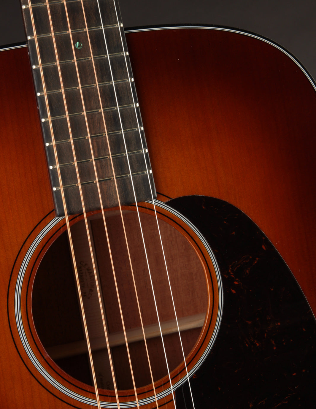 I love Martin's "Ambertone" finish inspired by the slightly-more-monochromatic shaded tops seen on many smaller-bodied guitars in 1932 and 1933. This finish predates what we think of as a 'Sunburst' ~ where the middle of the guitar's top is much more orange, the edges much closer to black, and the graduation of the shading less subtle. There was no such thing as a 14-fret dreadnought in 1932 or 1933; but a pre-war, Ambertone-finished D-18 would certainly be a dream guitar for many of us (myself included).