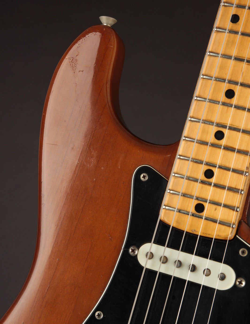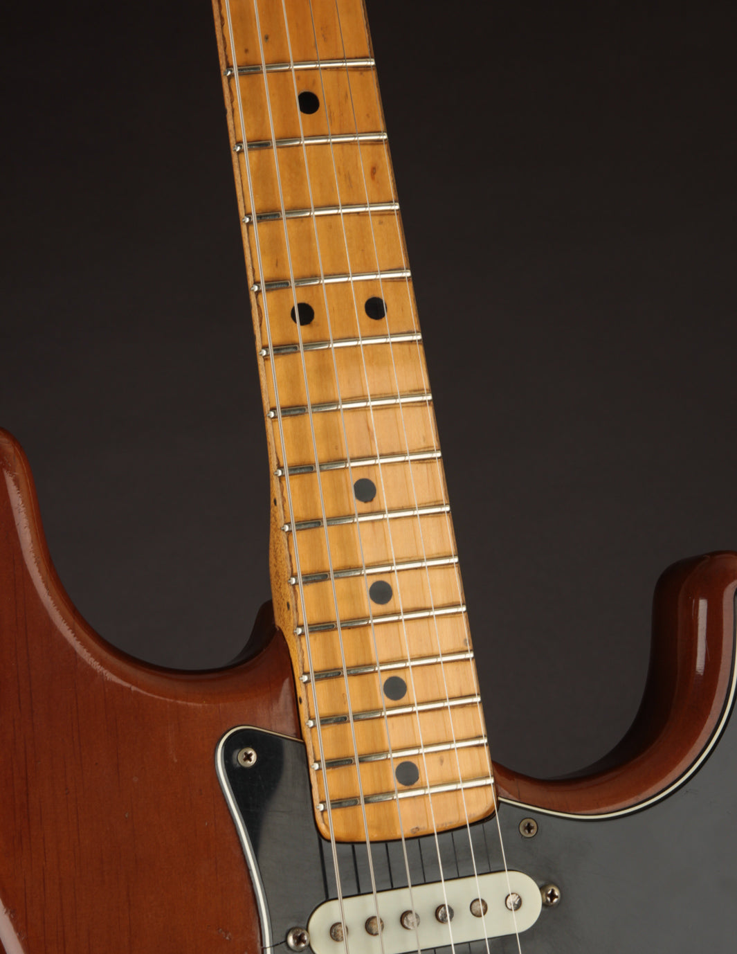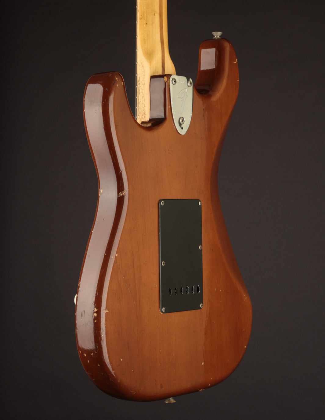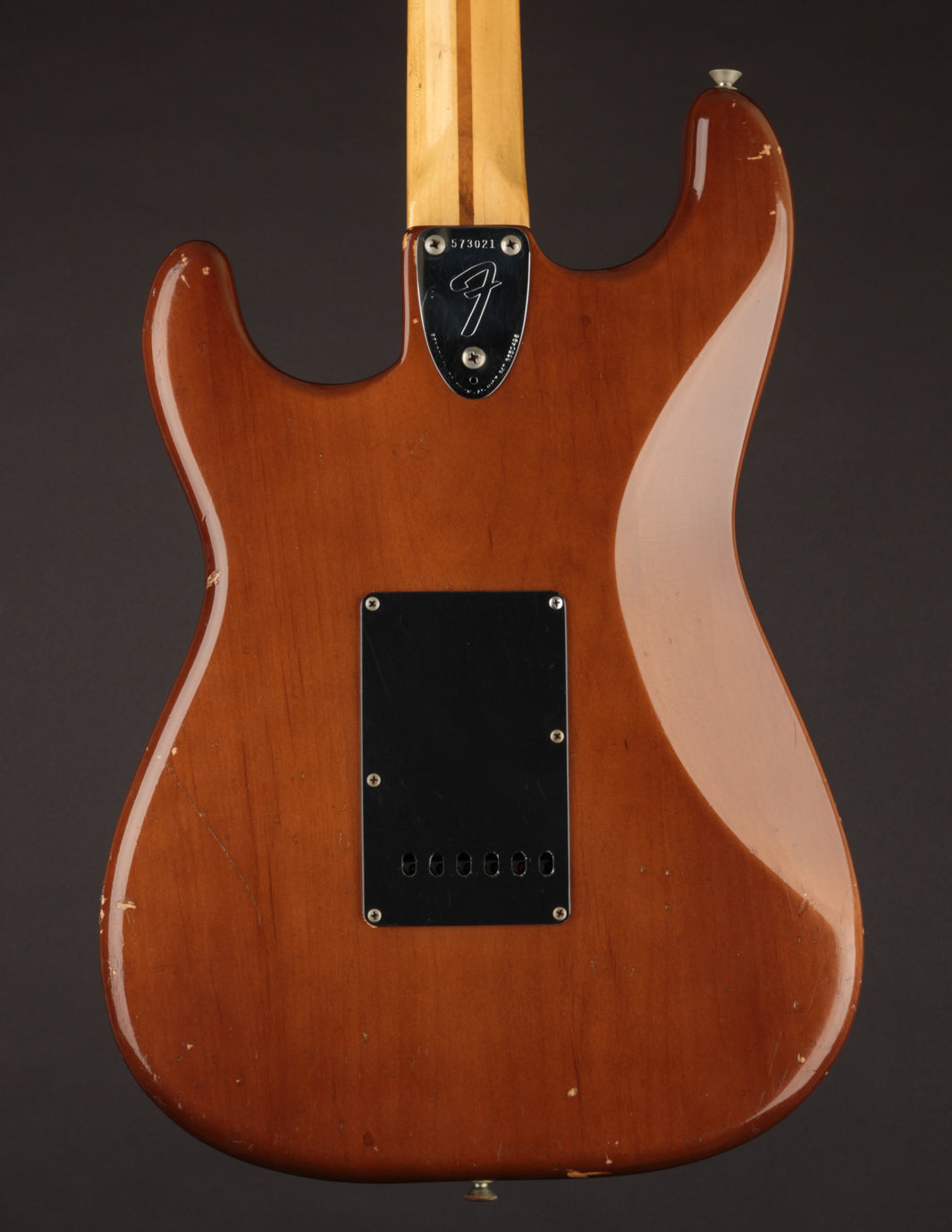 Coming in a few ounces under 8lbs makes this one quite light, especially for a mid 70s Fender solidbody. It's very well balanced and comfortable. Condition is Very Good, with typical nicks and dings on the body and pick wear on the pickguard. The neck shows lots of natural play wear but without impacting playability.