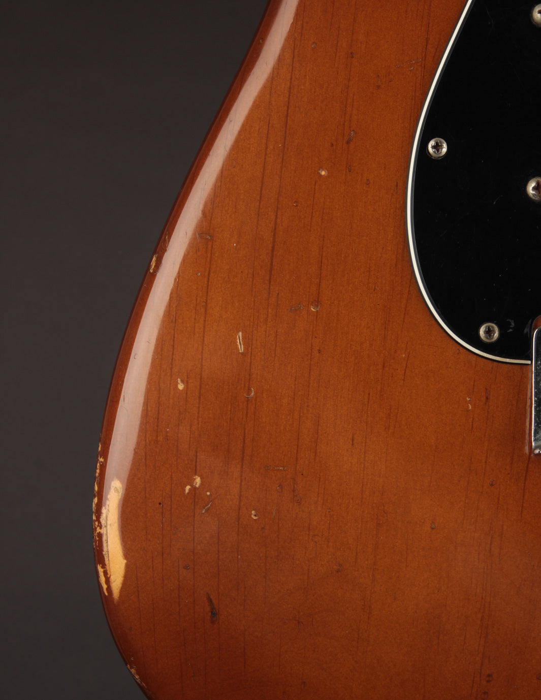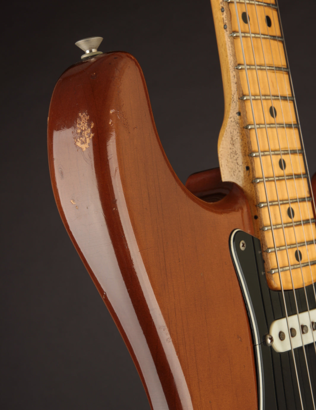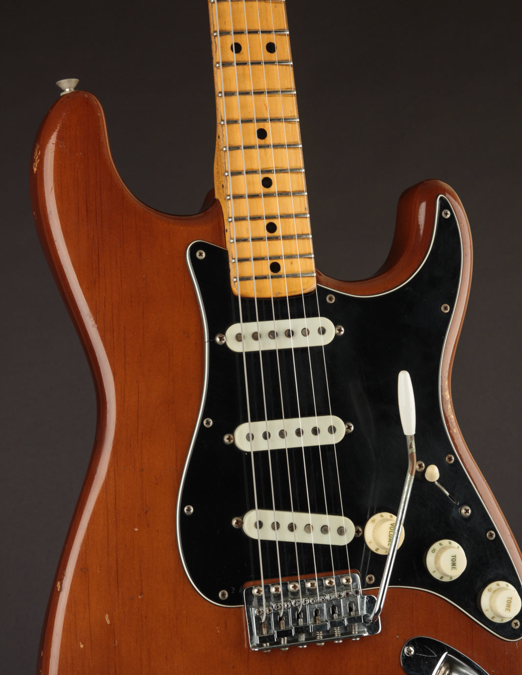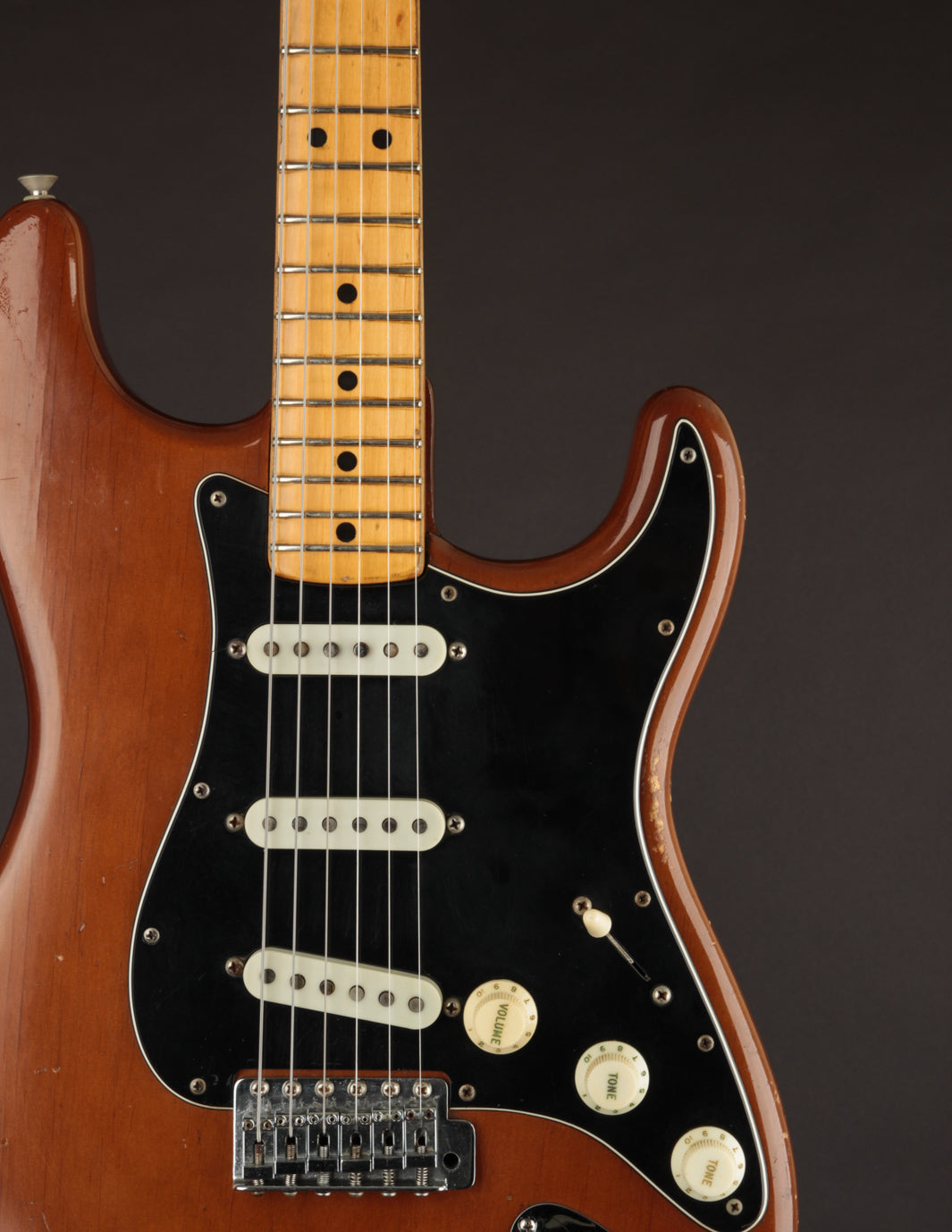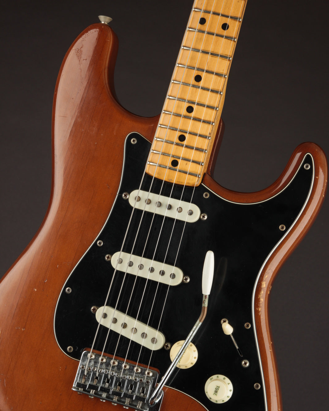 Coming in a few ounces under 8lbs makes this one quite light, especially for a mid 70s Fender solidbody. It's very well balanced and comfortable. Condition is Very Good, with typical nicks and dings on the body and pick wear on the pickguard. The neck shows lots of natural play wear but without impacting playability.