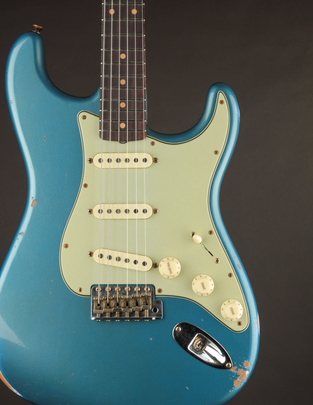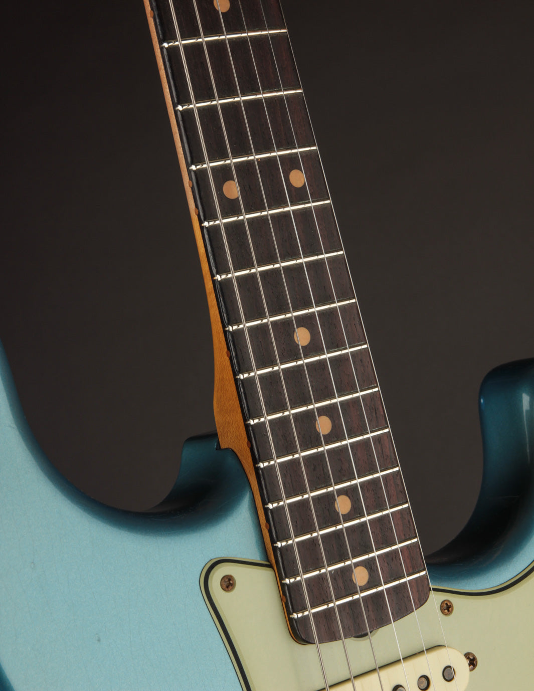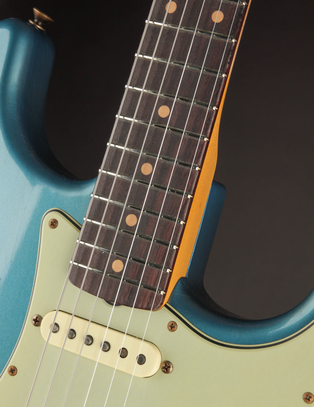 It’s a quartersawn maple neck with a comfortable ’60s Oval “C” profile and a 3A rosewood fingerboard. On paper, it sounds straightforward enough, but in hand it’s something special - slim in the cowboy chord area, gradually filling out as you move up the neck without ever feeling bulky (.79"–.93" for those keeping score). Paired with a 7.25"–9.5" compound radius and vintage-style frets, it’s a neck that will feel right at home for almost any player, unless you live exclusively at either extreme - super fat or razor thin. The perfectly smooth, worn-in finish on the back makes it a joy to play for hours.