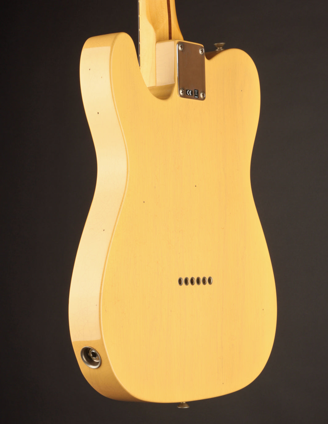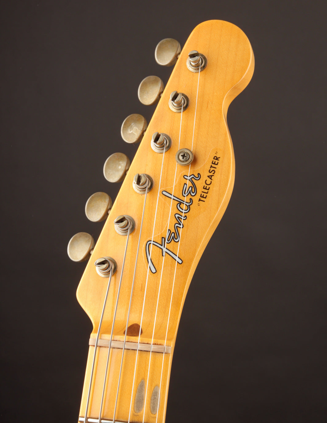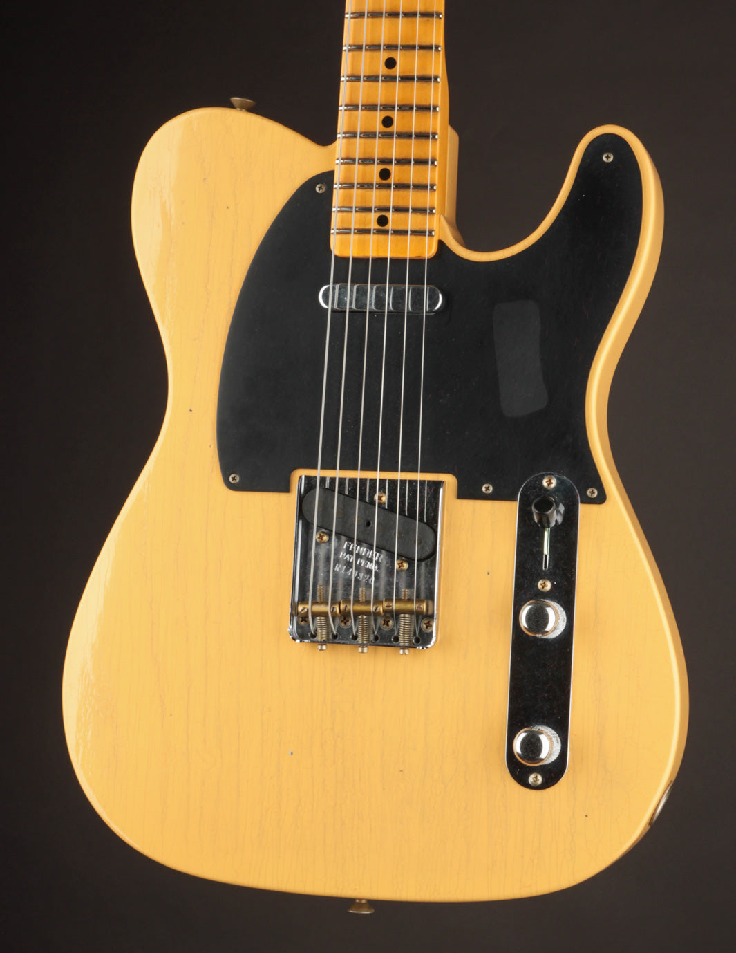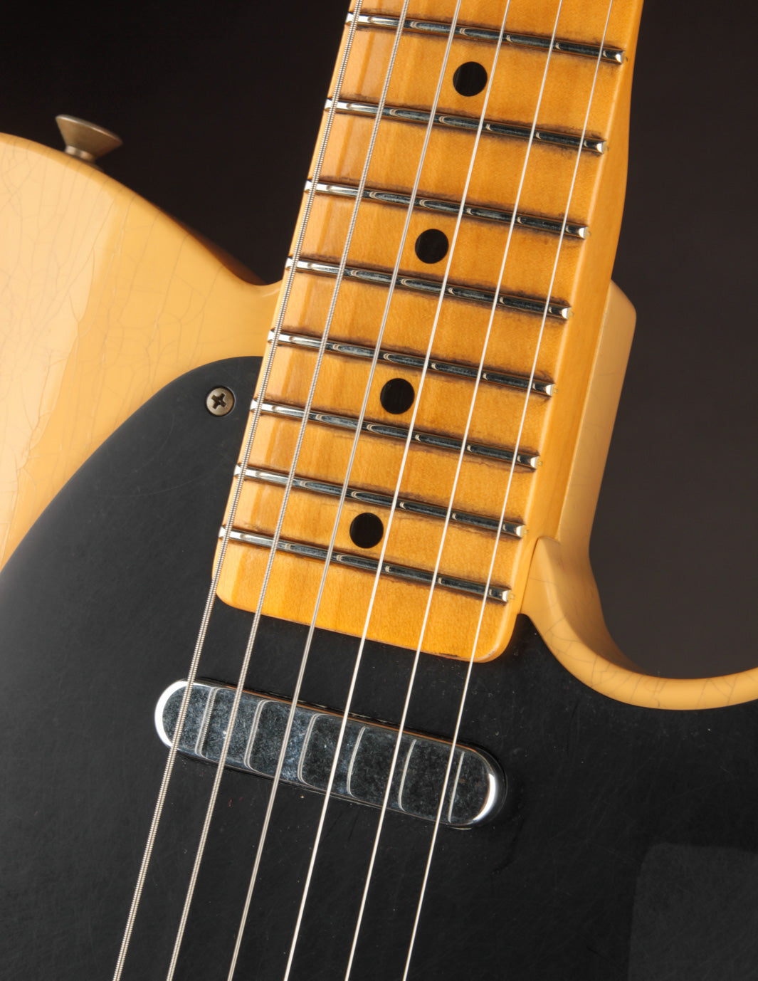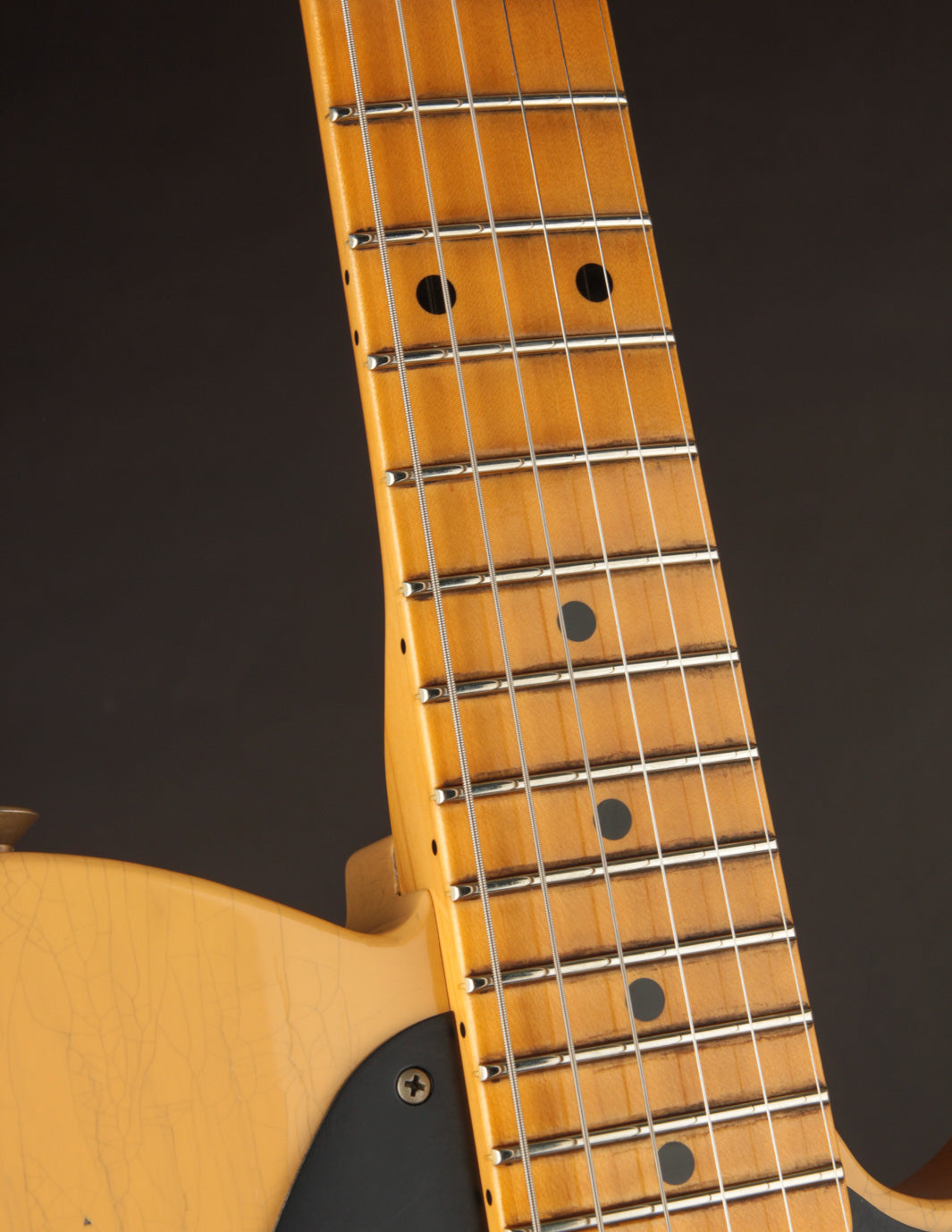 With this idea as our starting point, we tried to get as close as possible to the vibe, feel, tone, and specs of the old guitars - in this case, a '53 Tele. Ash body, vintage blonde nitro finish, round string tree, serial number stamped on the bridge plate (vs the neck plate), flat pole bridge pickup...the only modern touches we spec'd were a 7.25-9.5" compound radius and modern wiring. To our hands, a 7.25" radius is part of the Fender magic, while the 9.5" higher up on the fingerboard insures easy bending. Perfect!