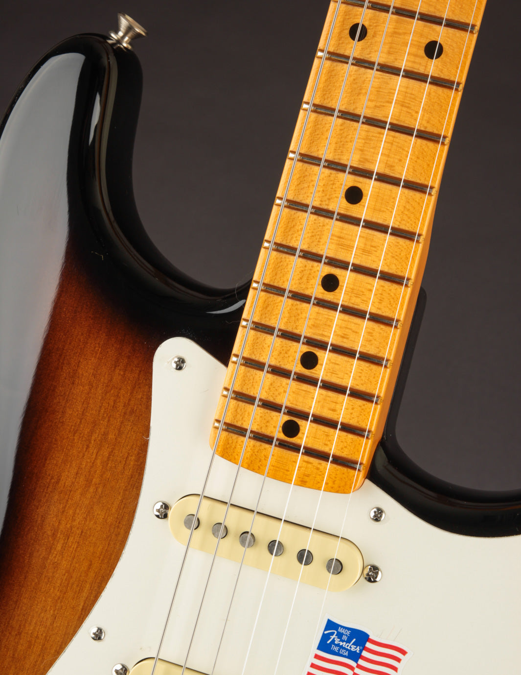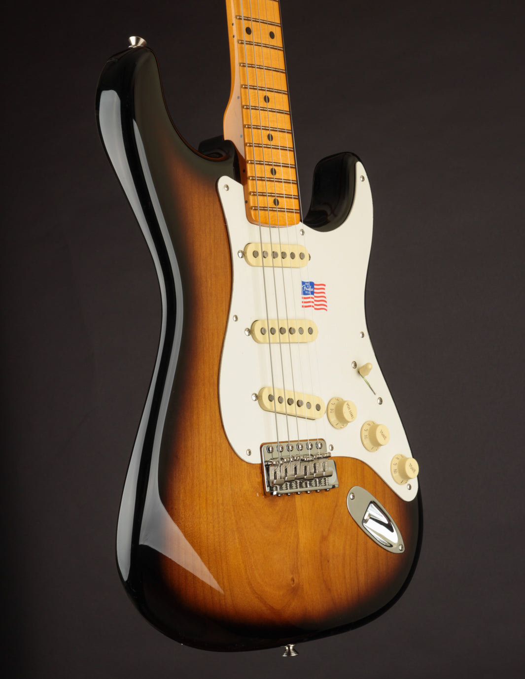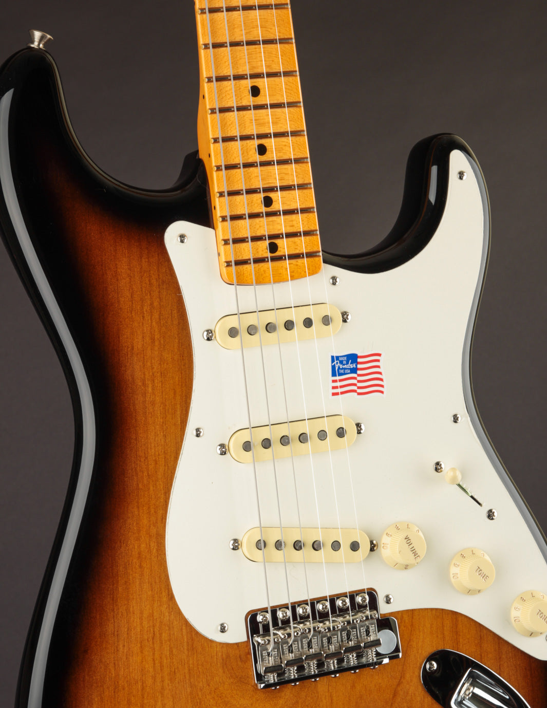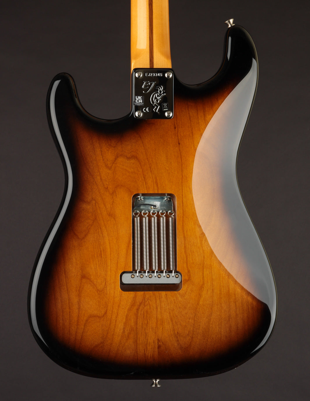 Staggered vintage-style tuners; no string tree on the headstock; deep 1957-style body contours and cavities; one-piece vintage-tint quartersawn maple neck (contours sanded very smooth) with a ’57-style “soft V” neck carve; specially voiced Eric Johnson single-coil pickups with countersunk screws; vintage-style tremolo with silver-painted block; ’57-style string recess; no paint between base plate and block; five springs (no tremolo cover)...