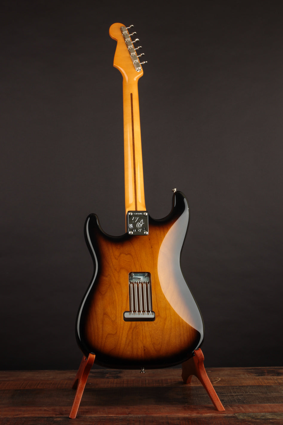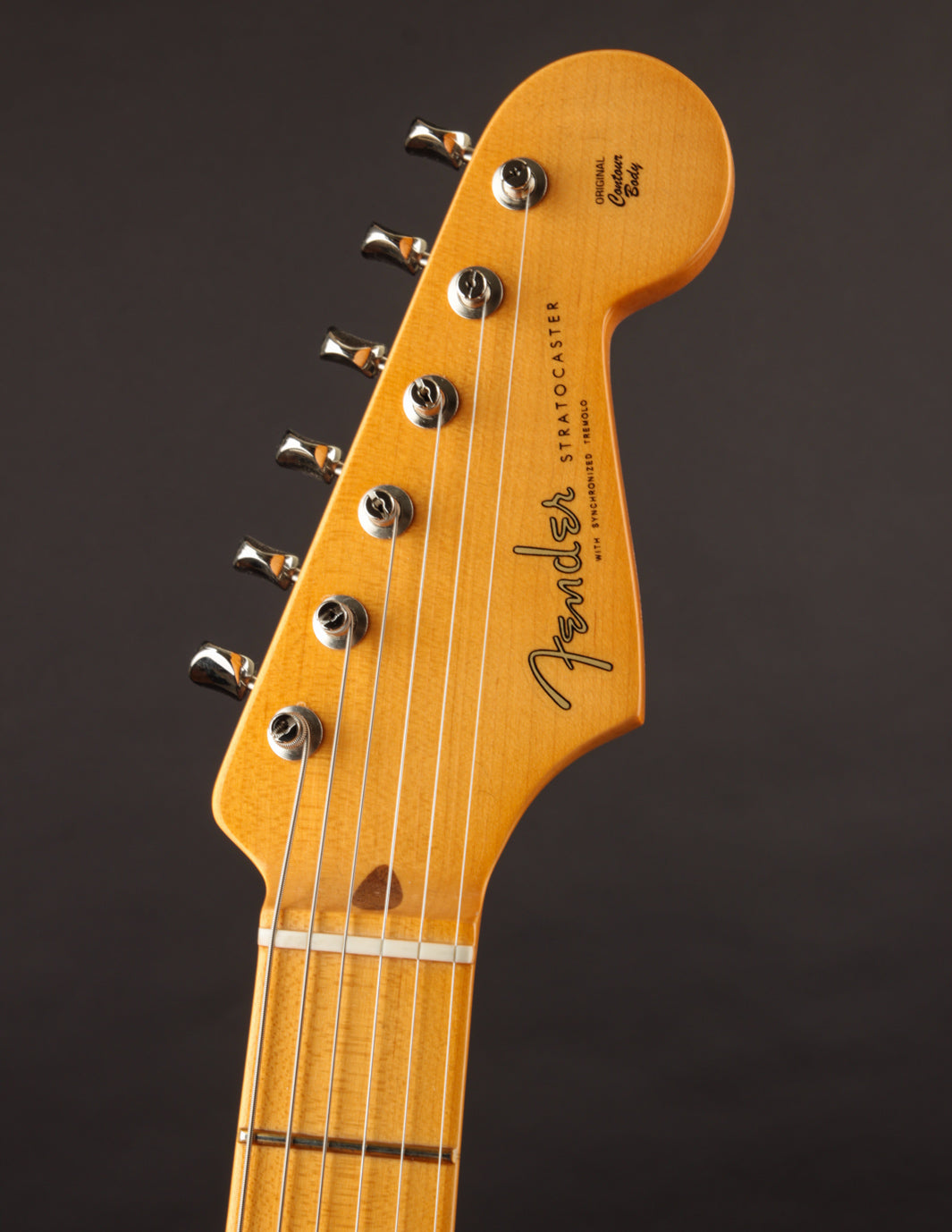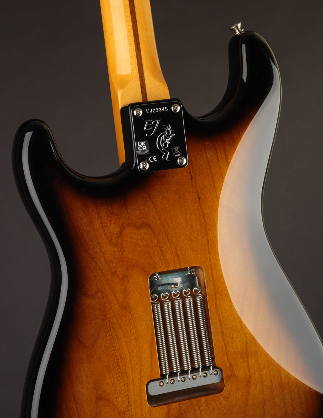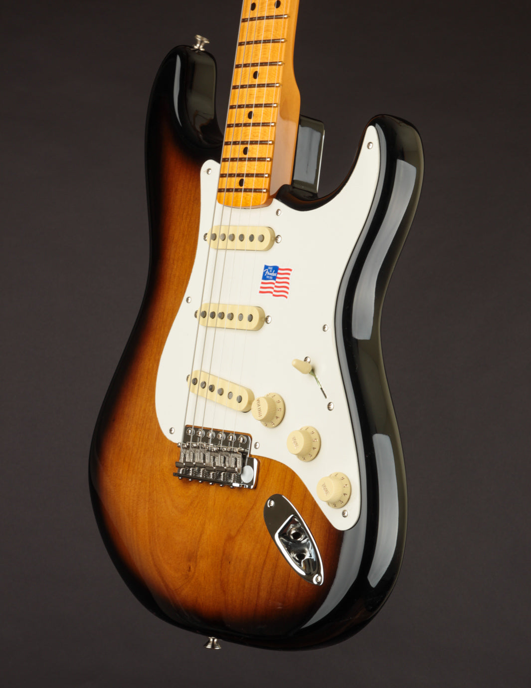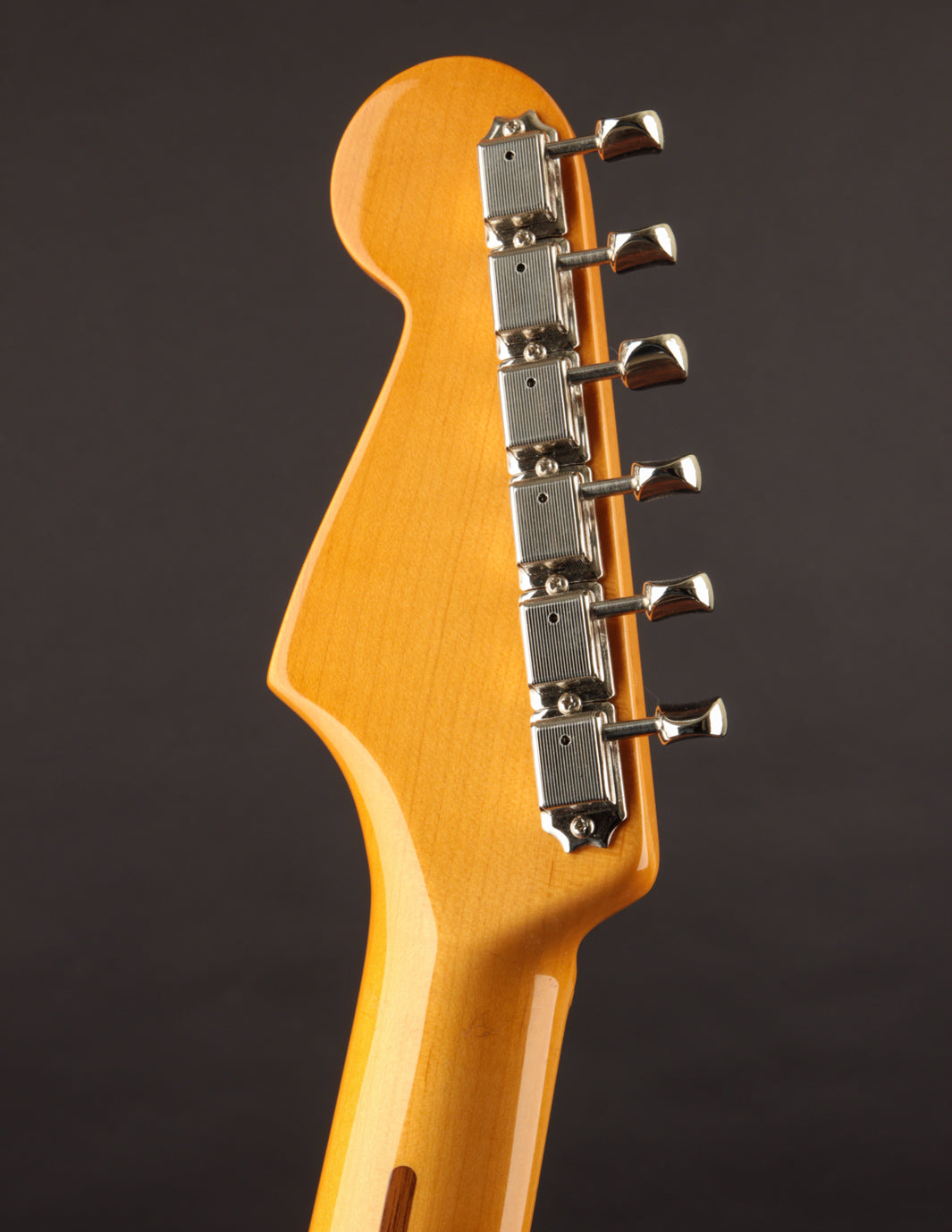 Staggered vintage-style tuners; no string tree on the headstock; deep 1957-style body contours and cavities; one-piece vintage-tint quartersawn maple neck (contours sanded very smooth) with a ’57-style “soft V” neck carve; specially voiced Eric Johnson single-coil pickups with countersunk screws; vintage-style tremolo with silver-painted block; ’57-style string recess; no paint between base plate and block; five springs (no tremolo cover)...
