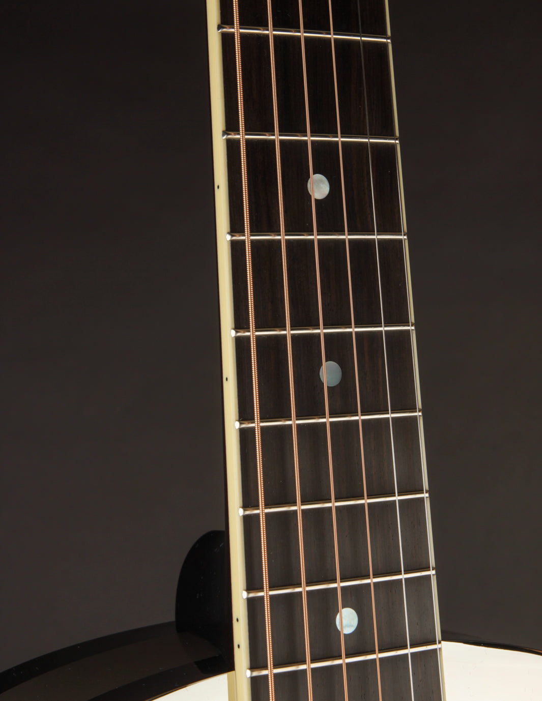 The maple neck is finished in a traditional sunburst and capped by an ivoroid-bound ebony fretboard topped by vintage-style engraved tuners.