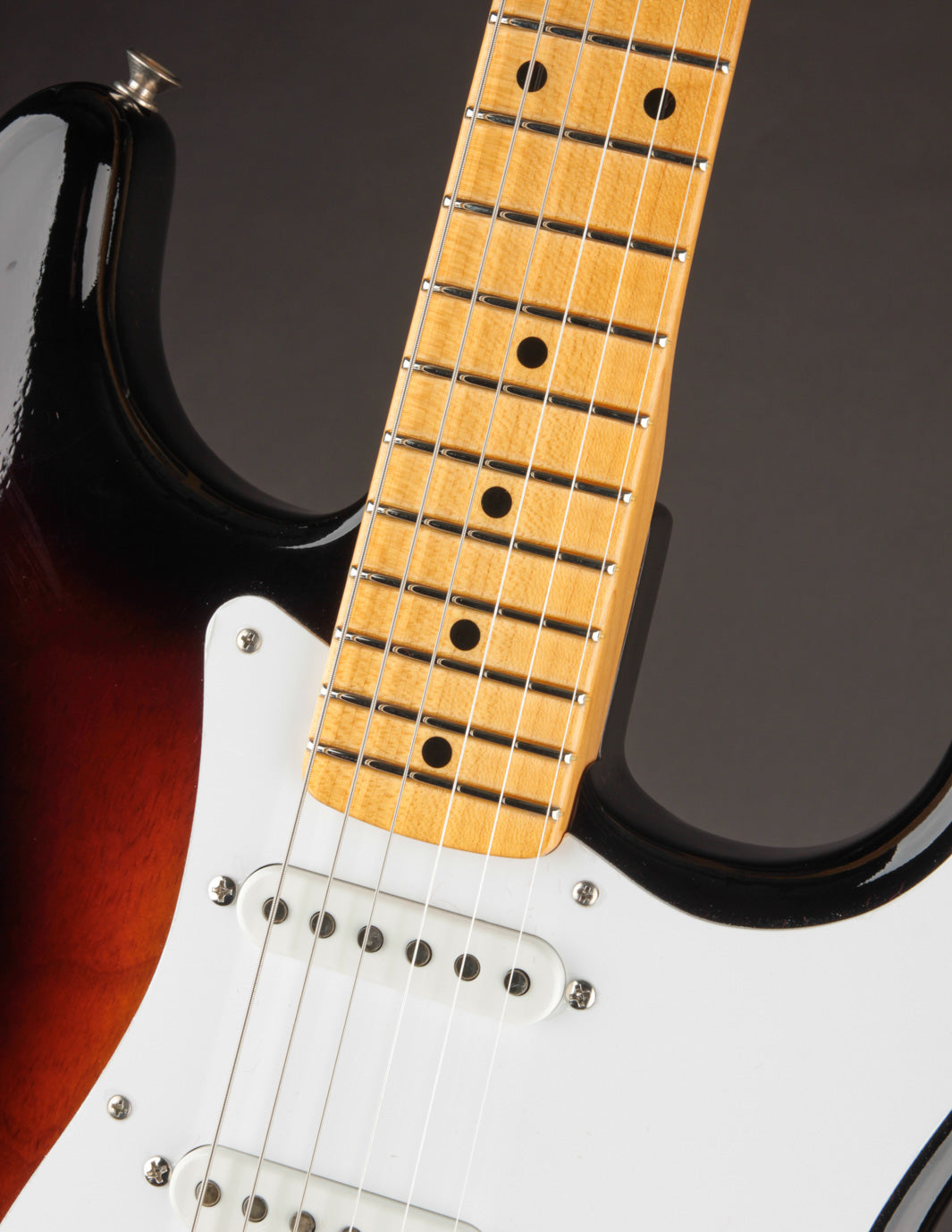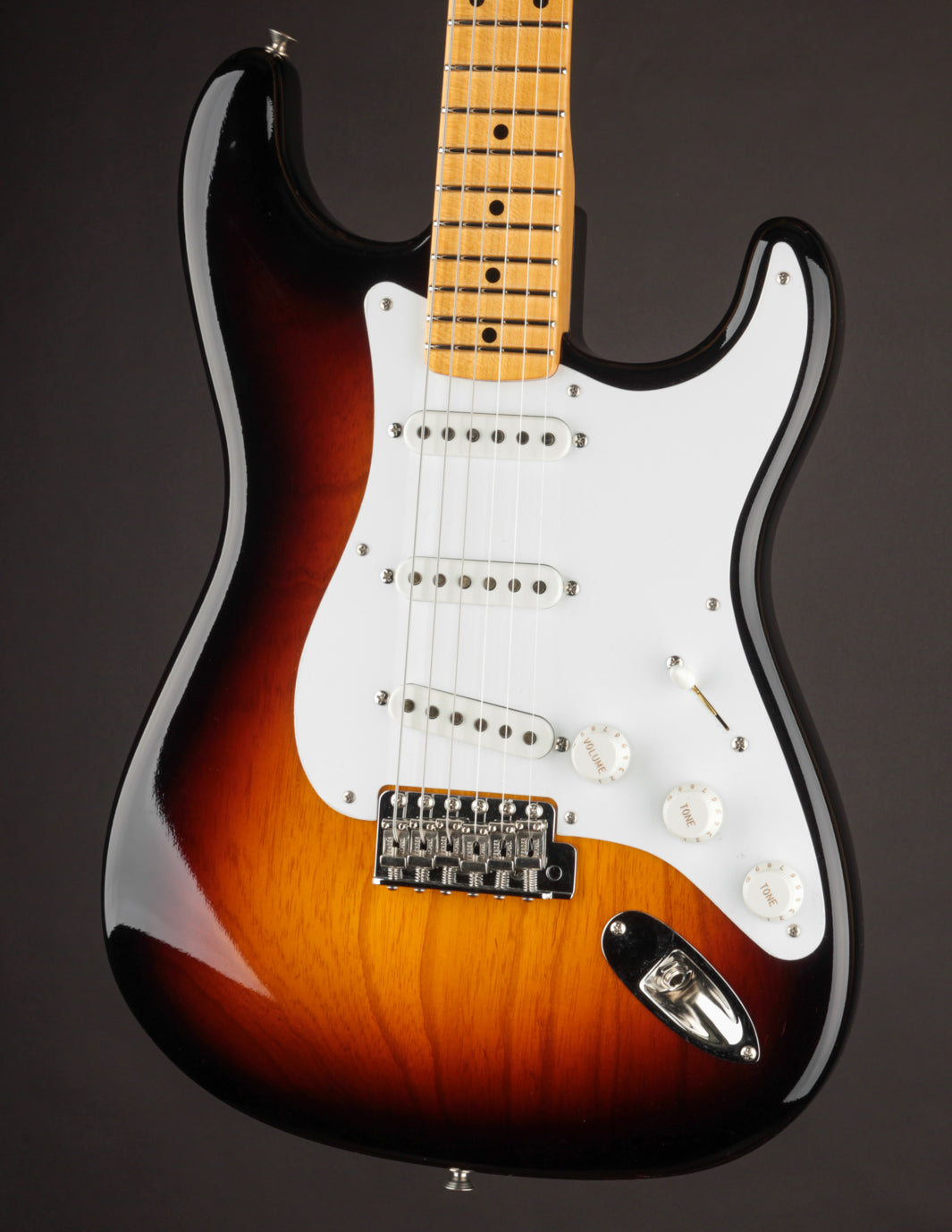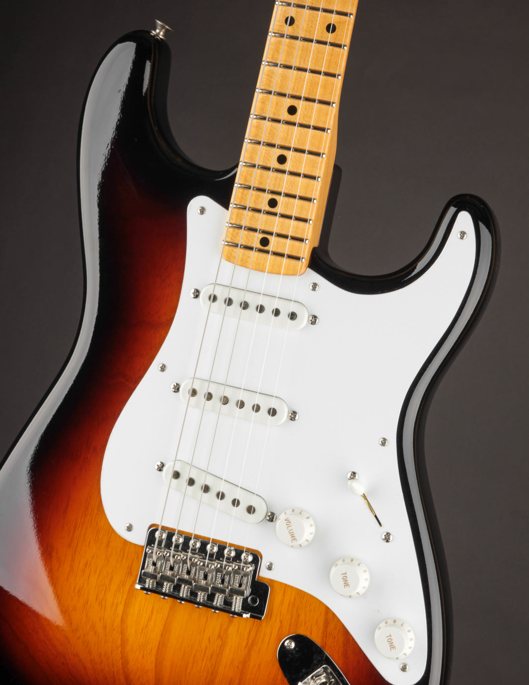 This guitar nails every aspect that made the original a game-changer. The 70th Anniversary neck profile, a soft V-to-C carve, feels substantial yet incredibly comfortable, inviting effortless playability. Authentic period details like skirted knobs, a 'football' 5-way switch tip, and a beautifully grained offset-seam two-piece ash body add to its vintage vibe. Topping it all off are the hand-wound '54 pickups, which deliver the twangy, open, and almost Tele-like tone that made those early Strats so distinctive.