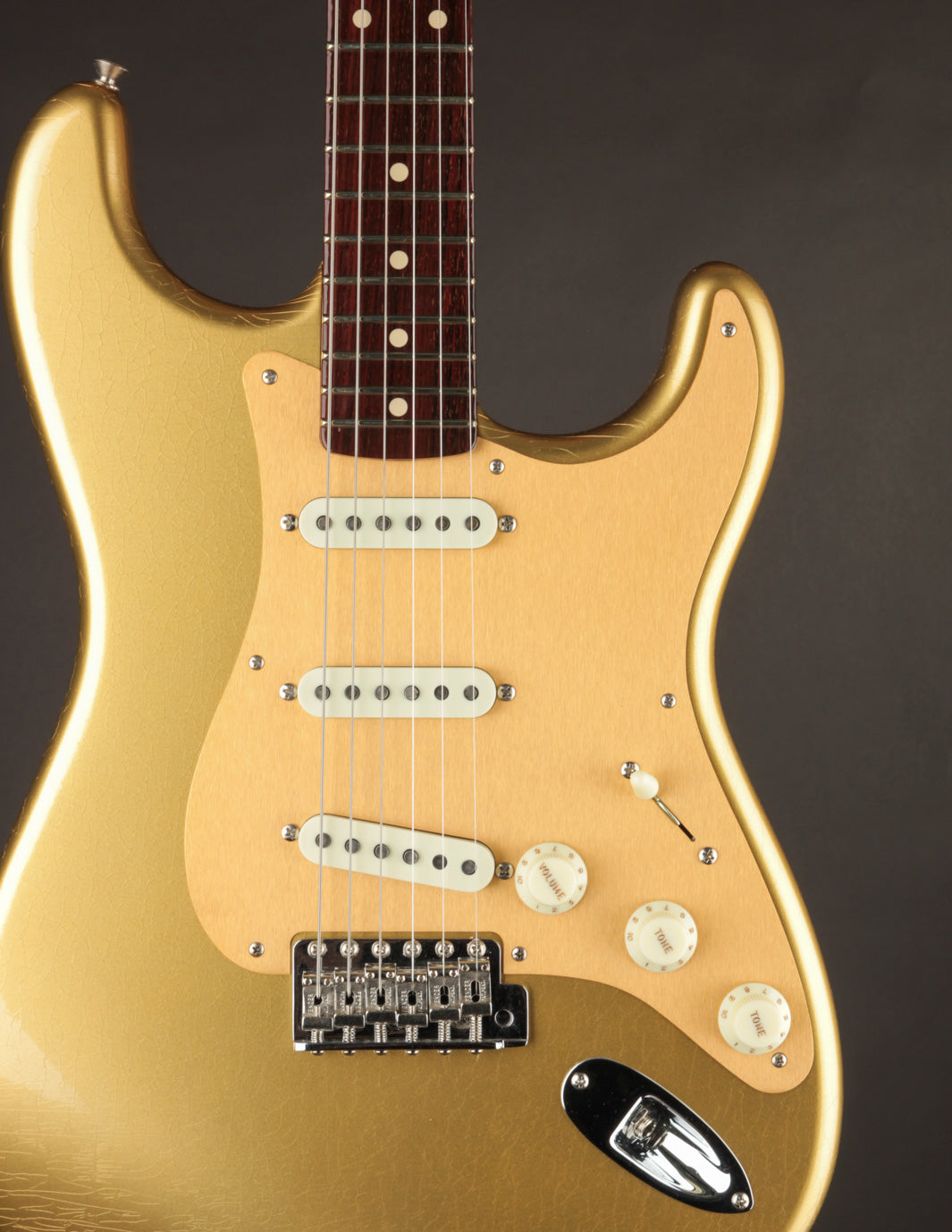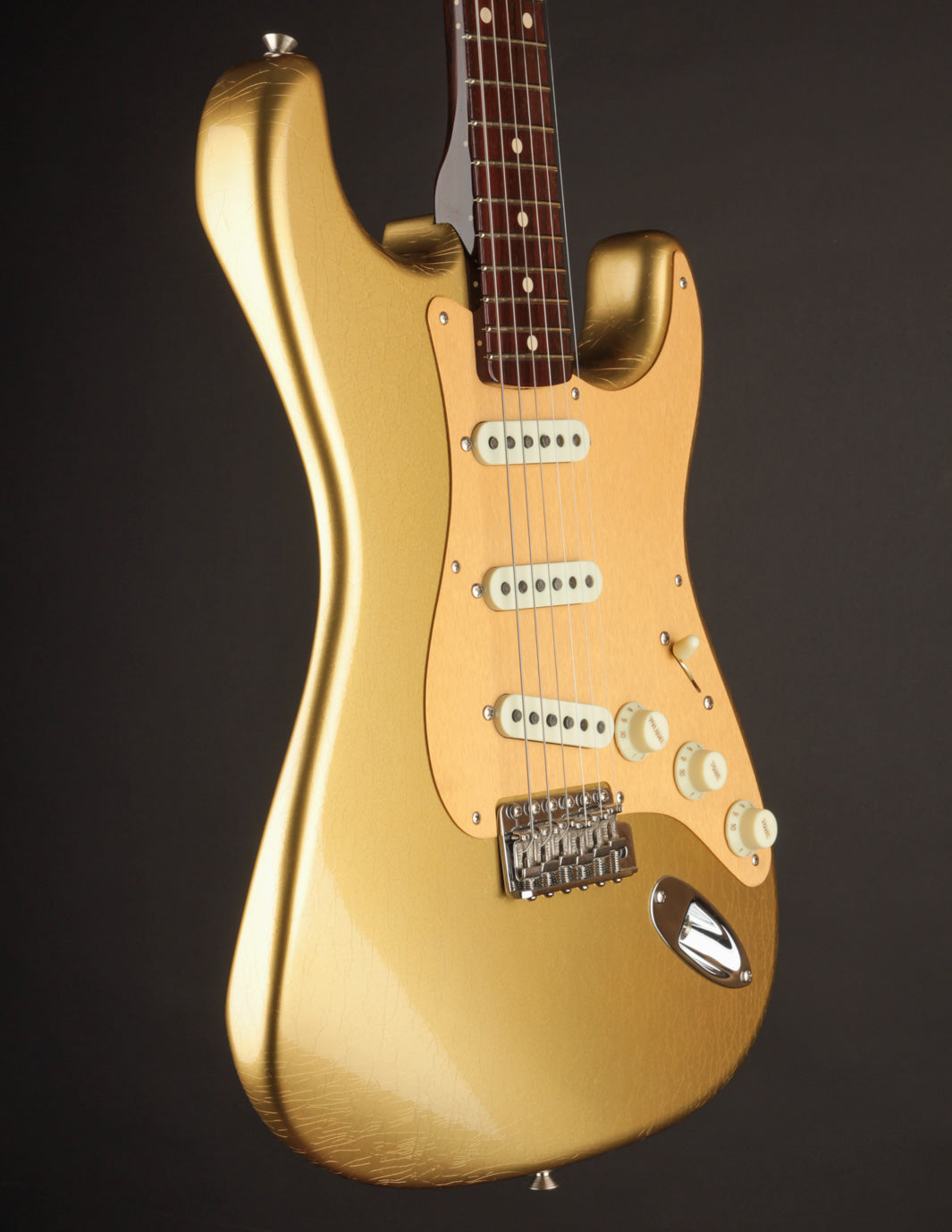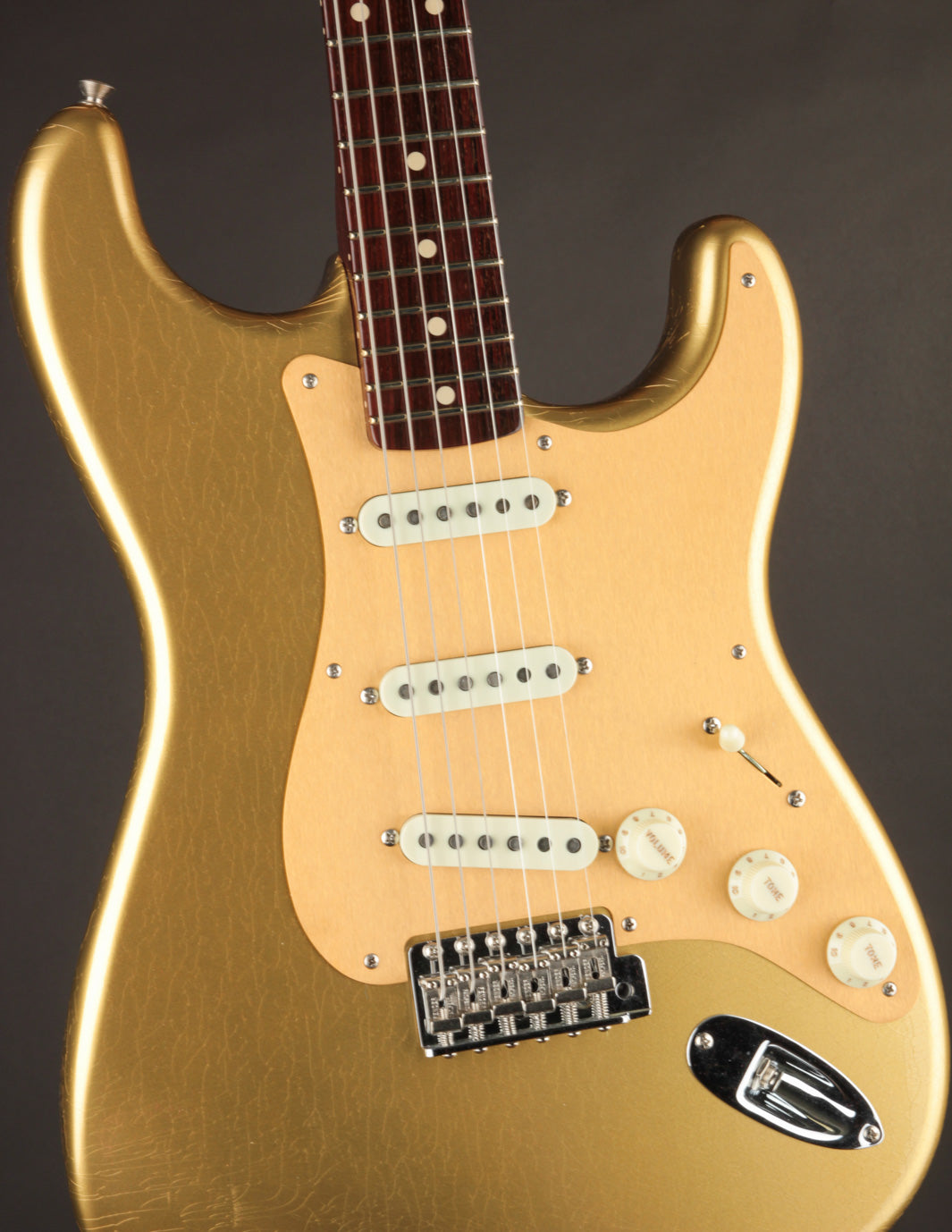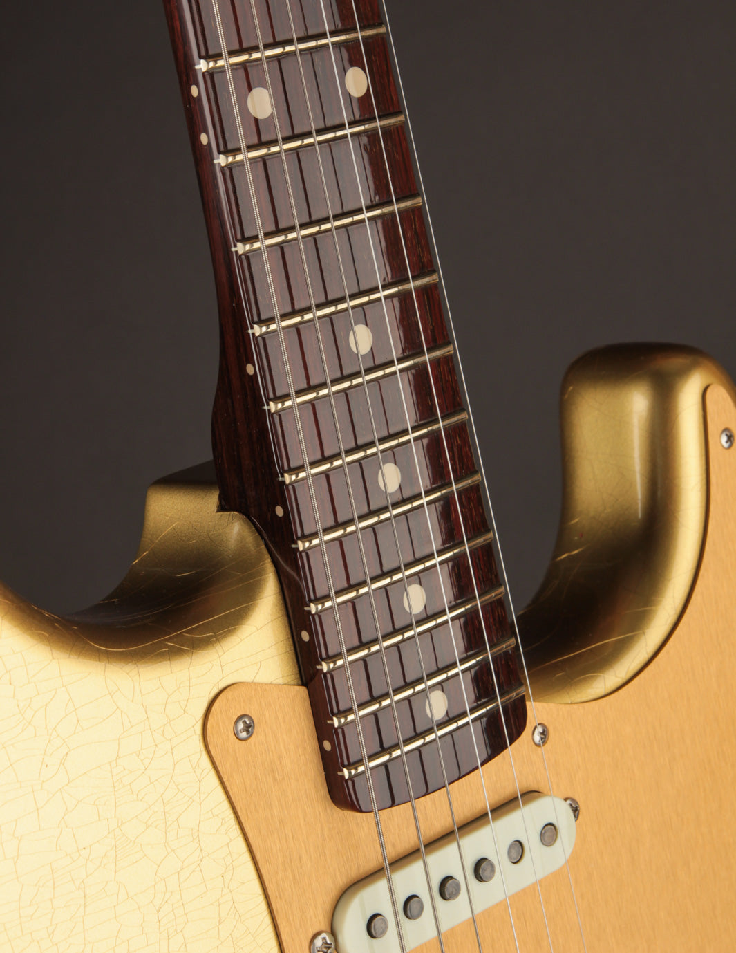Rosewood neck Strats have been a part of Fender's lineup for years now, and we have to admit, there's something very alluring about them both visually and in-hand. Paired with an aged Aztec Gold finish, in Fender's Deluxe Closet Classic aging (lots of weather checking but minimal dings, etc...), and an anodized gold pickguard, it simply looks gorgeous in person (the weather checking really looks great at different angles).
