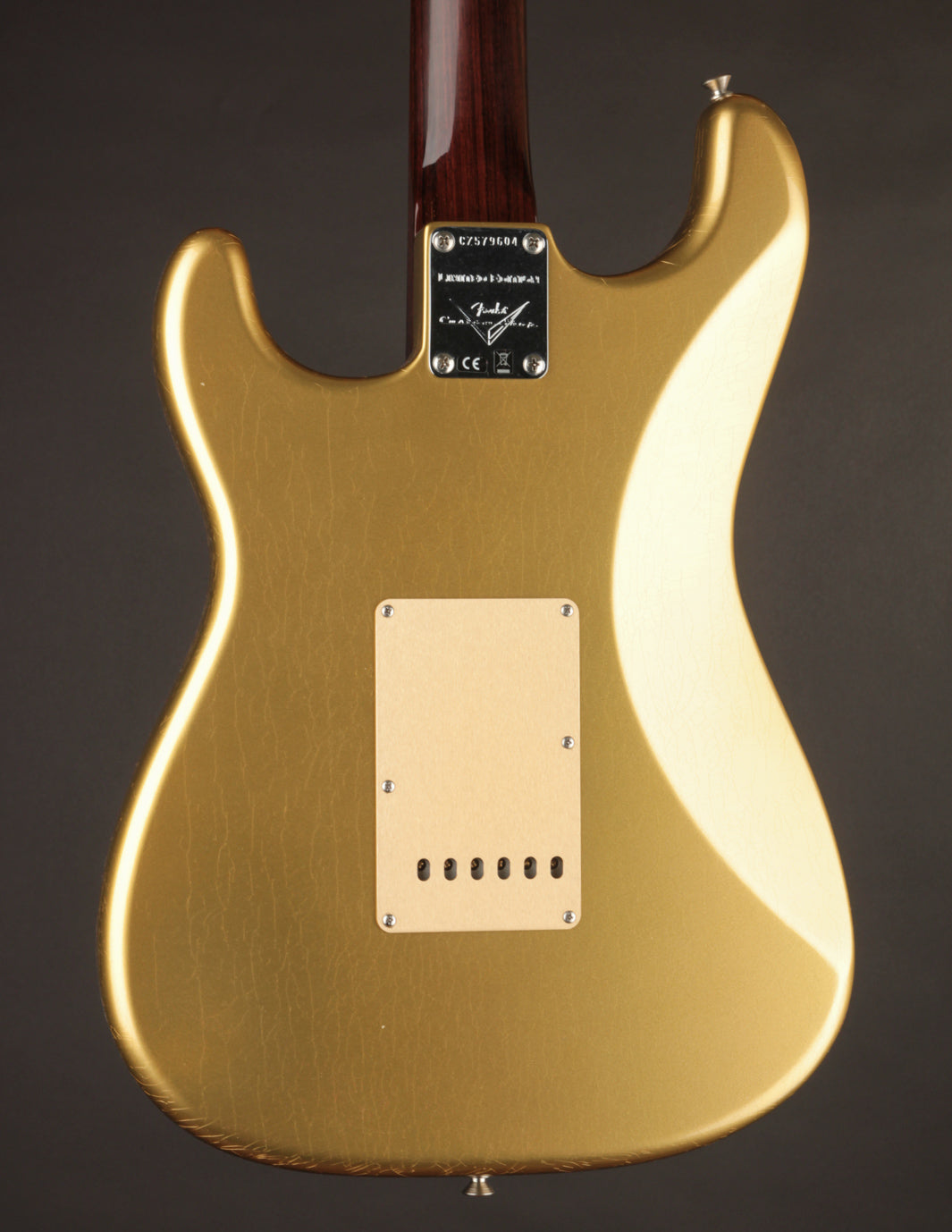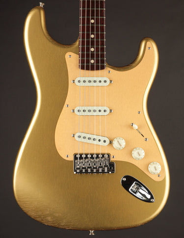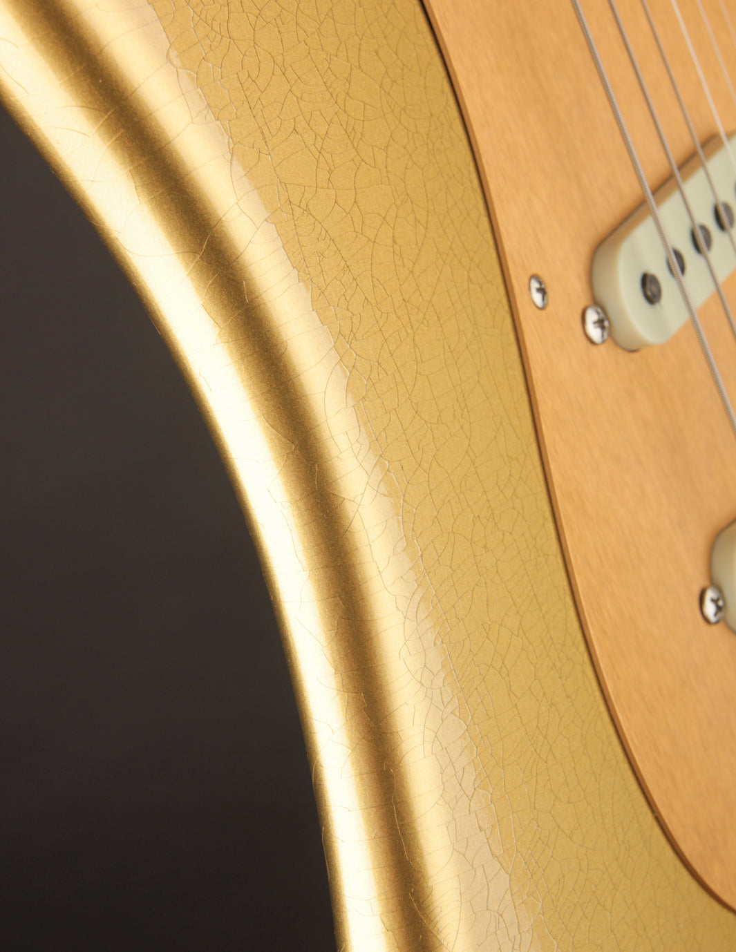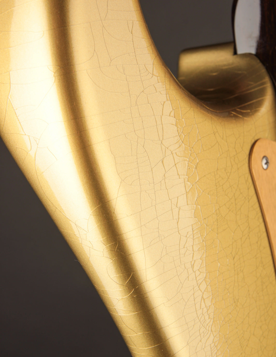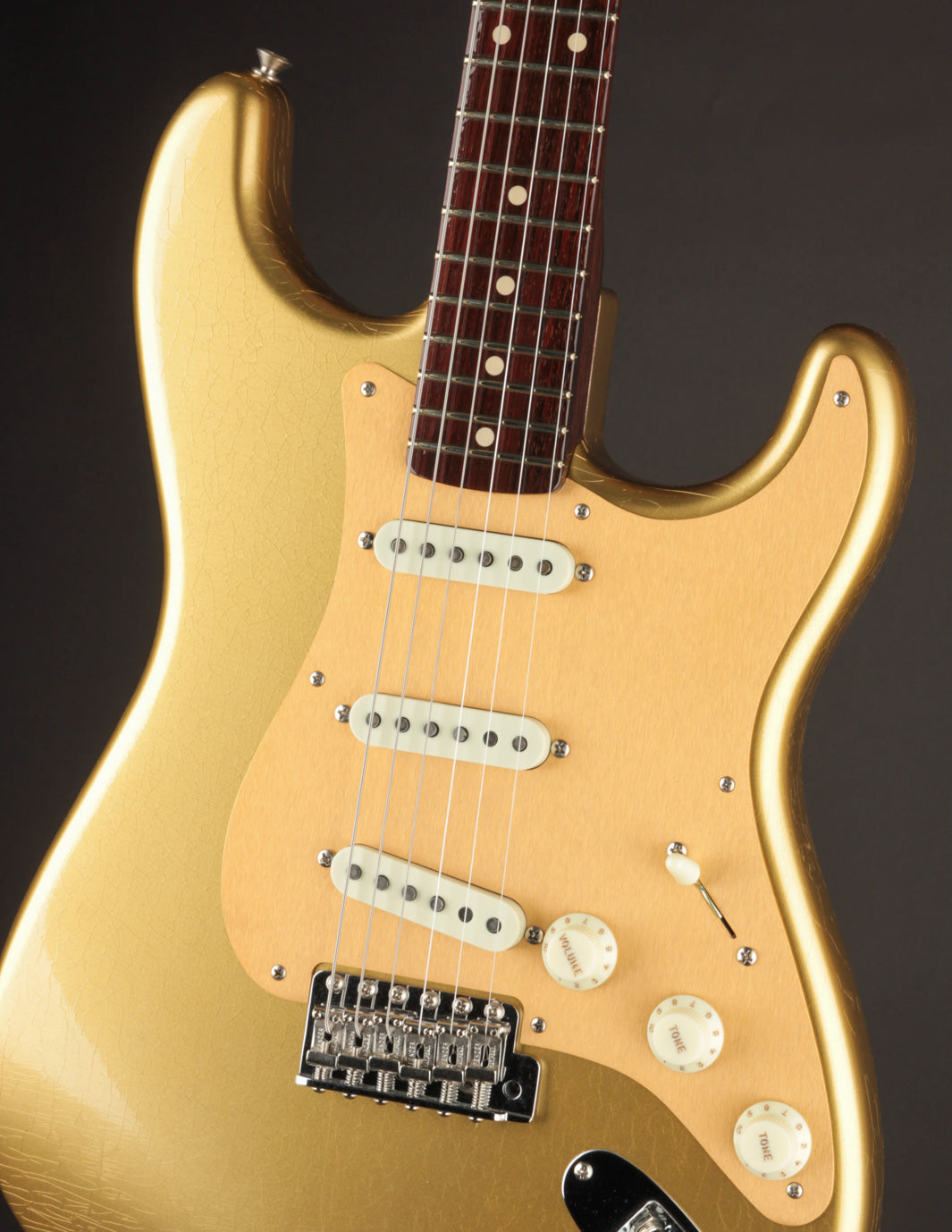 Rosewood neck Strats have been a part of Fender's lineup for years now, and we have to admit, there's something very alluring about them both visually and in-hand. Paired with an aged Aztec Gold finish, in Fender's Deluxe Closet Classic aging (lots of weather checking but minimal dings, etc...), and an anodized gold pickguard, it simply looks gorgeous in person (the weather checking really looks great at different angles).