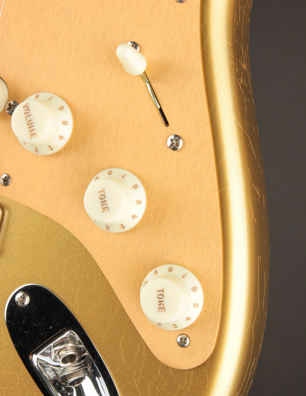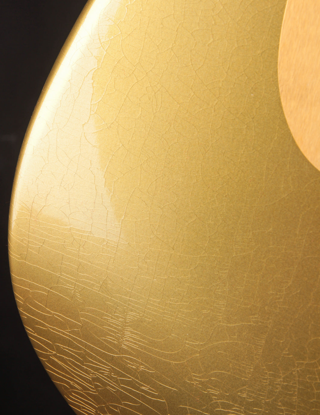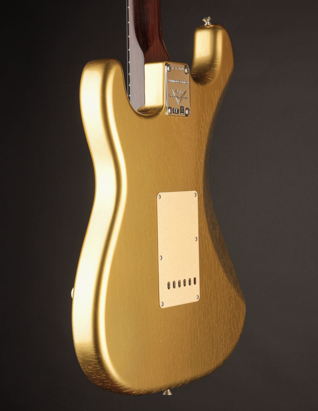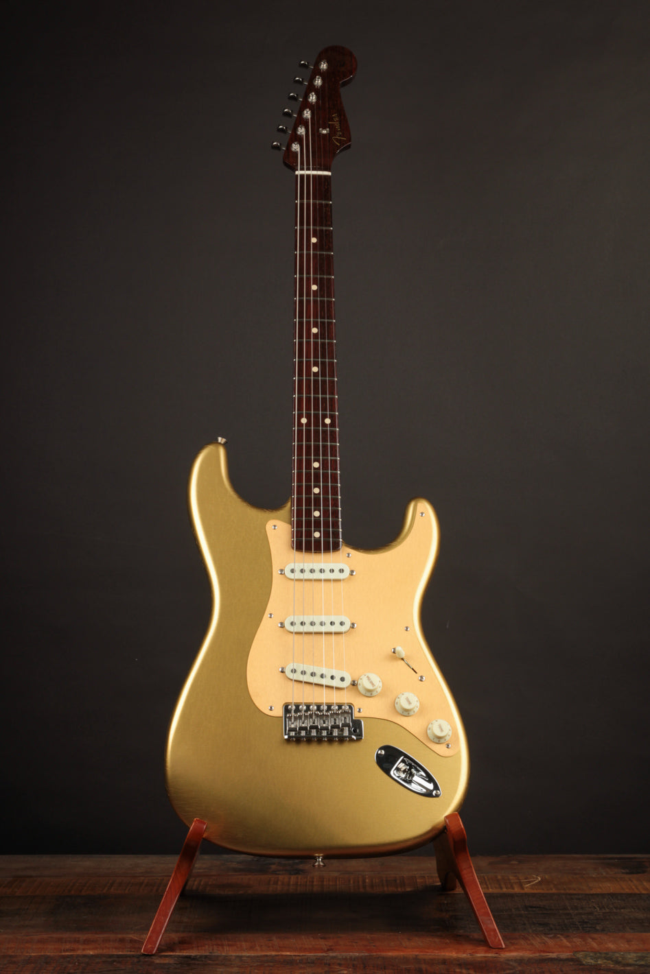 Rosewood neck Strats have been a part of Fender's lineup for years now, and we have to admit, there's something very alluring about them both visually and in-hand. Paired with an aged Aztec Gold finish, in Fender's Deluxe Closet Classic aging (lots of weather checking but minimal dings, etc...), and an anodized gold pickguard, it simply looks gorgeous in person (the weather checking really looks great at different angles).