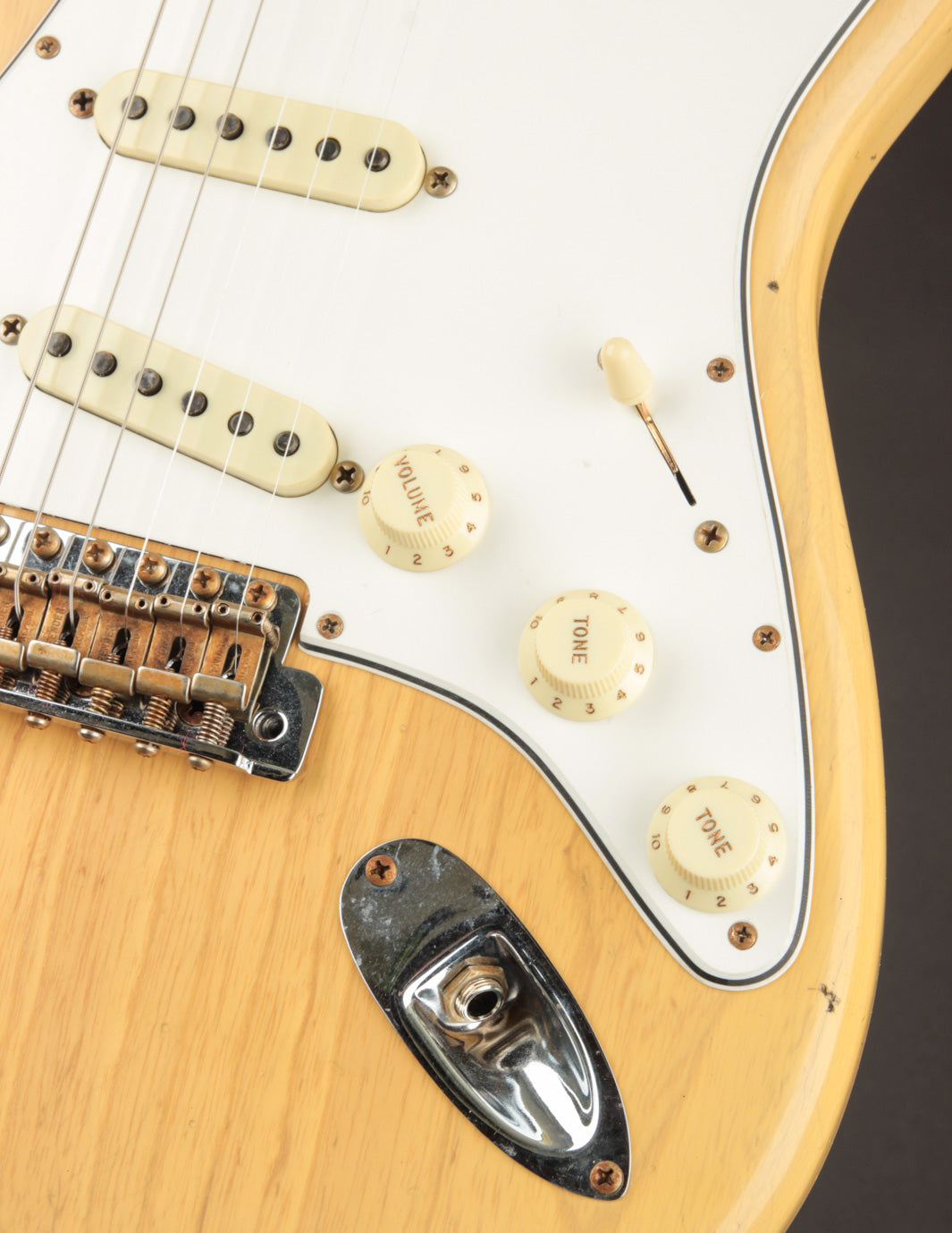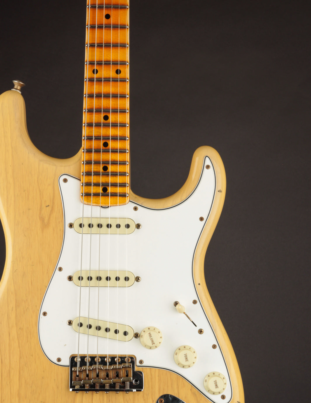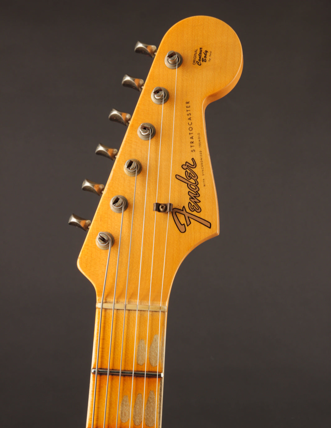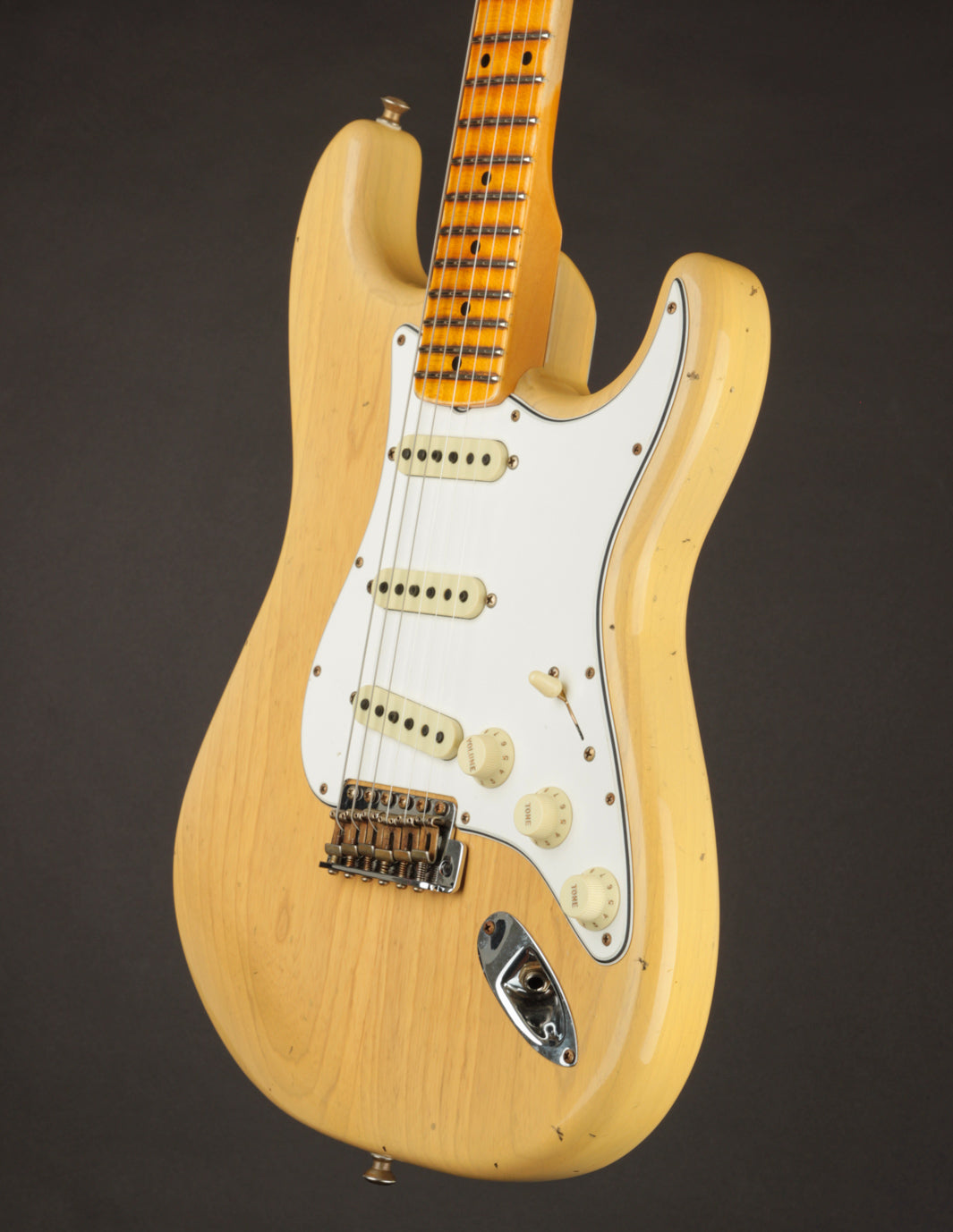 Other features include a five-way switch, three-ply black pickguard, Custom Shop vintage synchronized tremolo, vintage-style tuning machines, bone nut and wing string tree.