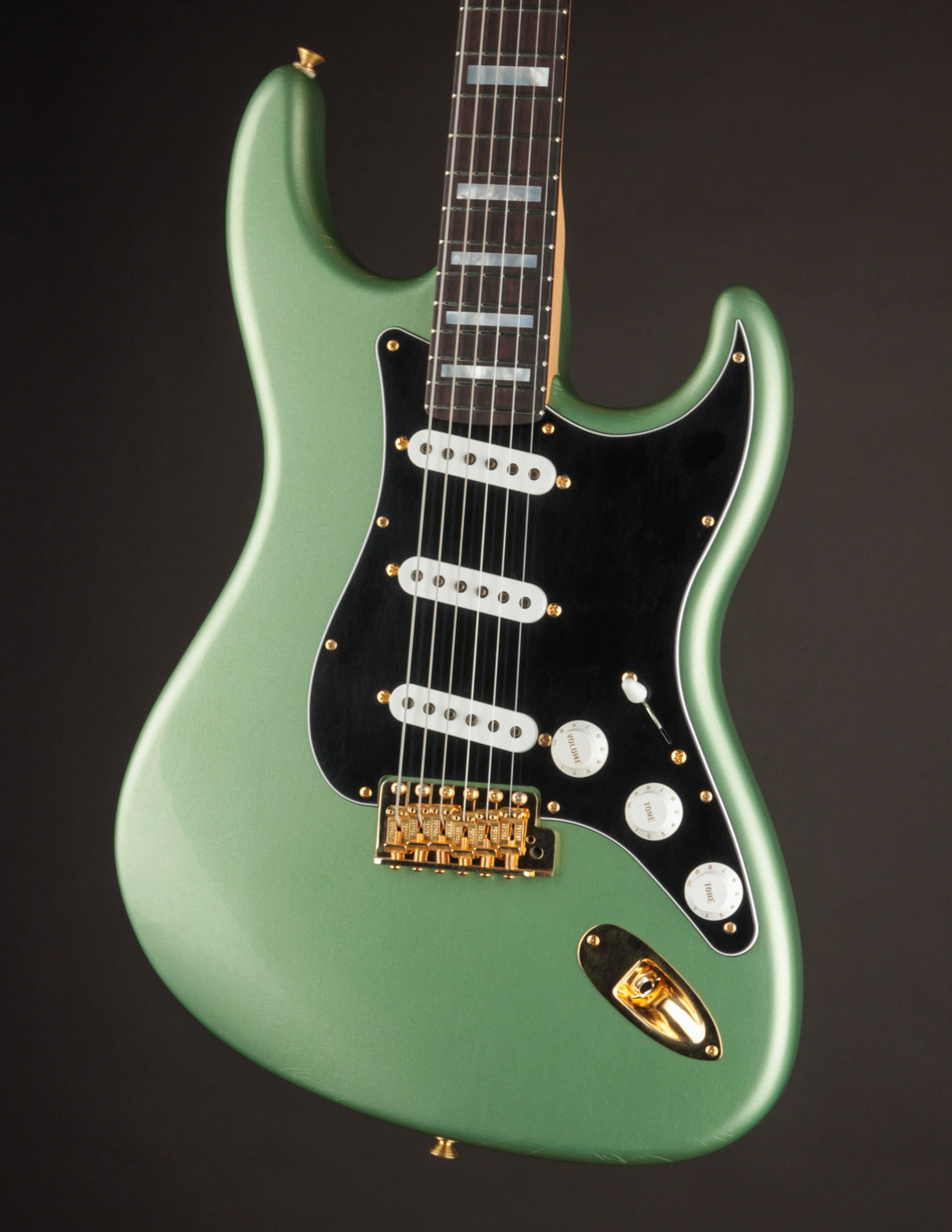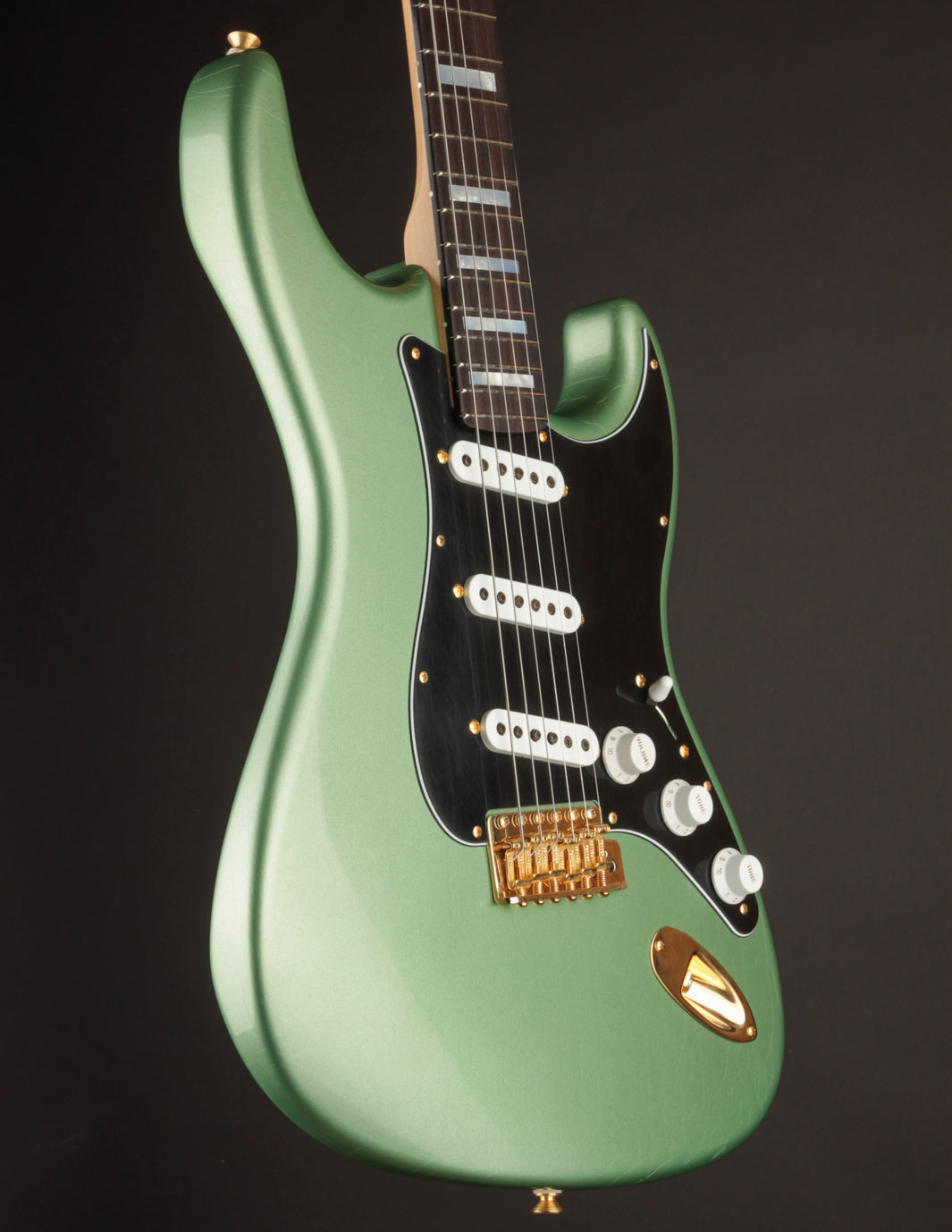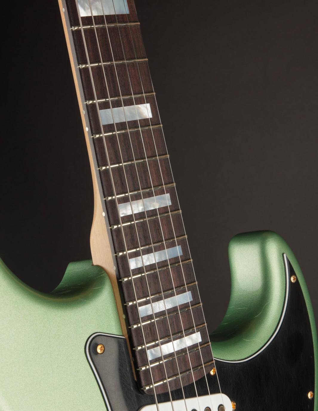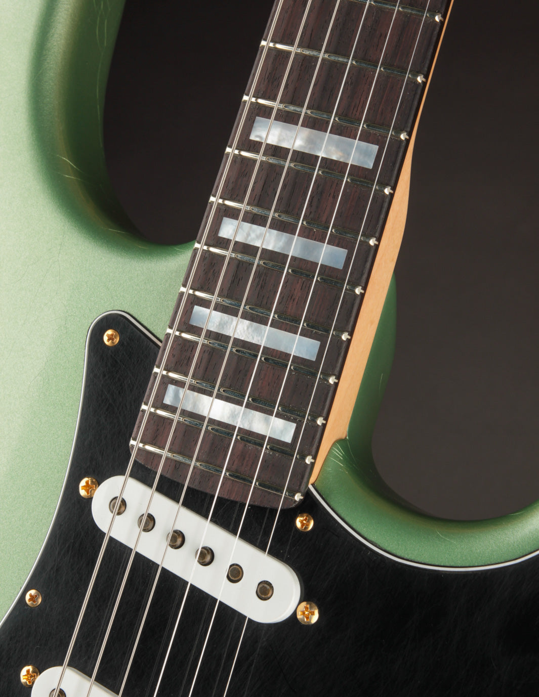 Visually, this guitar stops you in your tracks. The Sage Green Metallic finish with a black guard, white plastics, rosewood board, block inlays, and gold hardware feels both elegant and fresh. It’s sharp. It’s tasteful. It’s just… cool.