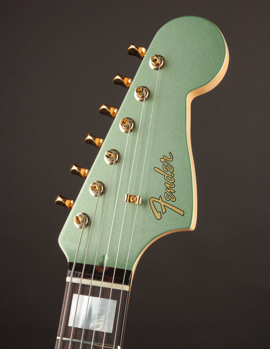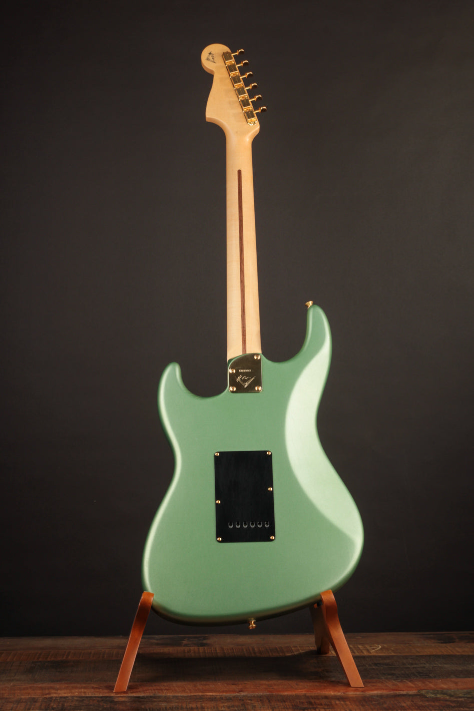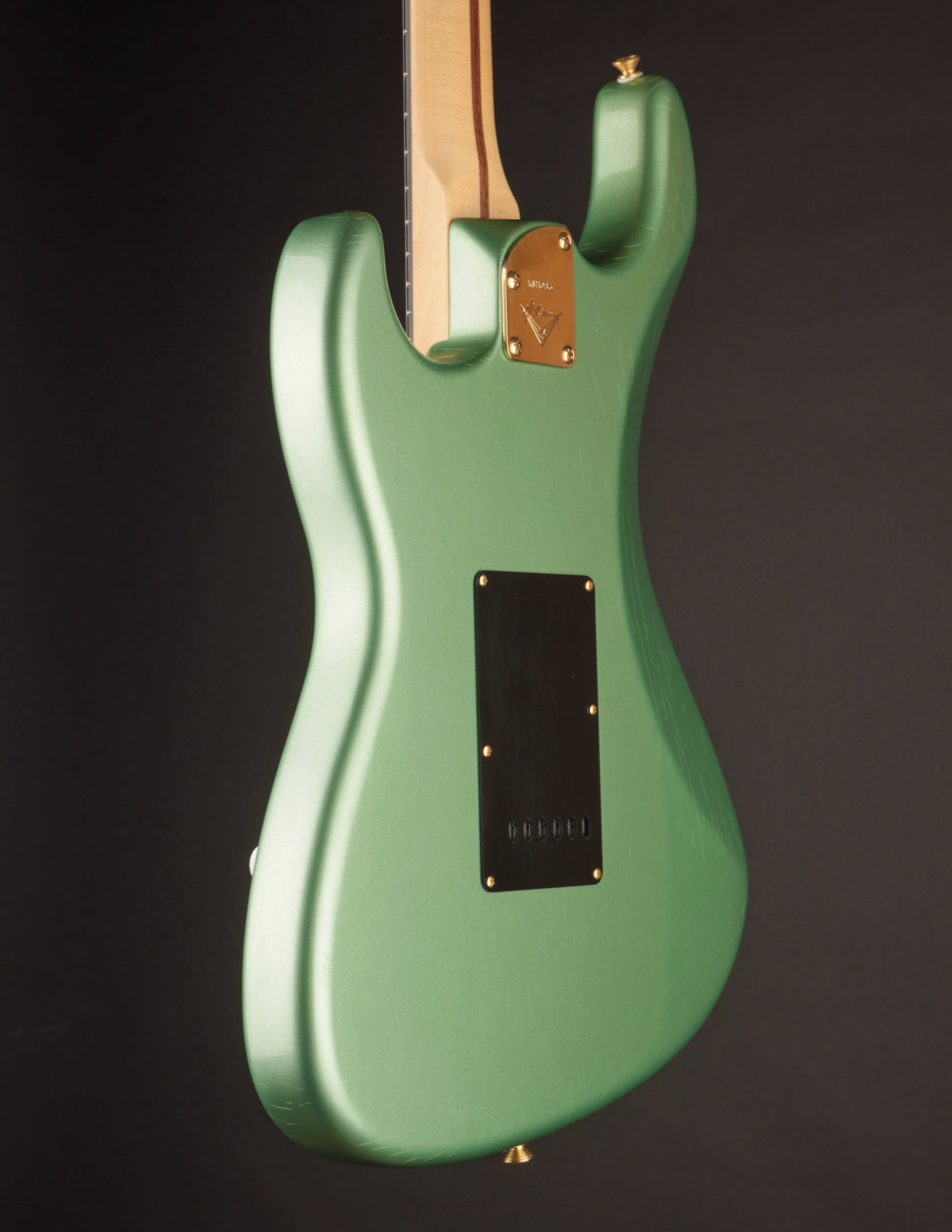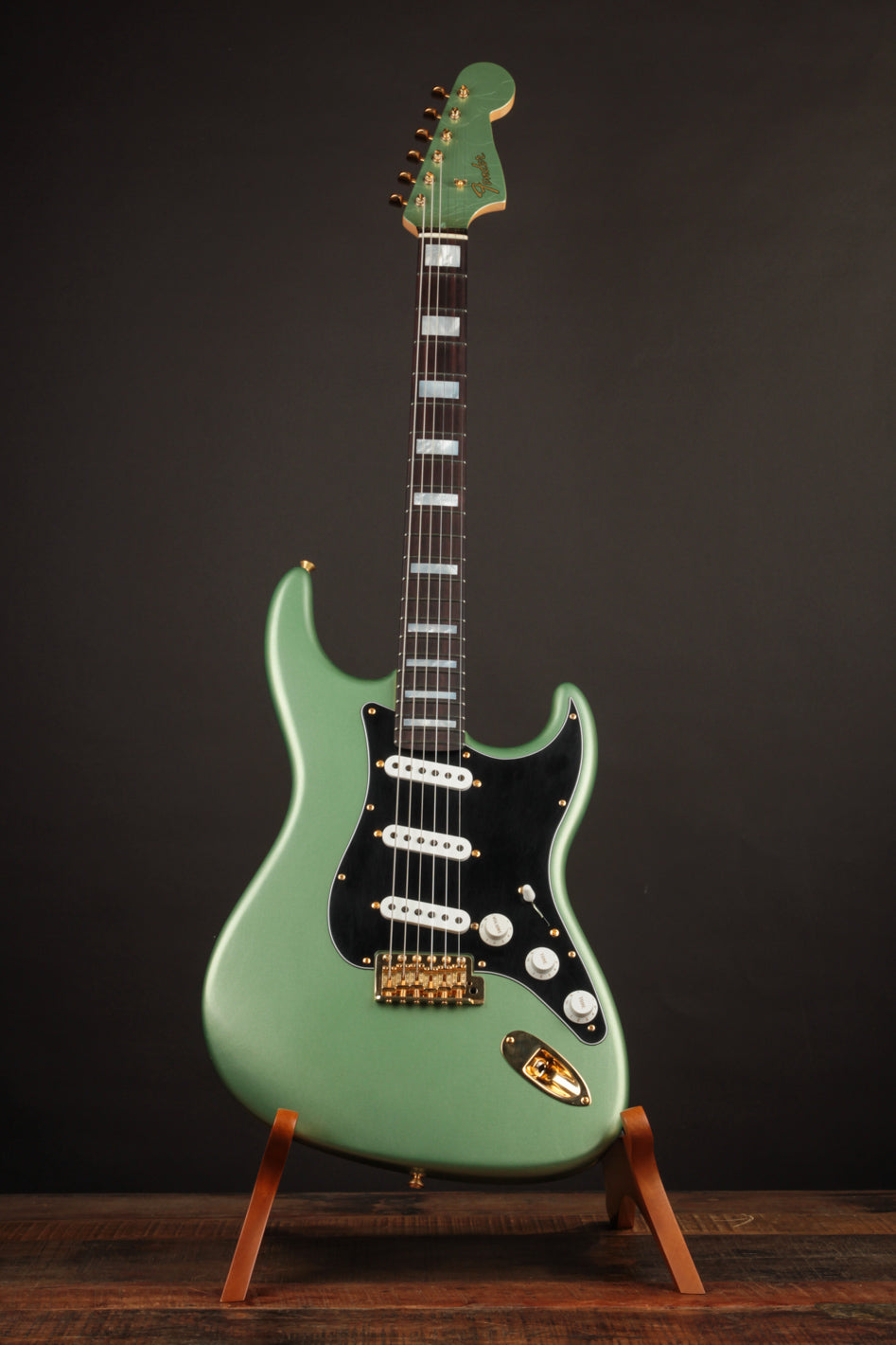 Visually, this guitar stops you in your tracks. The Sage Green Metallic finish with a black guard, white plastics, rosewood board, block inlays, and gold hardware feels both elegant and fresh. It’s sharp. It’s tasteful. It’s just… cool.