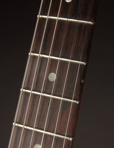We've gone ahead and installed a MojoAxe bridge in place of the original (which is included), which allows for cleaner intonation particularly on the G string. A fresh setup with this new bridge and this guitar is playing great! The original Kluson tuners are working great, and both pickups have that unmistakable MM sound - bright and lean with medium output that straddles the line between the fatness of a P90 and the twang of Fender single coils. It's free of cracks or breaks, too!