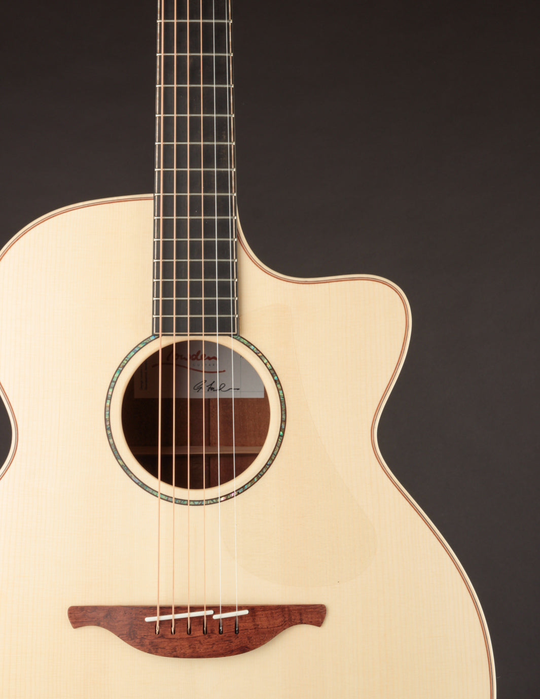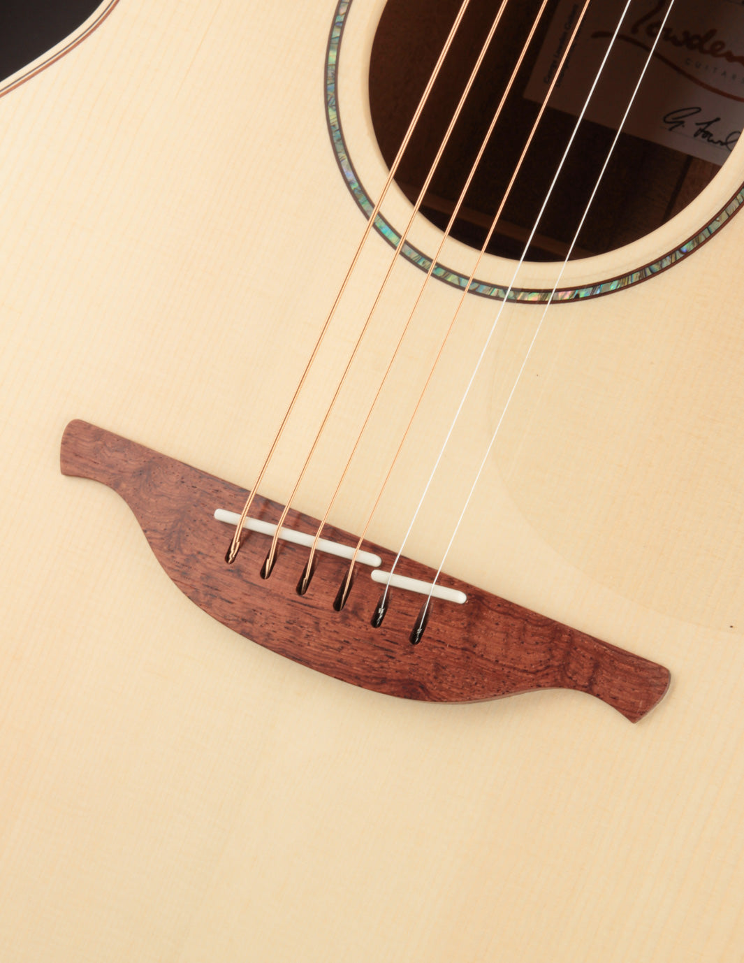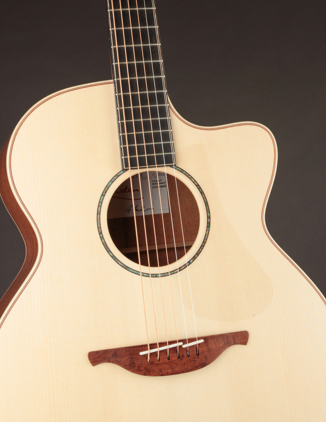 The Lowden 35 Series features upgraded tonewoods and a mid-tier appointment level, emphasizing sound above all else and catering to discerning players interested in subtlety of tone. This O-35CX features TME house favorite pairing Cuban Mahogany and Adirondack Spruce, a combination that yields power, depth, and a woody articulation that seems to suit any style of music excellently. The "O" is Lowden's jumbo body size ~ well suited to strummers looking for maximum horsepower; but the "X" designation signifies Lowden's shallower body option. Translation? If you're after the most booming, present guitar in the Lowden stable, but the idea of a deep bodied jumbo doesn't jive with your playability preferences ~ this is the guitar for you. Priced with Ameritage hardshell case.