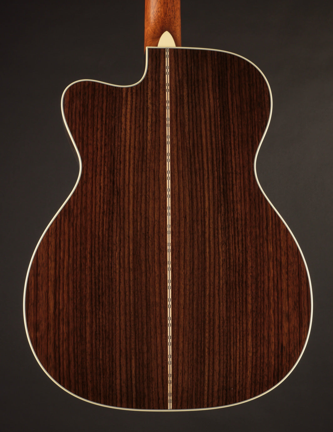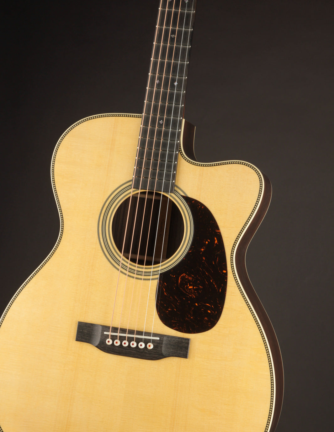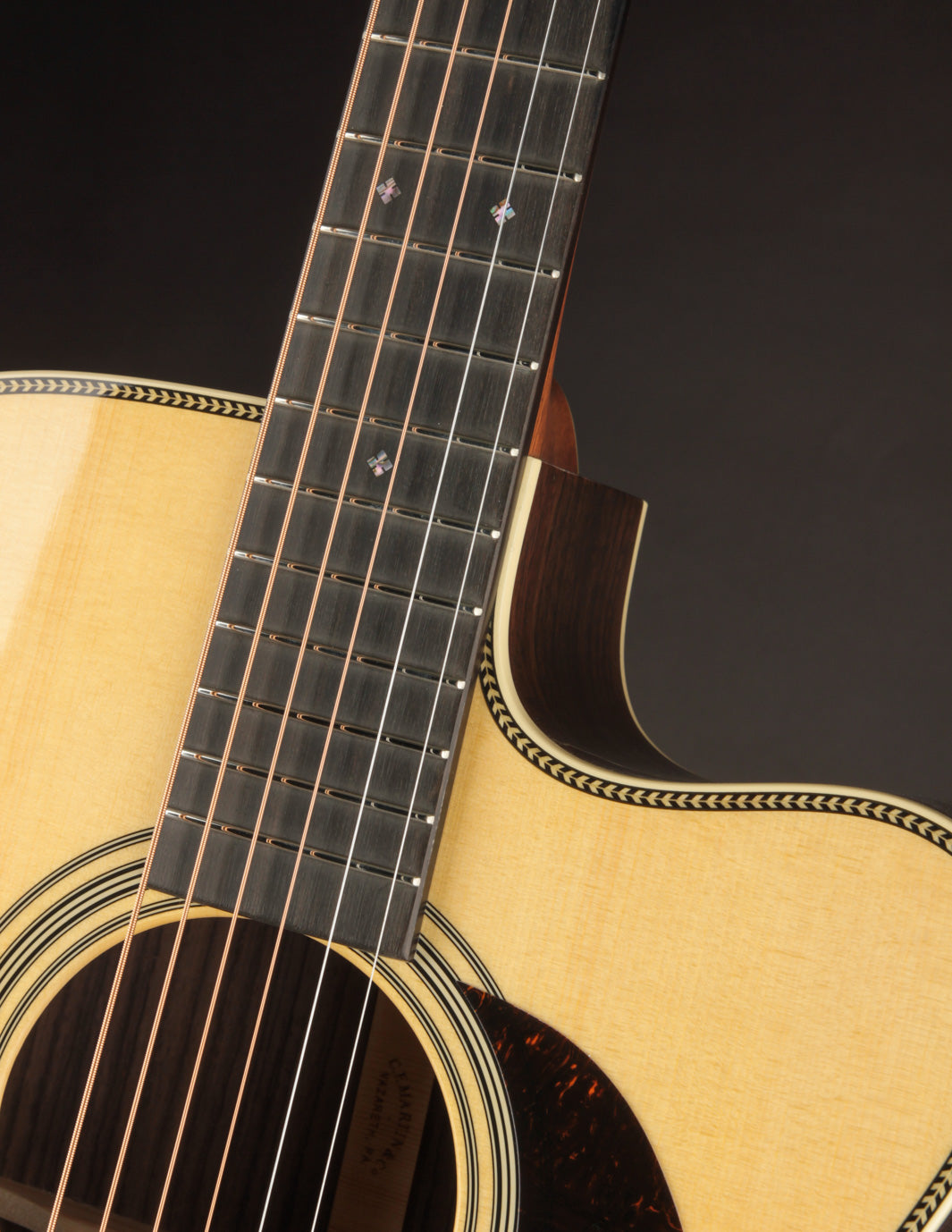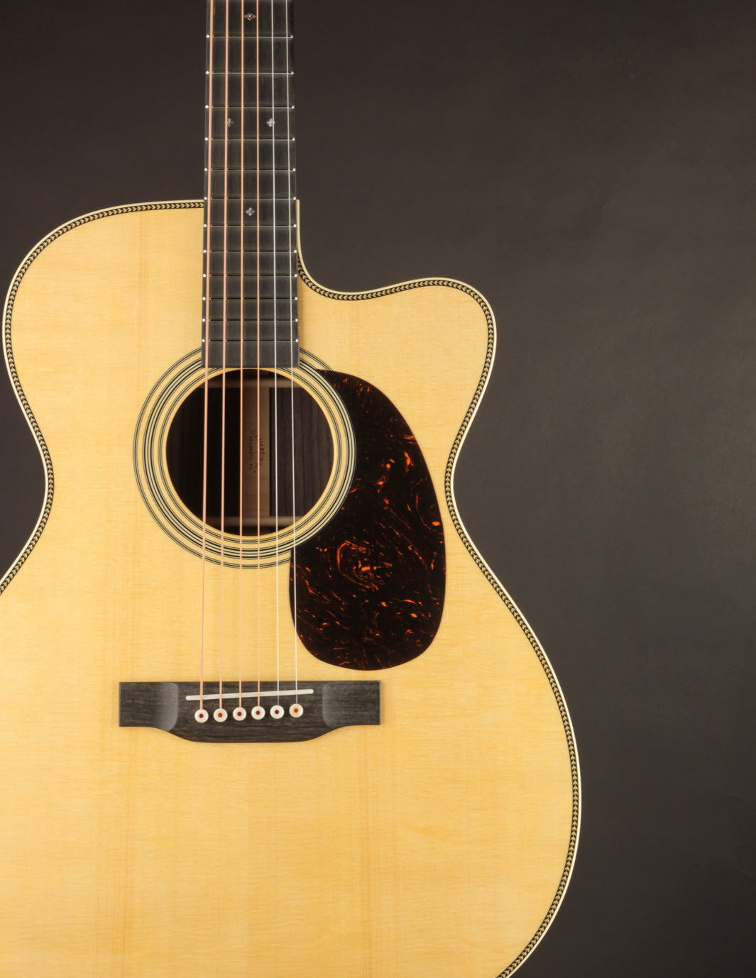 To our ears, this is an OM-28, only better. The European Spruce top brings more stiffness to the table, imparting color of tone, clarity, snap, and a significantly more focused & clear low end. This Custom Shop take on the classic OM-28 offers depth of tone that will rival a boutique guitar ~ with the modern neck profile and cutaway favored by many contemporary fingerstyle players.