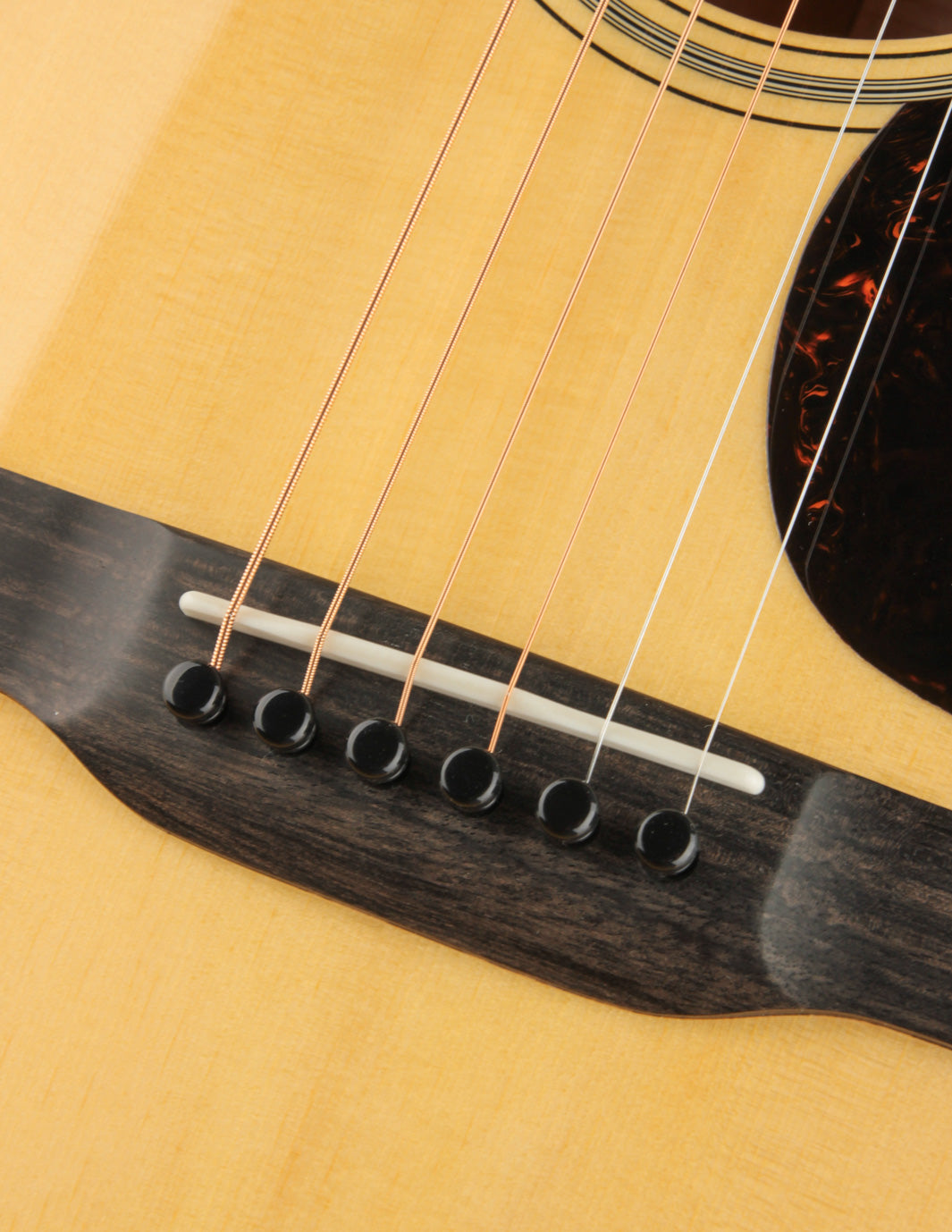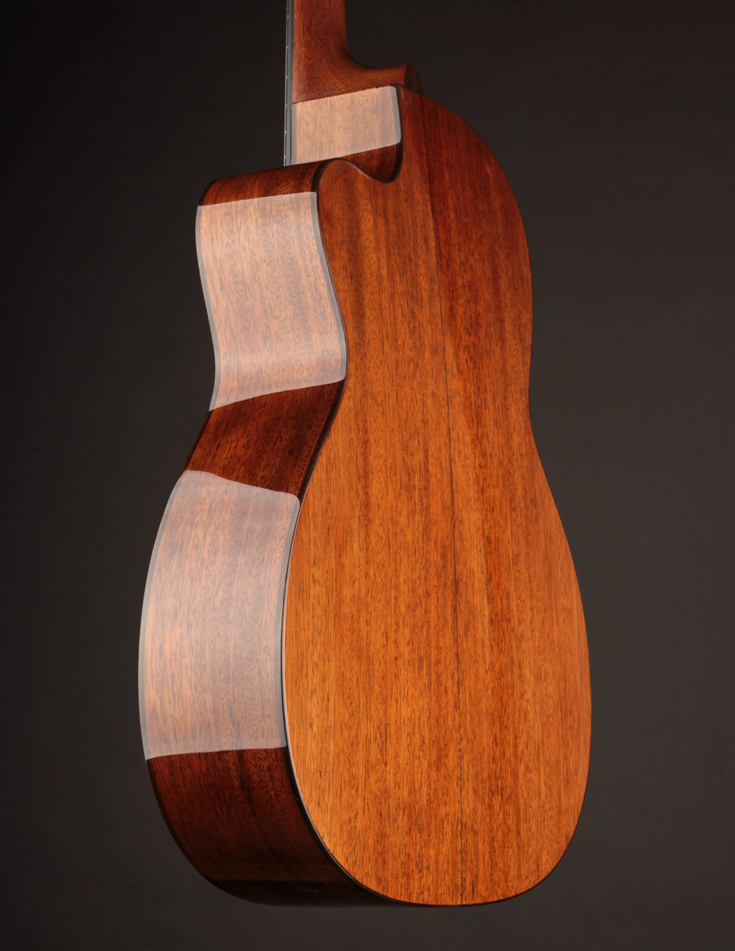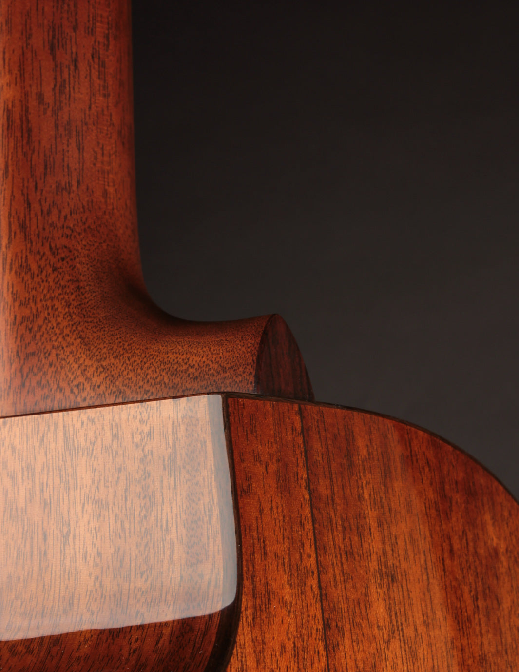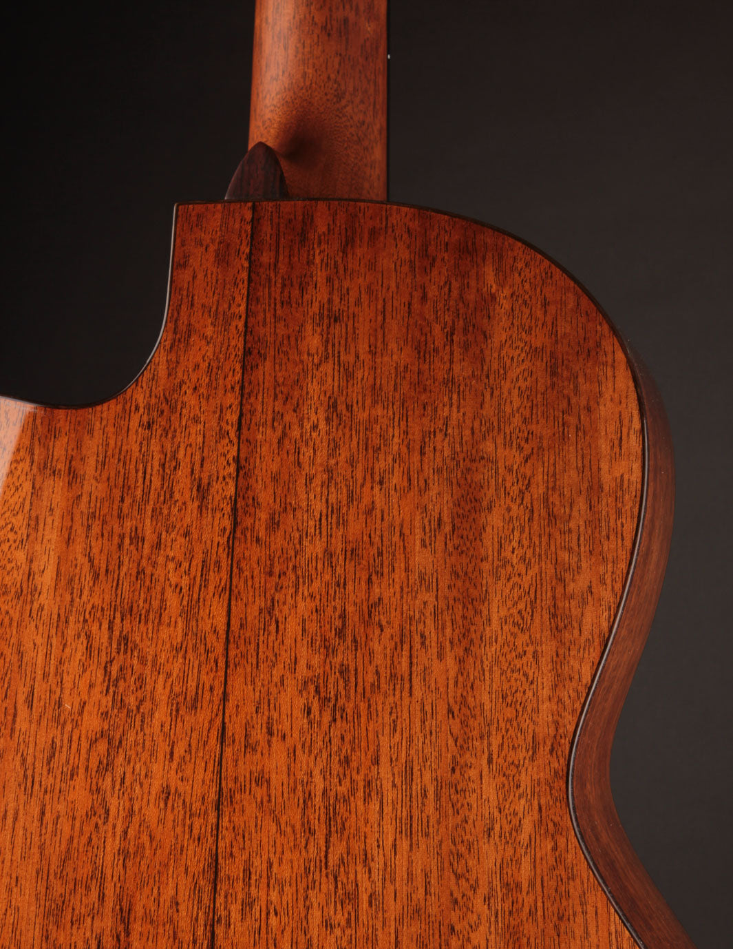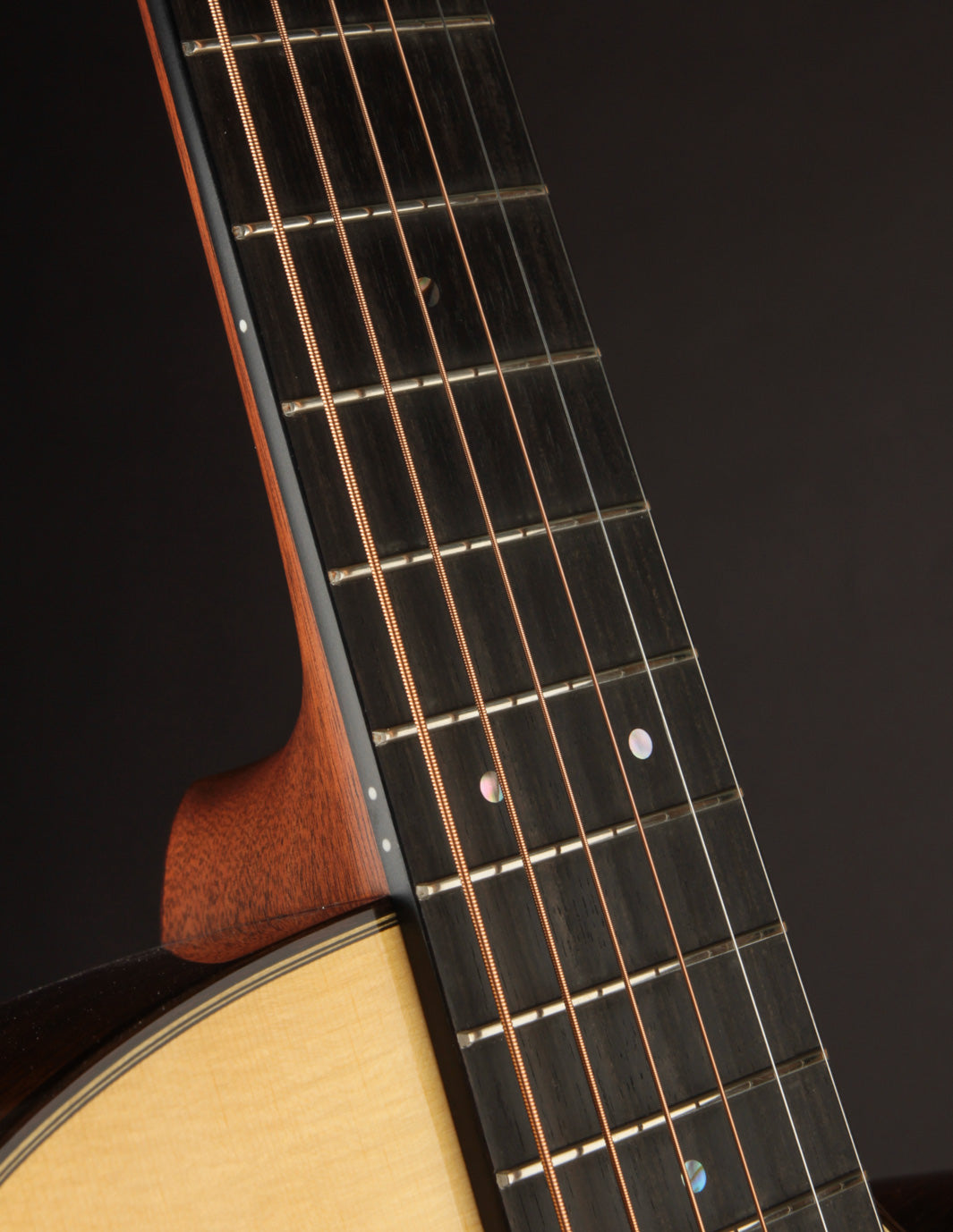 The 12-fret design affords generous warmth and "roundness" of sound relative to a 14-fret guitar.