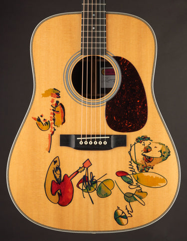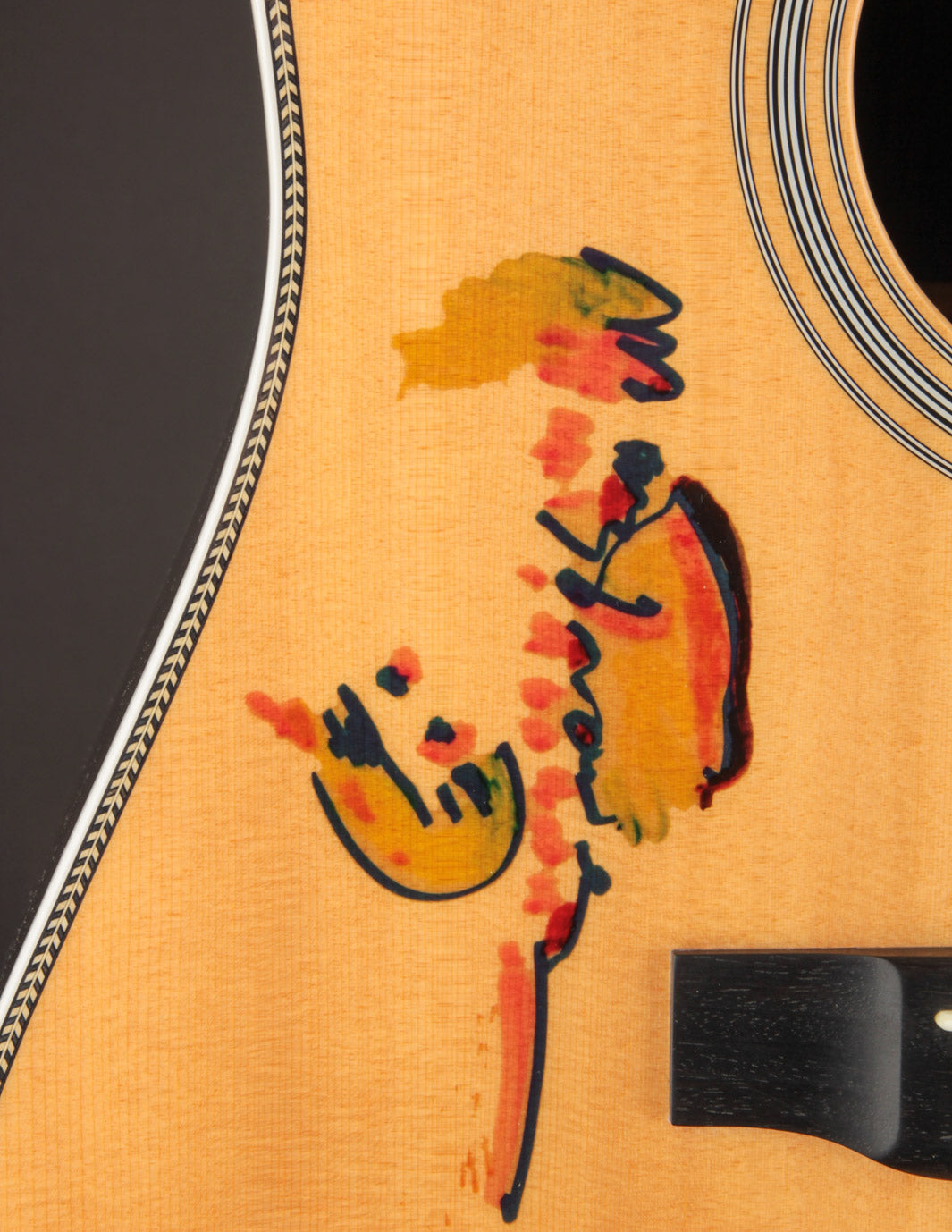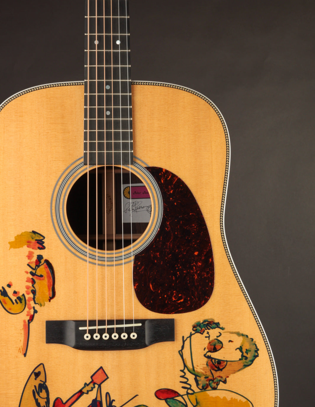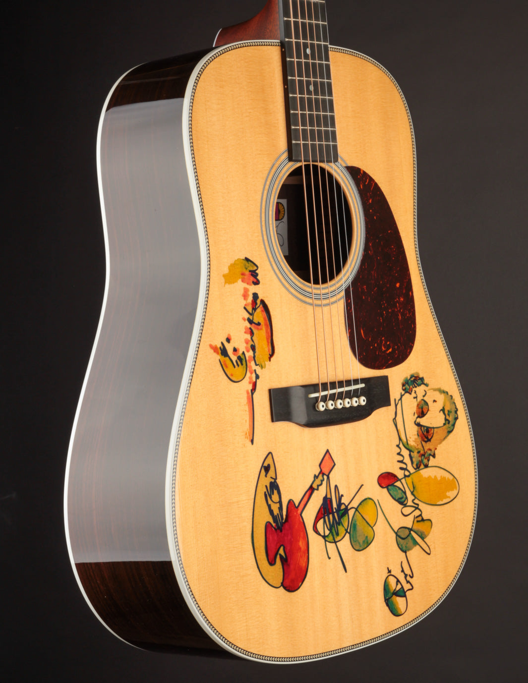 The history of folk music is intertwined with Martin Guitars and one of the seminal groups from the folk heyday was Peter, Paul, and Mary. This HD-28 Centennial Commemorative Model, of which only 2 were made, was designed to celebrate the group's 50 years of playing together. Peter Yarrow designed the artwork and it was photographed, along with the group's signatures, and expertly applied by Martin. The guitar's brother is now housed in the Folk and Americana Roots Hall of Fame at the Wang Center in Boston.