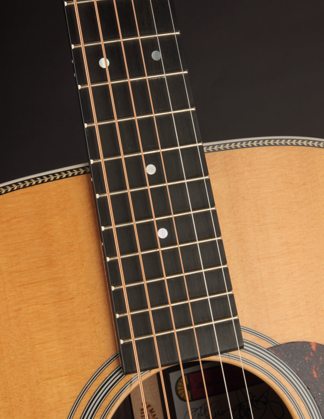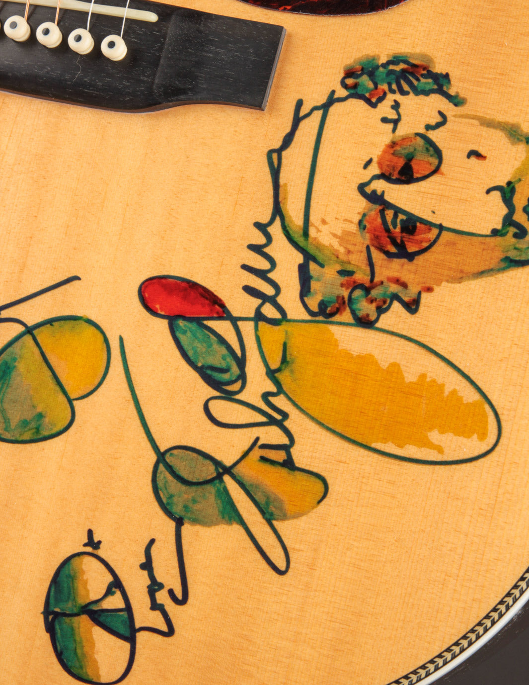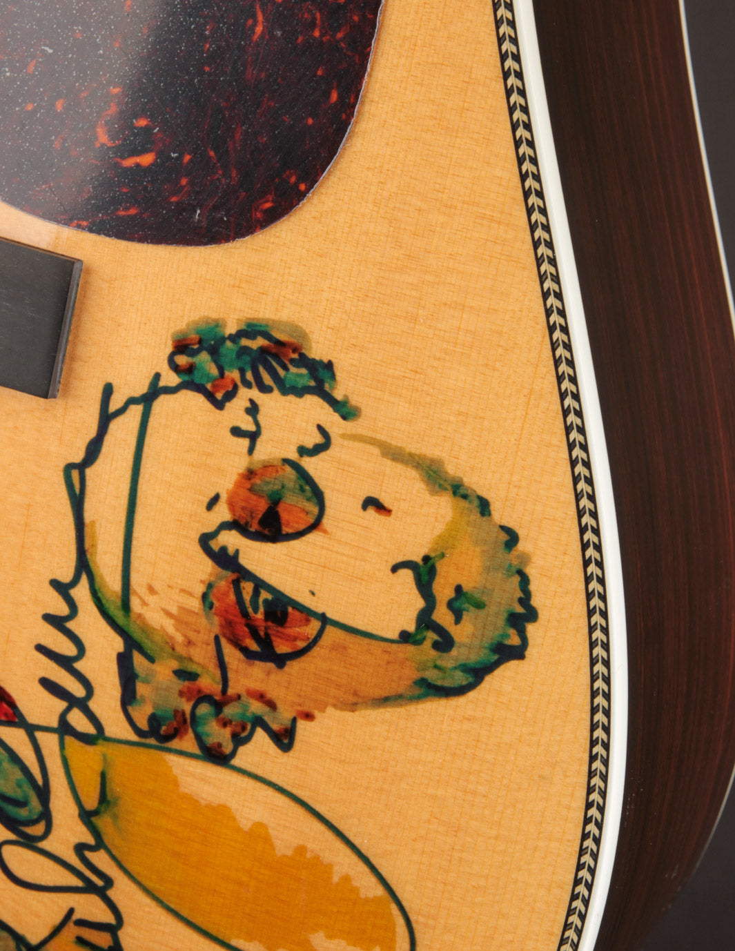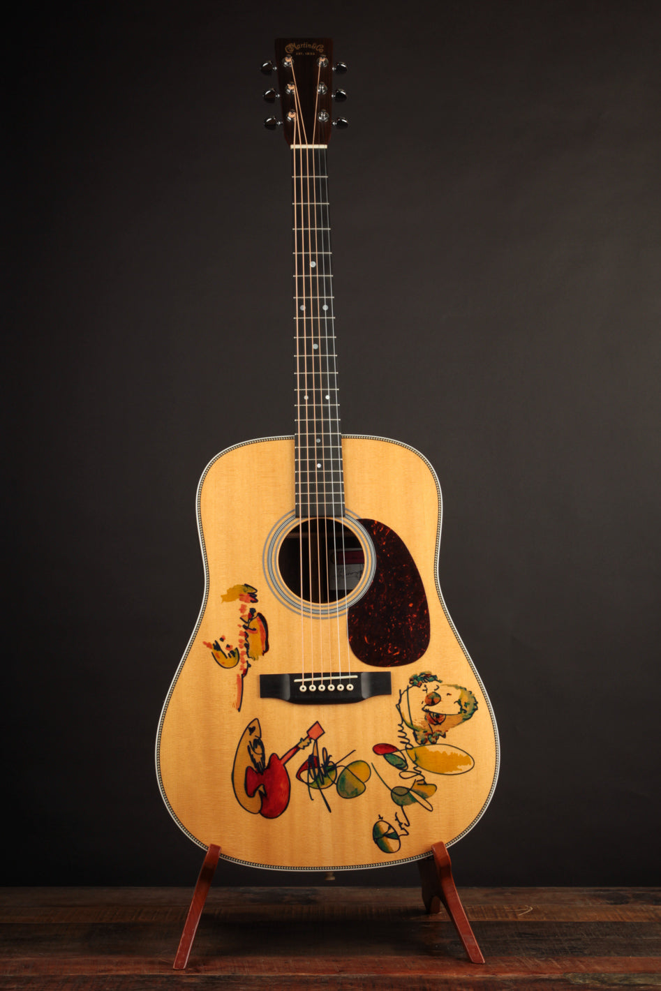 The history of folk music is intertwined with Martin Guitars and one of the seminal groups from the folk heyday was Peter, Paul, and Mary. This HD-28 Centennial Commemorative Model, of which only 2 were made, was designed to celebrate the group's 50 years of playing together. Peter Yarrow designed the artwork and it was photographed, along with the group's signatures, and expertly applied by Martin. The guitar's brother is now housed in the Folk and Americana Roots Hall of Fame at the Wang Center in Boston.