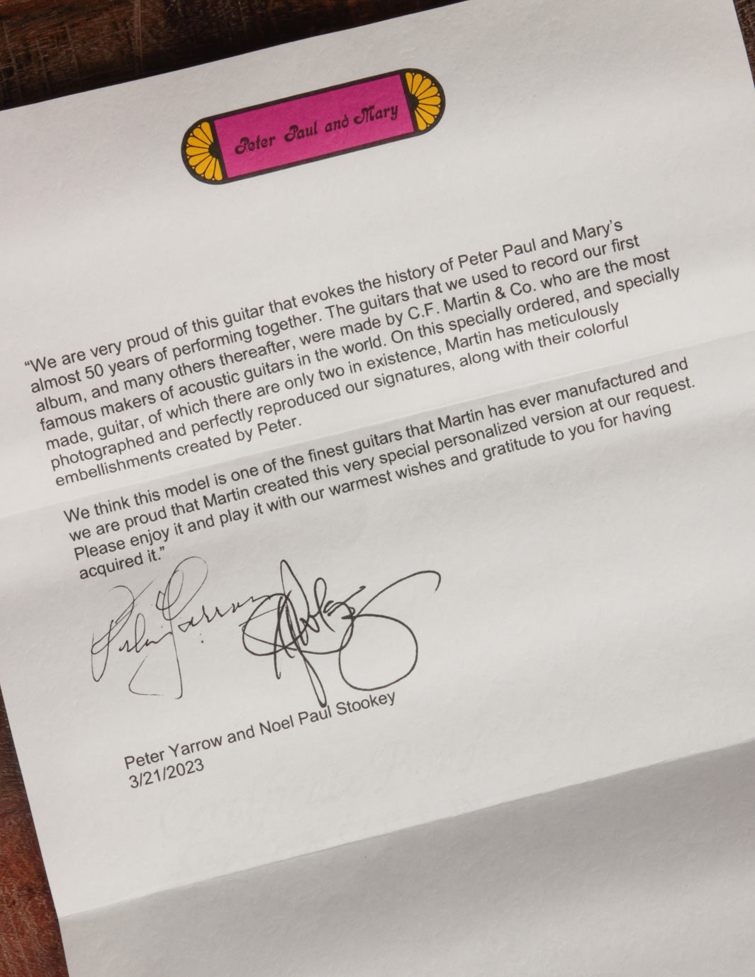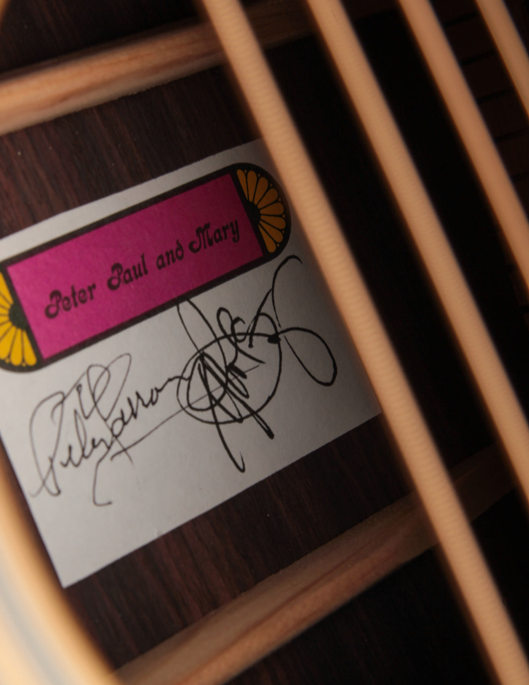 This guitar has been cased and unplayed since 2016 and shows no wear. The gloss finish shows the normal settling and shrinking but otherwise, the guitar is in exceptional condition. Comes with letter of authenticity signed by Peter Yarrow and Noel Paul Stookey.
