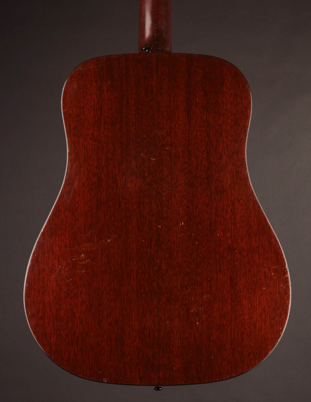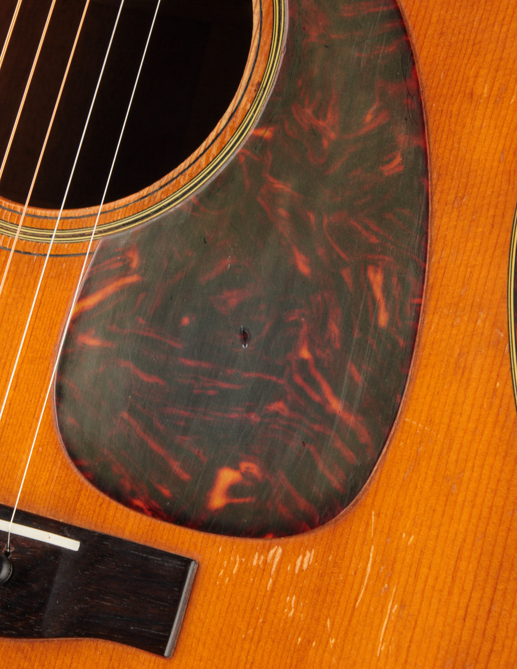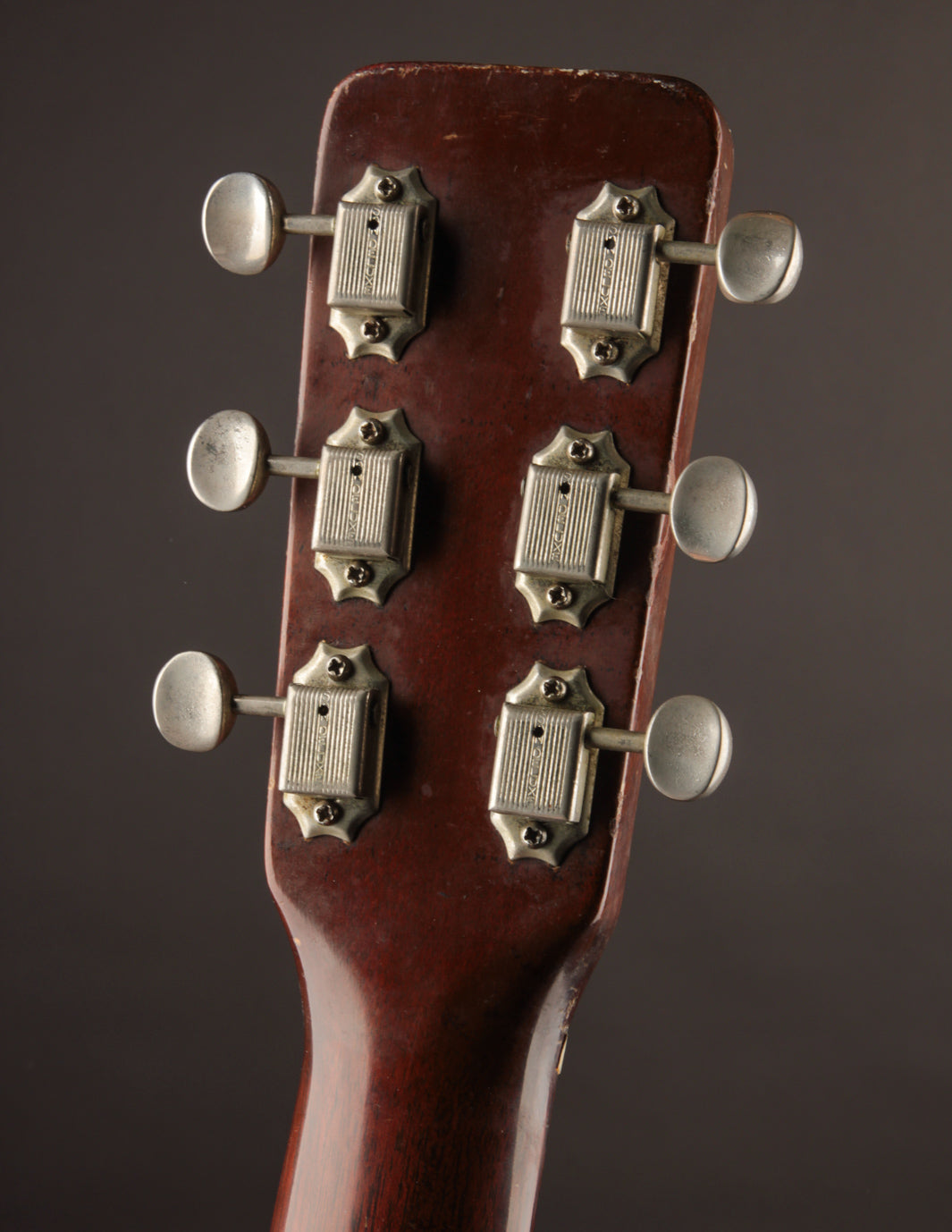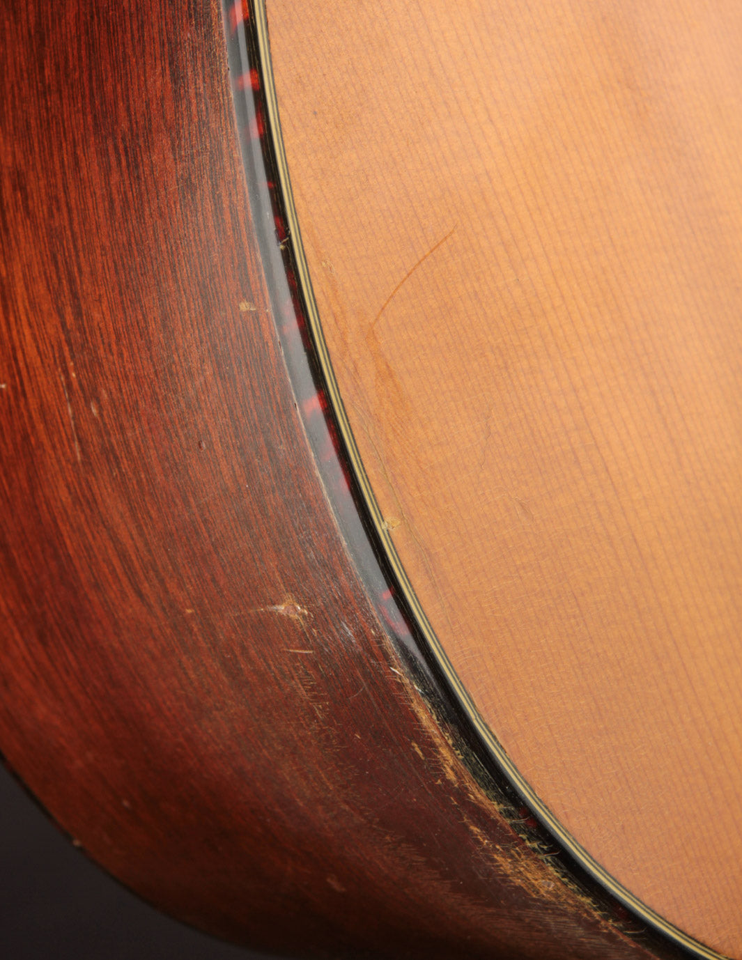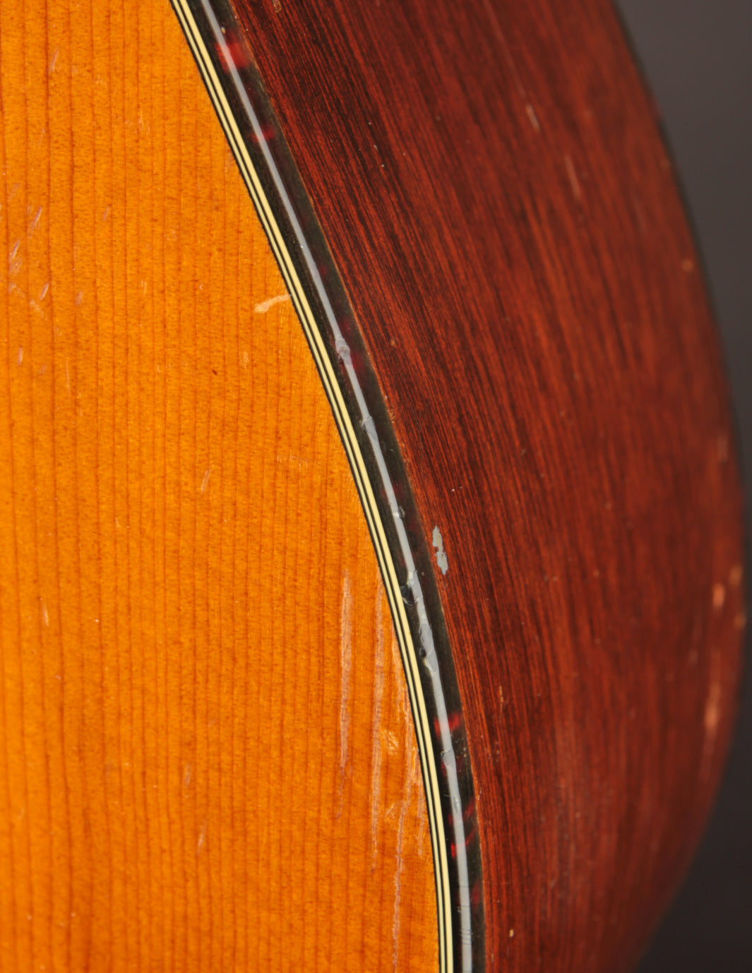 This guitar has one noticeable top crack, which has been glued & cleated internally. There's partial overspray on the top, likely done in conjunction with the crack repair. The original bridge has been reglued at some point in the past; and a clean neck reset has been performed. The tuners are single-line Klusons. Price includes non-original hardshell case.