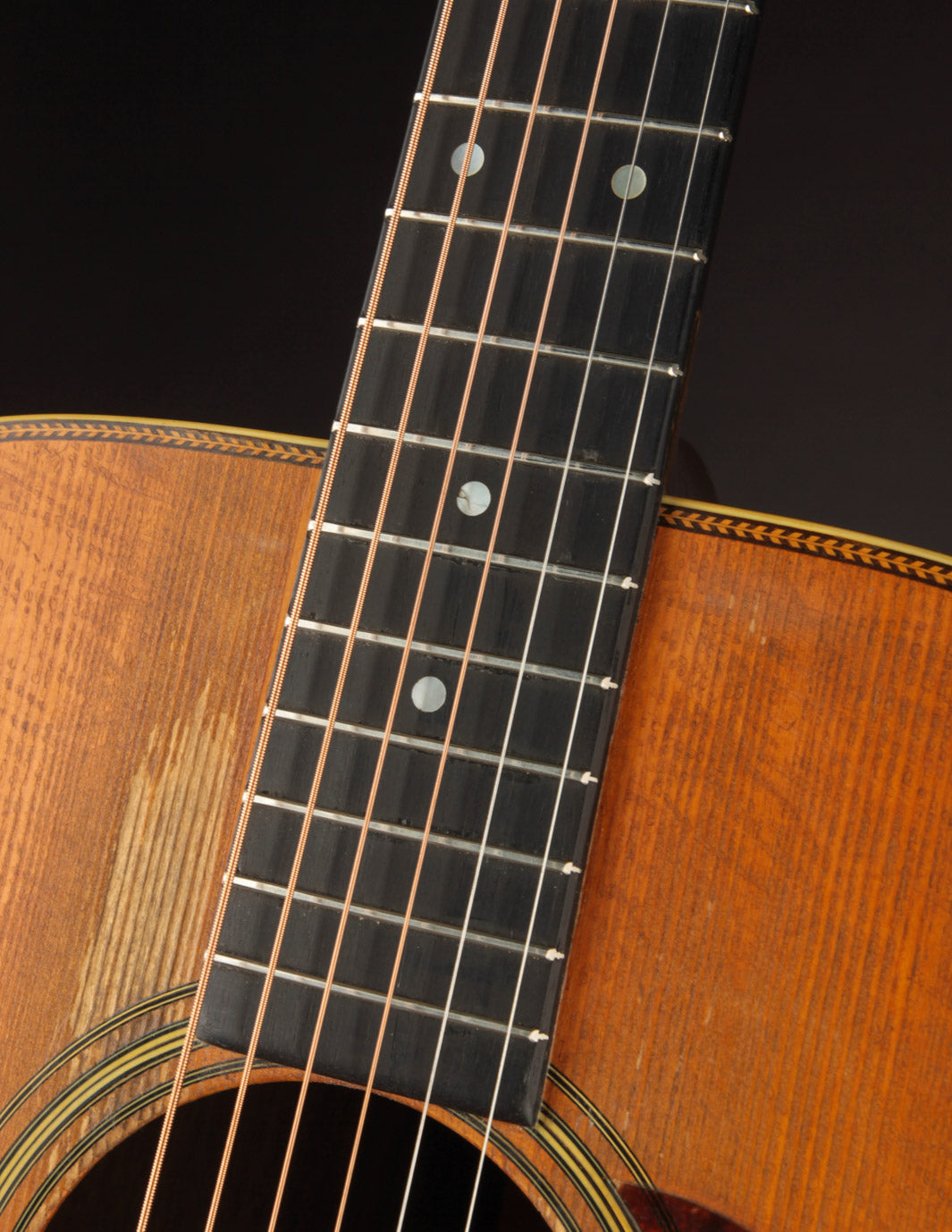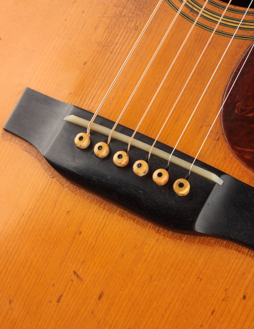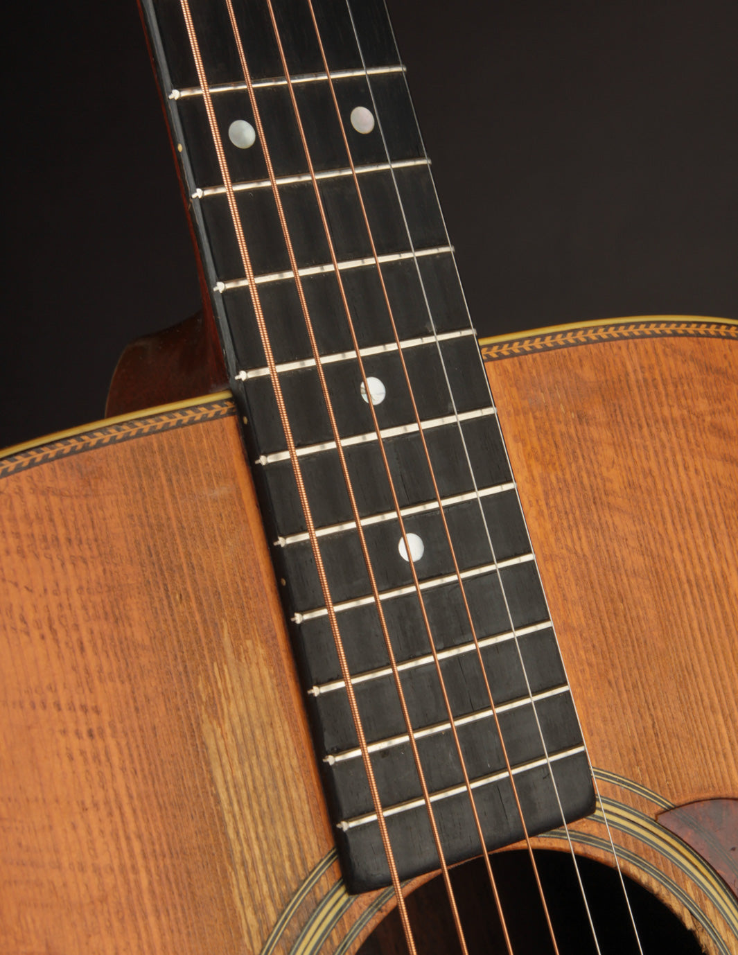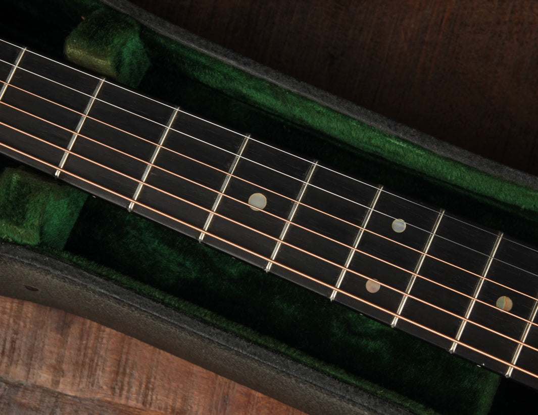As vintage guitars go, we think of this one as being in excellent condition. Our shop has performed a neck reset and refret -- the only non-original parts of the guitar are its new frets, saddle, and one bridge pin. We also reglued the bridge, which was detached when the guitar arrived at our shop, repositioning it slightly forward to correct its imperfect intonation. The guitar shows beautiful playwear across its surfaces, but remains incredibly strong, with a stiff top and neck ready for their next 80 years.