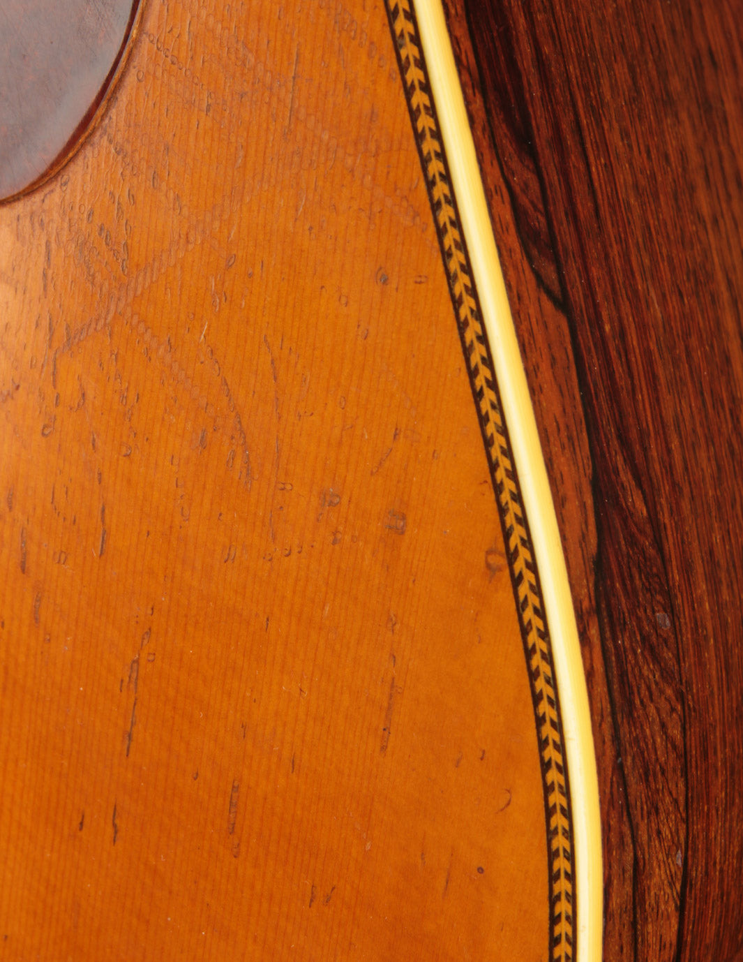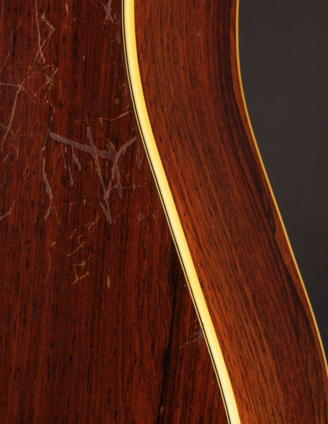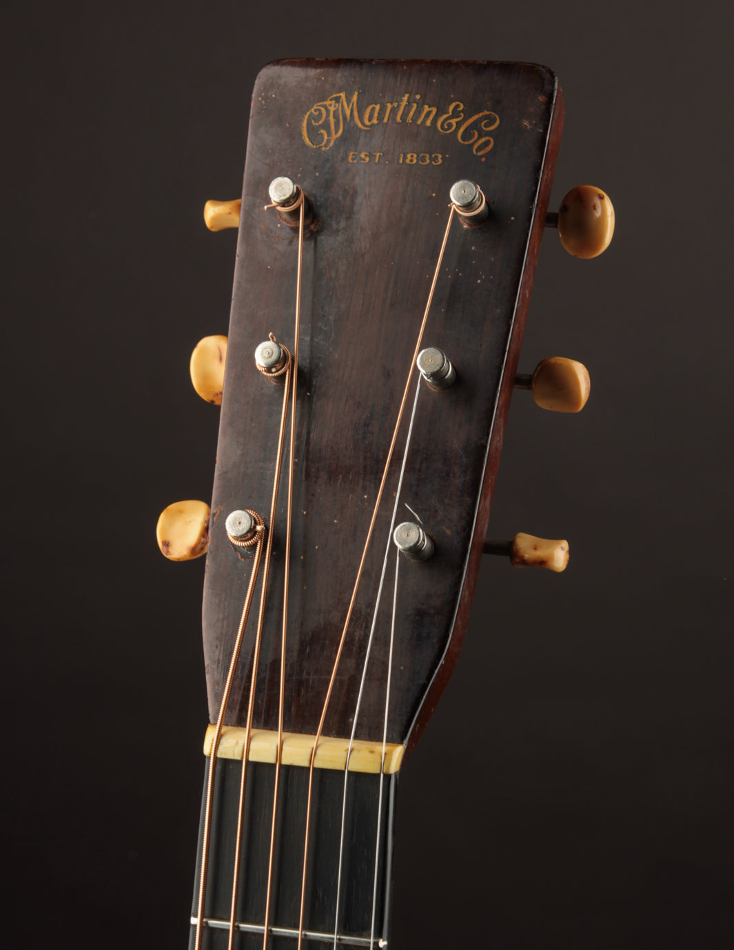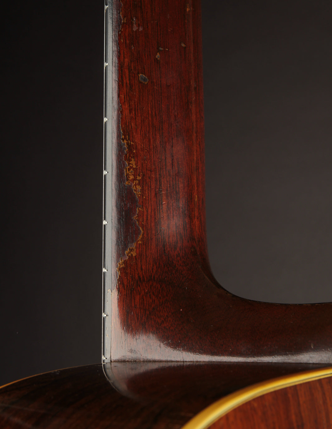 As vintage guitars go, we think of this one as being in excellent condition. Our shop has performed a neck reset and refret -- the only non-original parts of the guitar are its new frets, saddle, and one bridge pin. We also reglued the bridge, which was detached when the guitar arrived at our shop, repositioning it slightly forward to correct its imperfect intonation. The guitar shows beautiful playwear across its surfaces, but remains incredibly strong, with a stiff top and neck ready for their next 80 years.
