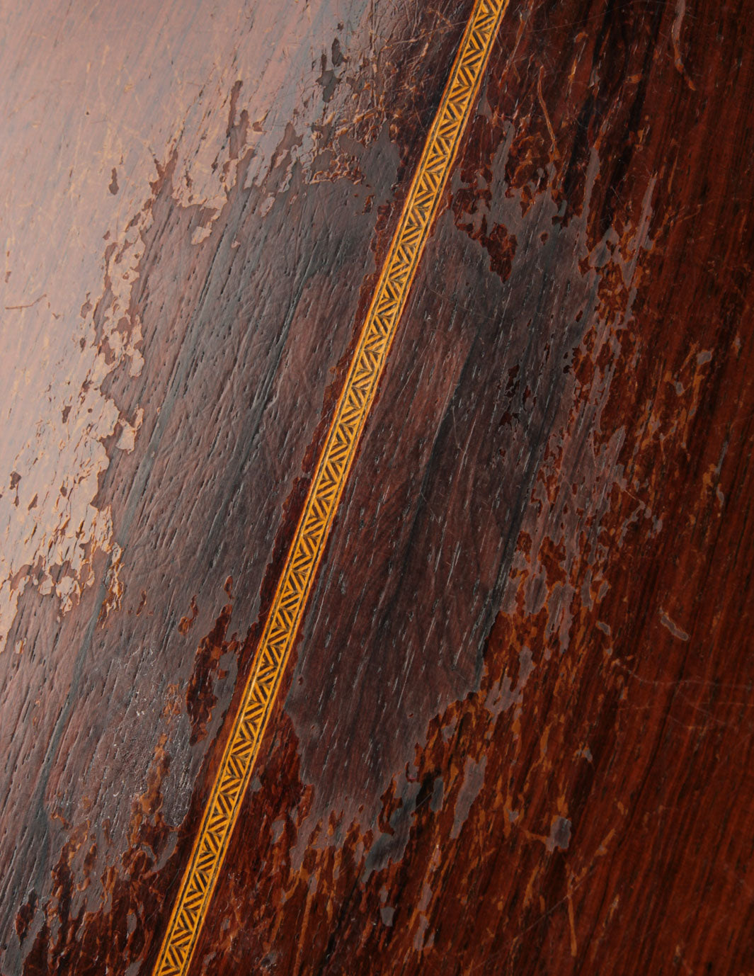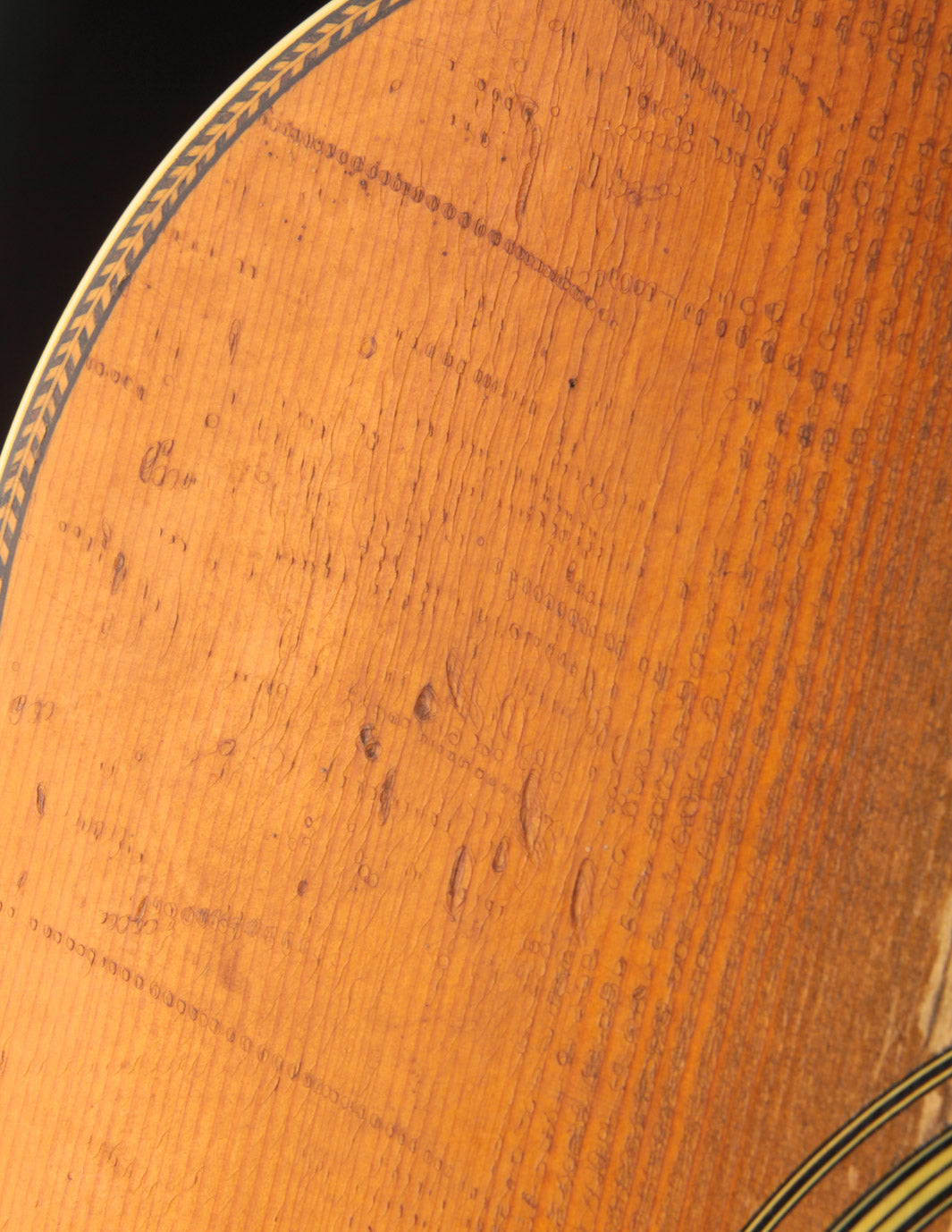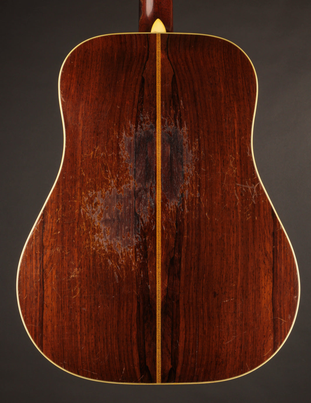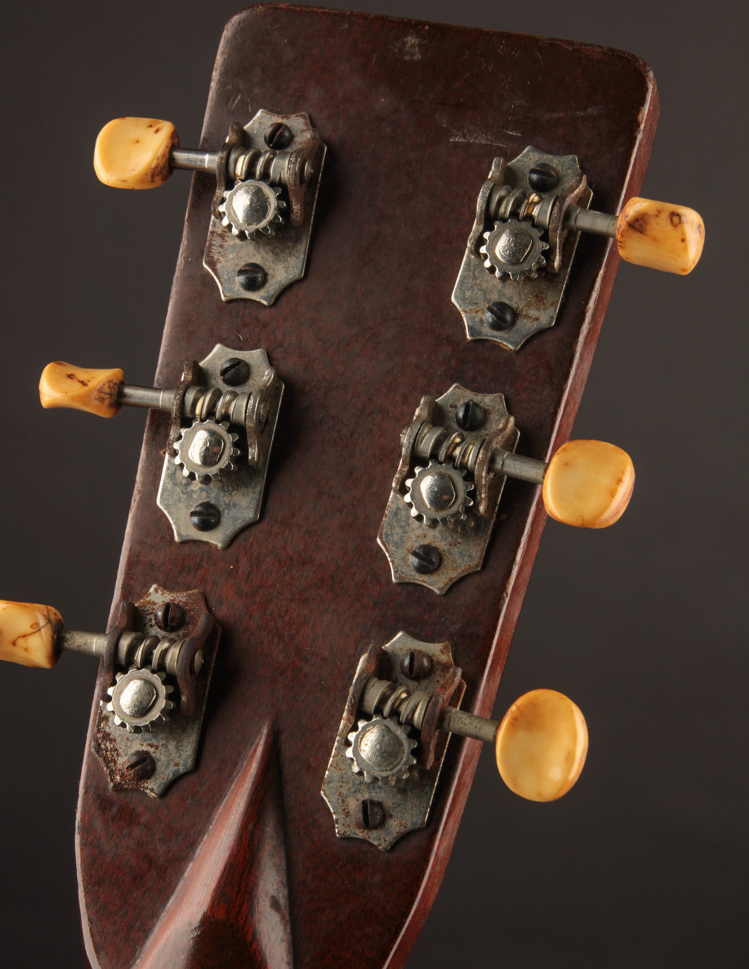 As vintage guitars go, we think of this one as being in excellent condition. Our shop has performed a neck reset and refret -- the only non-original parts of the guitar are its new frets, saddle, and one bridge pin. We also reglued the bridge, which was detached when the guitar arrived at our shop, repositioning it slightly forward to correct its imperfect intonation. The guitar shows beautiful playwear across its surfaces, but remains incredibly strong, with a stiff top and neck ready for their next 80 years.